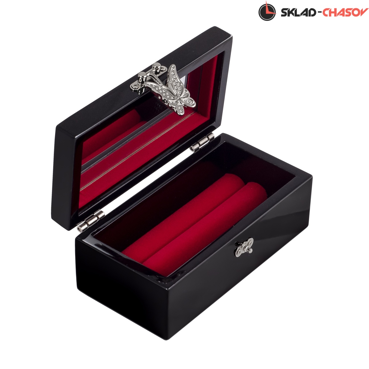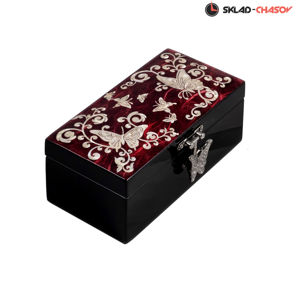 Шкатулка инкрустирована перламутром. Изображение летящих журавлей, символа долголетия в обрамлении сосновых веток, вызывает восхищение красотой. Замочек на крышке шкатулки изготовлен в форме бабочки. На внутренней стороне крышки имеется зеркальце. Предназначена для хранения украшений.