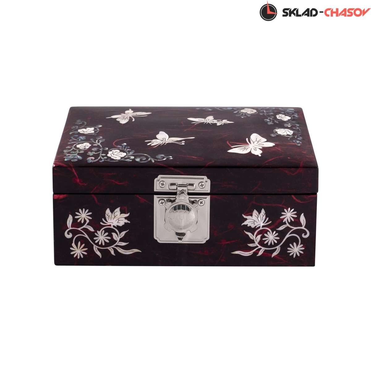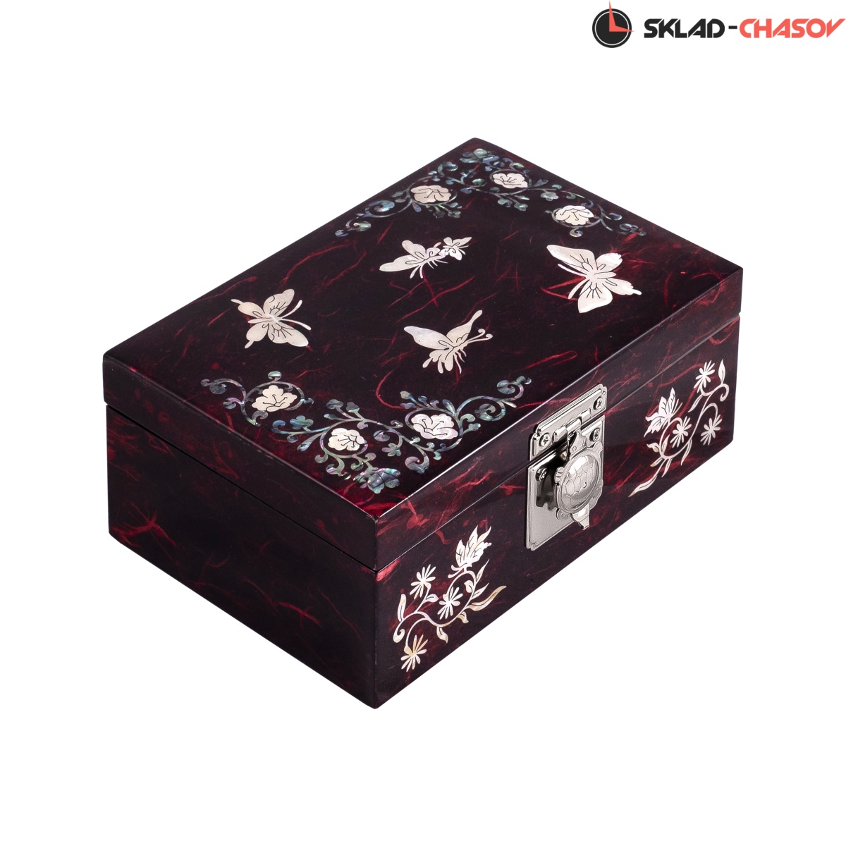 Шкатулочка, инкрустированная перламутром, имеет лаконичную форму. На ней изображены бабочки, символизирующие радость. Замочек изготовлен в форме черепашки. Для изготовления крышки шкатулки используется корейская традиционная бумага "ханджи". Предназначена для хранения украшений.