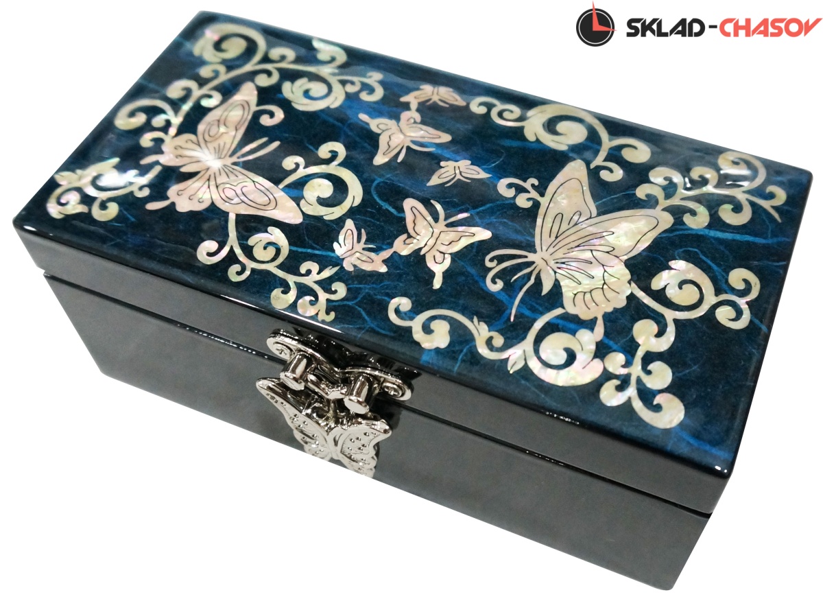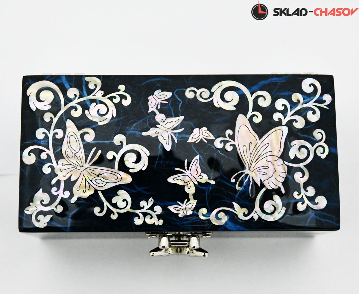 Шкатулка инкрустирована перламутром. Замочек на крышке шкатулки изготовлен в форме бабочки. На внутренней стороне крышки имеется зеркальце. Предназначена для хранения украшений.
