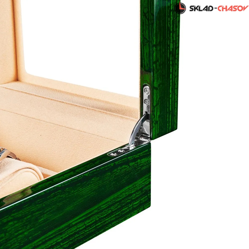 Корпус выполнен в зелёном лакированном дереве "дуб". Прозрачная крышка из стекла позволяет любоваться часами, не открывая шкатулку, а серебристый замок обеспечивает безопасное хранение.
