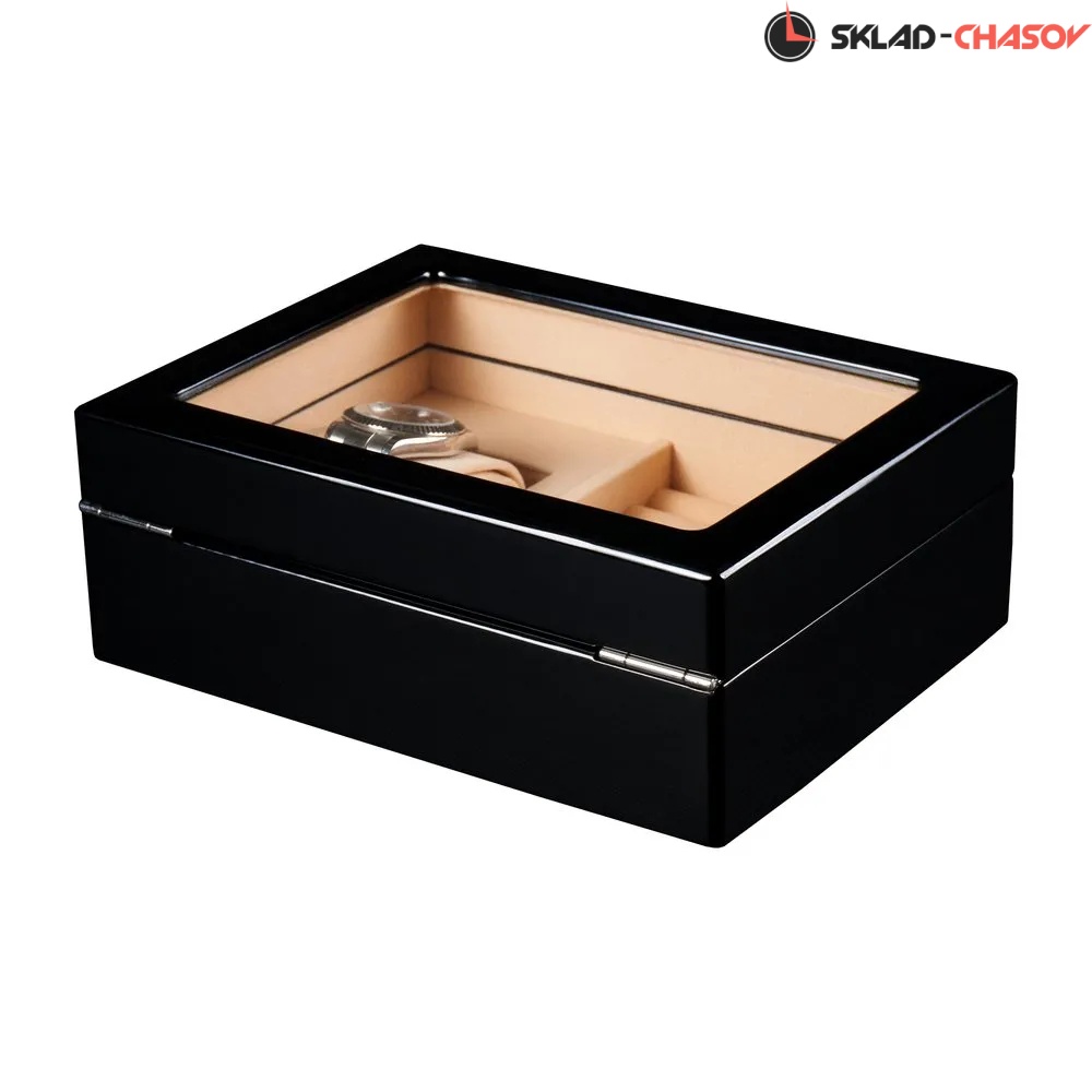 Корпус выполнен из лакированного дерева в насыщенном чёрном цвете с глянцевым покрытием. Прозрачная крышка из стекла позволяет любоваться часами, не открывая шкатулку, а серебристый замок обеспечивает безопасное хранение.