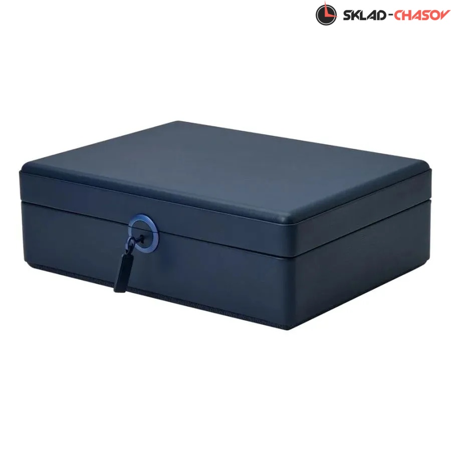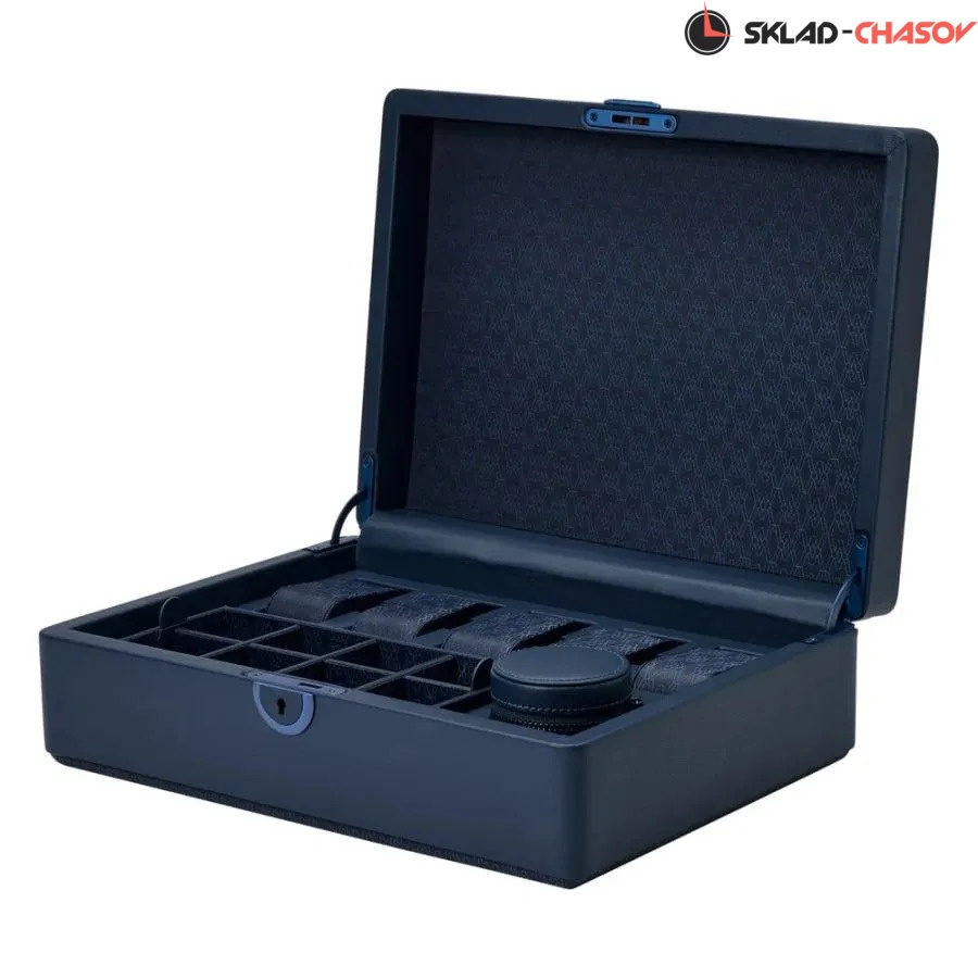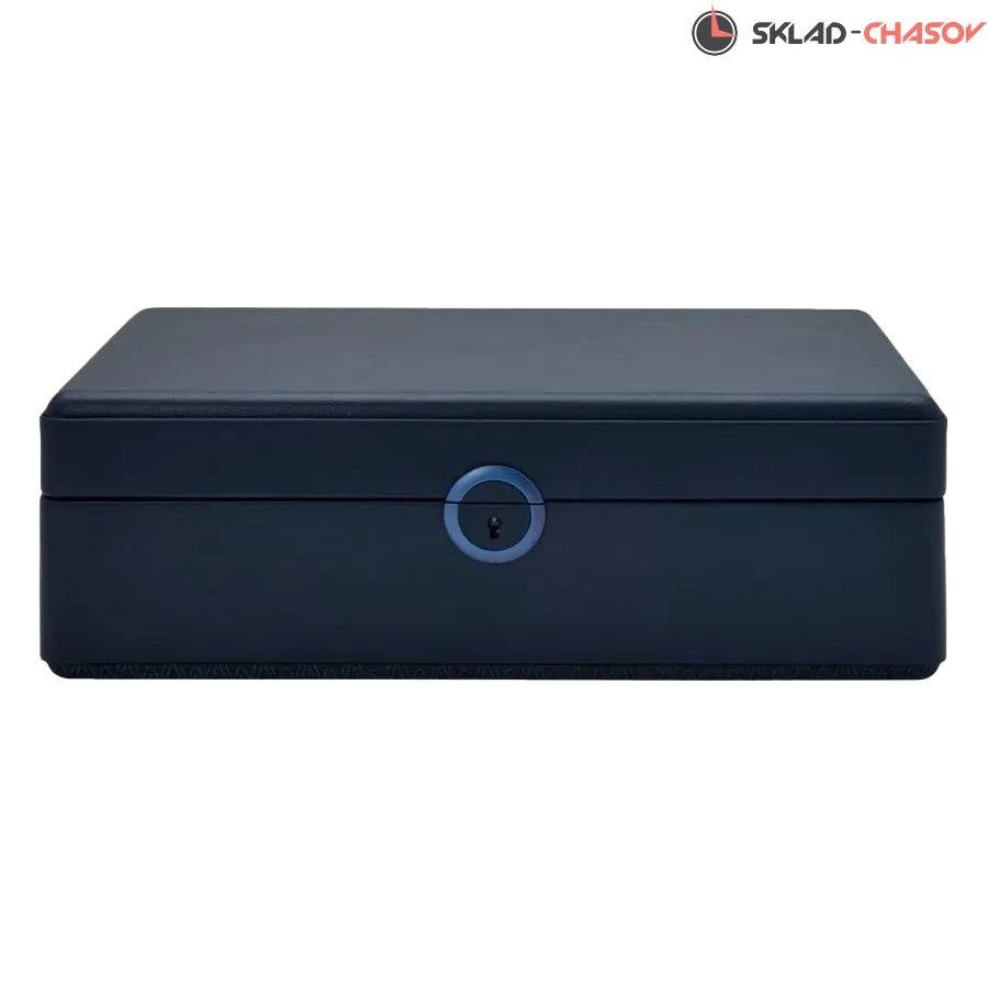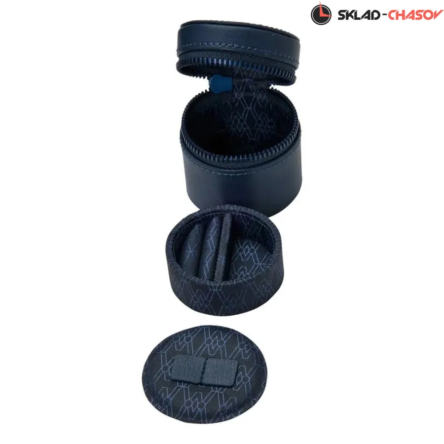 Шкатулки из серии Earth представляют собой изысканное сочетание функциональности, экологичности и современного дизайна. Экстерьер выполнен из мягкой, веган-кожи Apple графитово-синего оттенка, идеально сочетающейся с матовой металлической фурнитурой в синем тоне. Шкатулка закрывается на замок с ключом, обеспечивая надёжную защиту содержимого. Интерьер оформлен переработанным жаккардовым сатином с фирменным узором WOLF, выдержанным в той же тёмной гамме, что и внешний корпус. Шкатулка вмещает 5 парящих подушек, которые аккуратно удерживают часы, предотвращая контакт браслетов с основанием и защищая их от деформации. В центральной части расположен съёмный аксессуарный лоток с несколькими секциями для хранения украшений, запонок и ценных мелочей. Также в комплект входит круглый дорожный кейс на молнии, предназначенный для безопасного хранения часов или аксессуаров в поездке. Каждая деталь изделия выполнена вручную с использованием экологически чистых материалов. Шкатулка поставляется в подарочной коробке, разработанной специально к 190-летию бренда WOLF — бренда, который славится ручной работой, вниманием к деталям и экологически чистыми материалами.