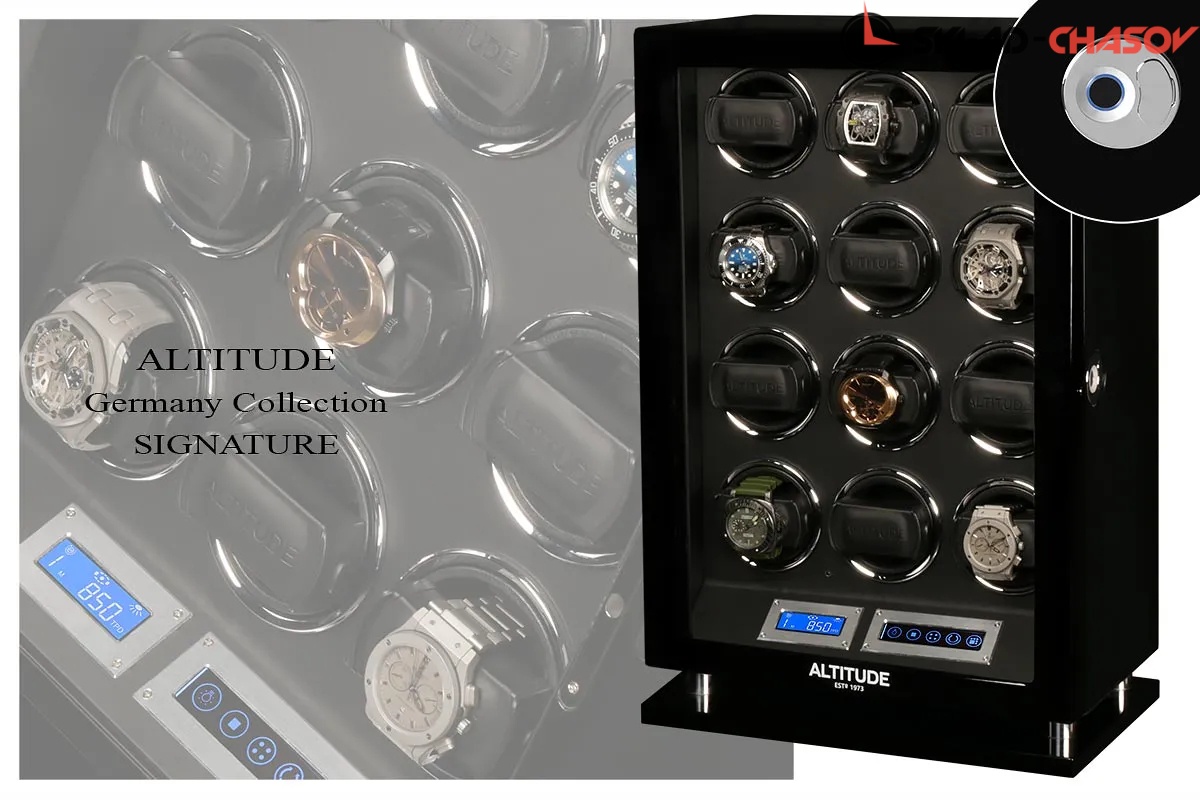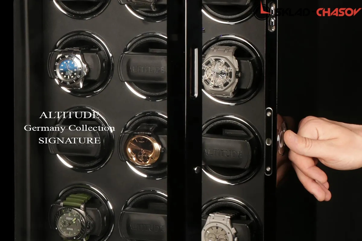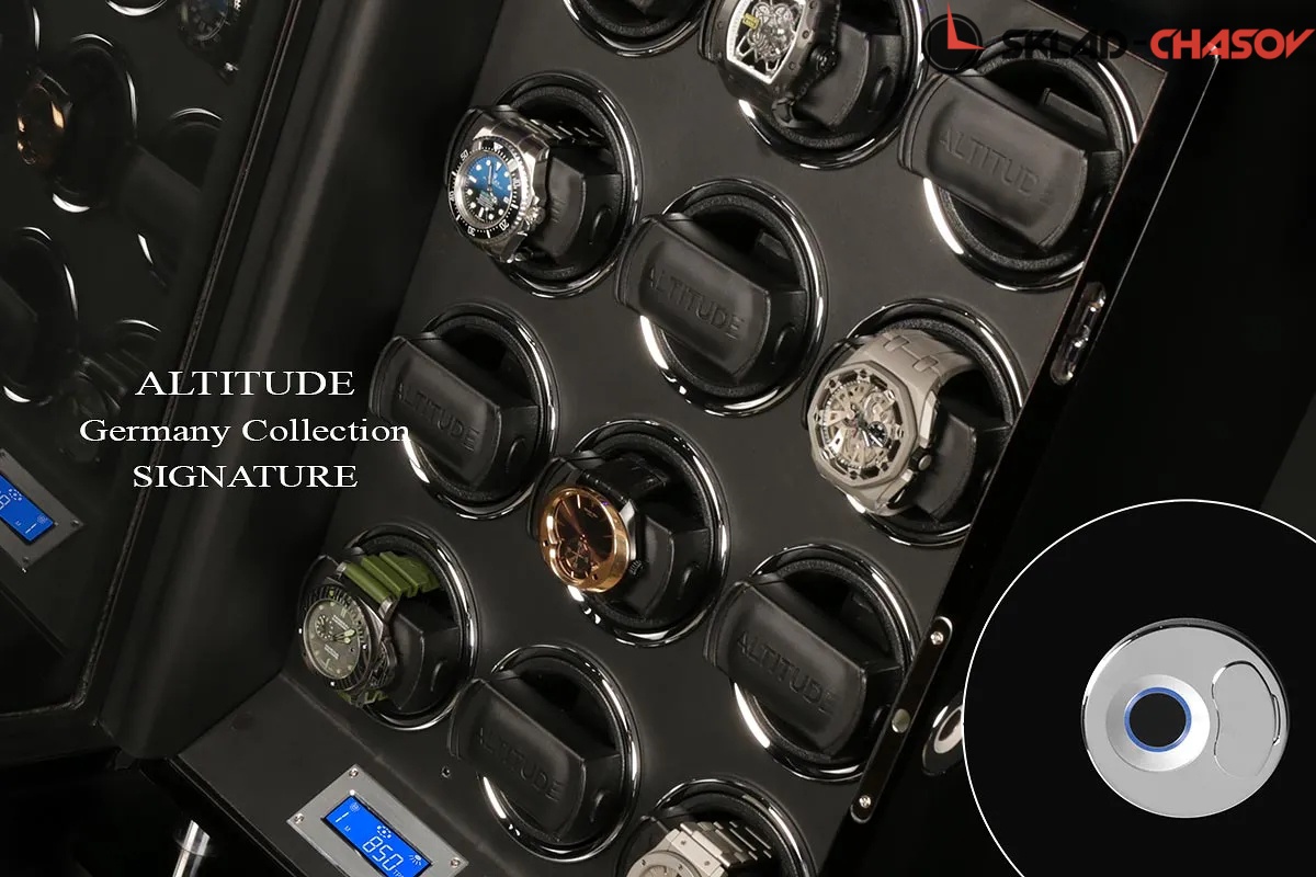 Новая серия шкатулок "Signature“ с отпечатком пальца по очень привлекательным ценам для наших дорогих клиентов, независимый подзавод 12 часов, удобно и просто настроить и пользоваться этим инновационным решением от немецких дизайнеров (настроить можно много отпечатков), чёрное дерево венге покрыто лаком, внутри выстлано чёрной кожей, два дисплея тачскрин позволяют выставить любое направление вращения механизма, а также количество оборотов в сутки 650/750/850/1000/1950. Включение и выключение светодиодной подсветки на дисплеи. Подзавод 12 часов. Удобные телескопические держатели идеально подходят для больших и любых запястьев. Фирменная гарантия 1 год.