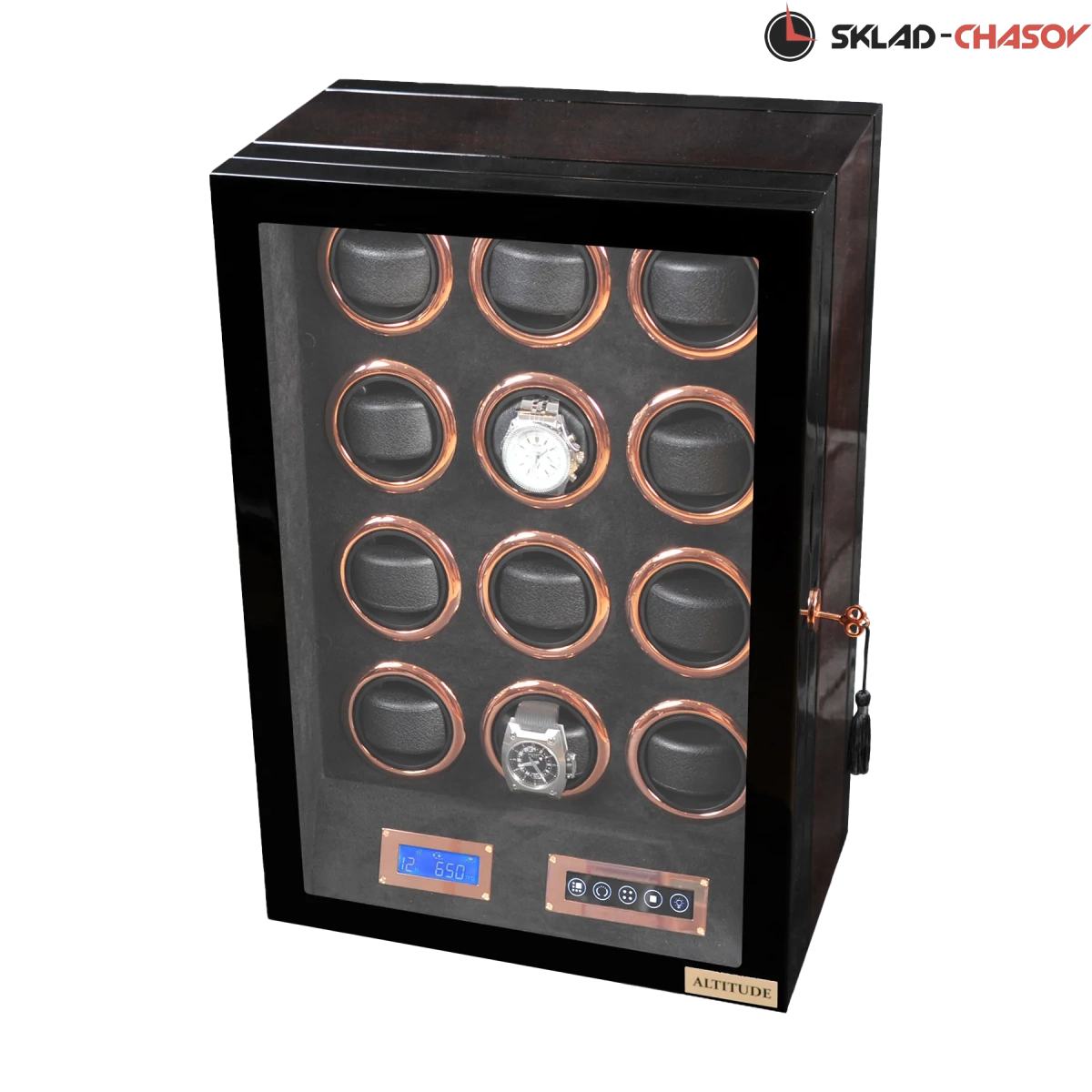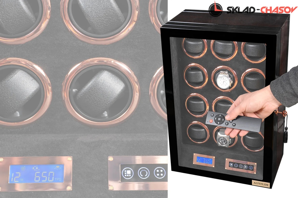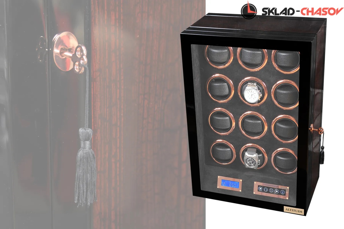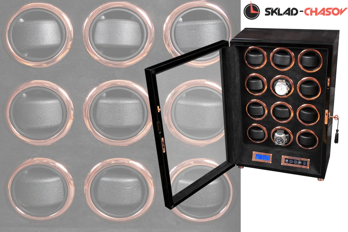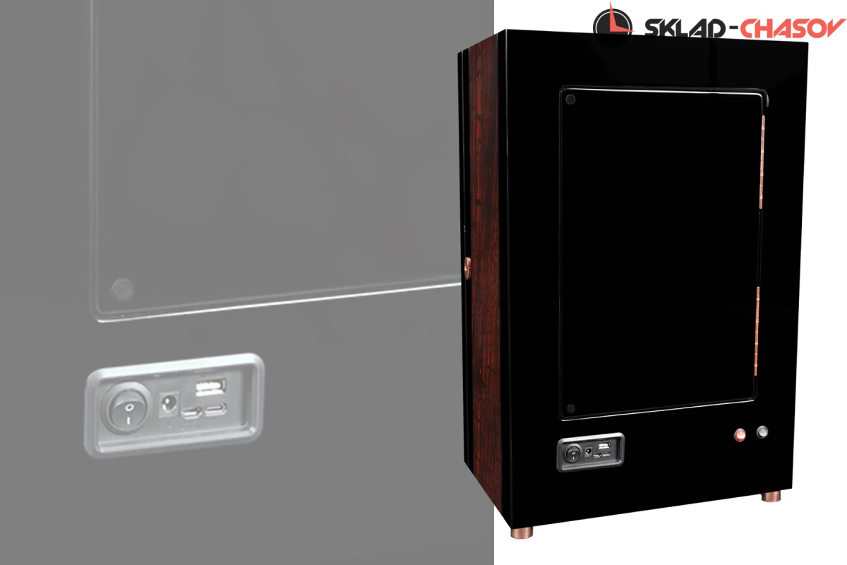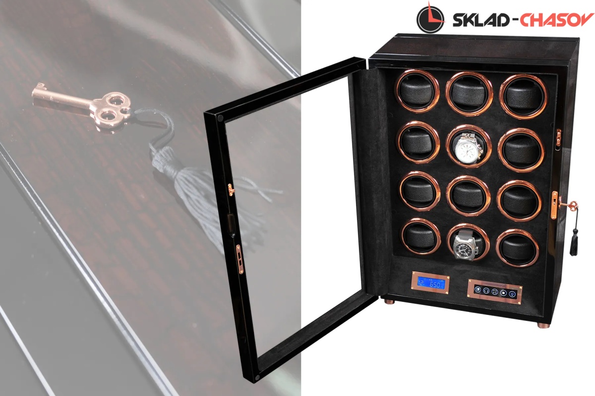 Новая модель “Vector12”. Шкатулка выполнена из чёрного дерева венге в сочетании с деревом макасар. Внутри выстлана чёрной кожей. Электронное табло позволяет подзаводить любые часы. Закрывается на ключик. Мягкие подушечки для часов.