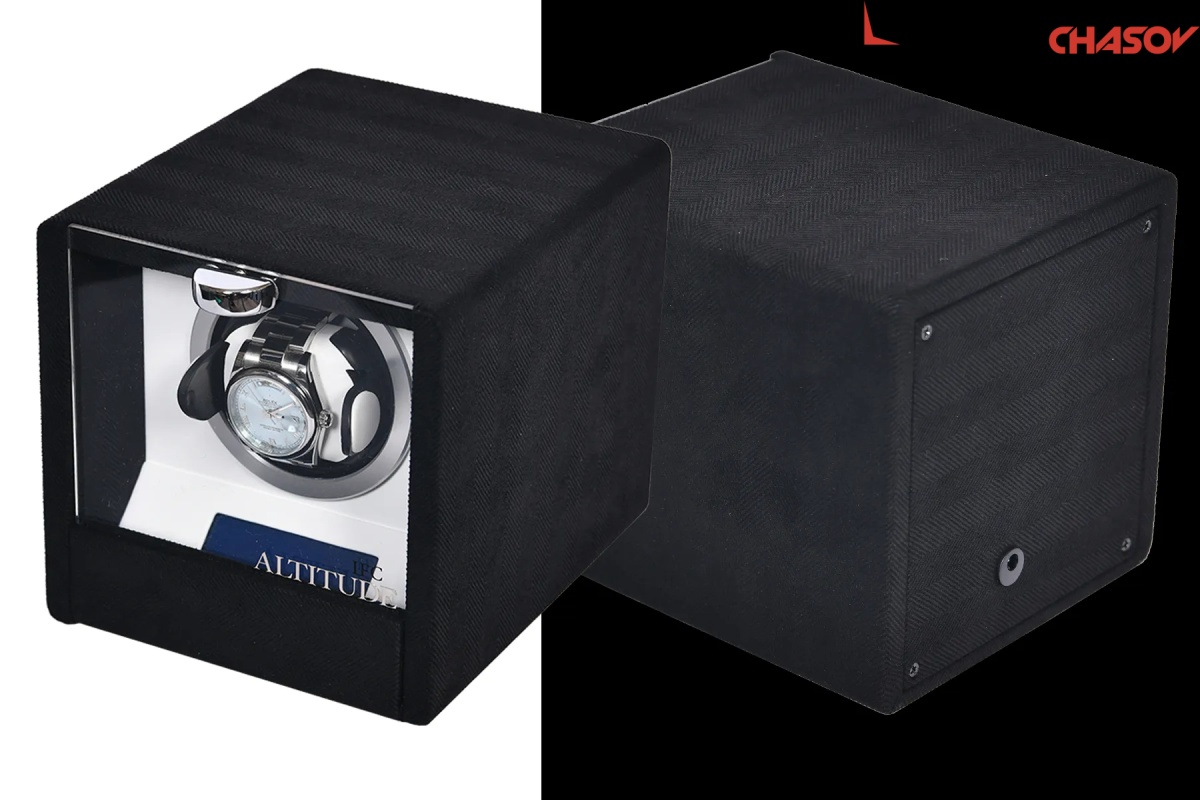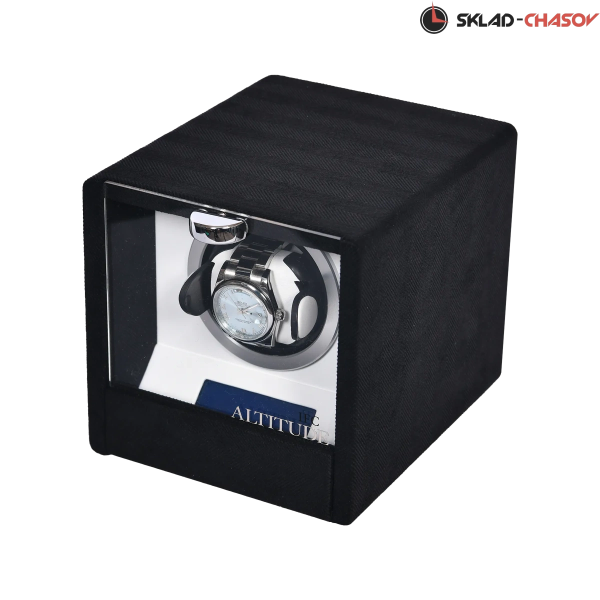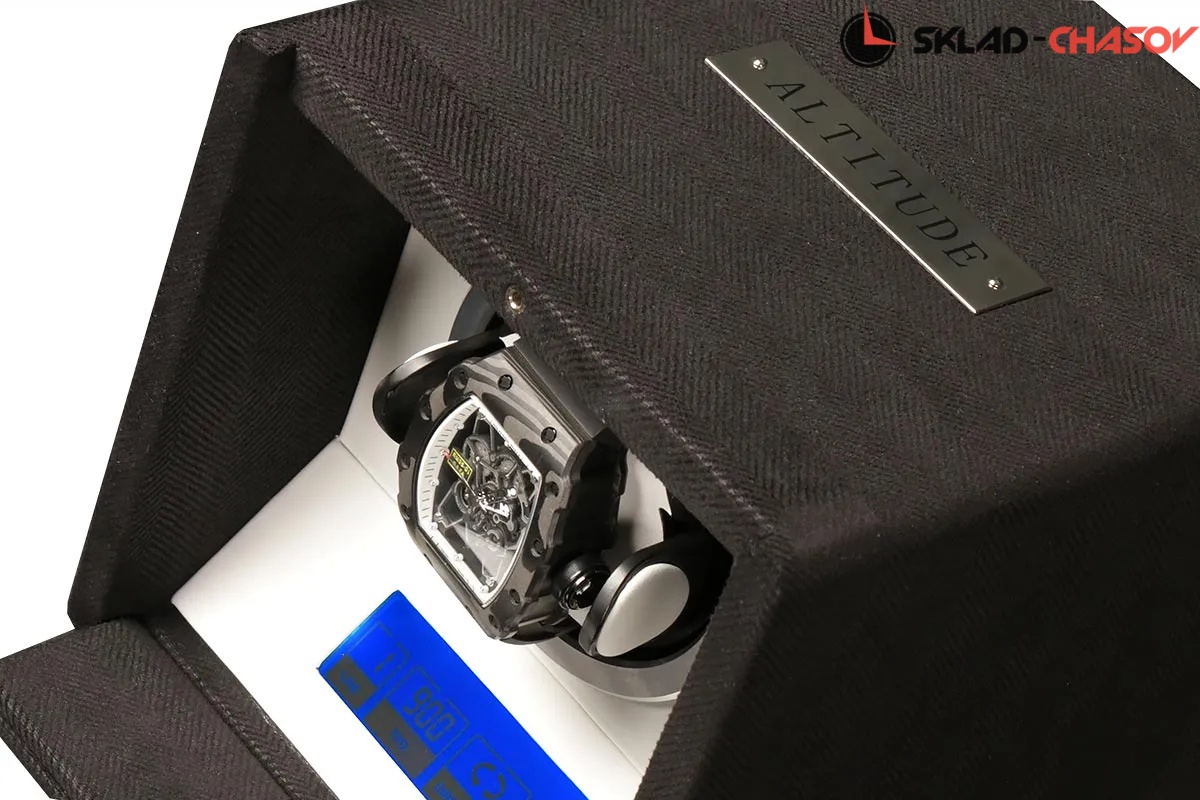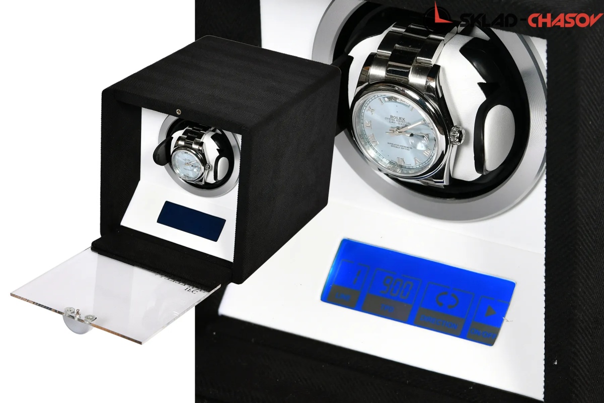 Новая модель от немецкой компании выполнена в современном духе, корпус дерево обшитый чёрной, стильной тканью (легко чиститься), внутри отделка светлой кожей, удобные телескопические держатели, закрывается стеклышком, ободок вокруг держателя выполнен из хрома, регулируются все варианты подзавода с помощью электронного табло.