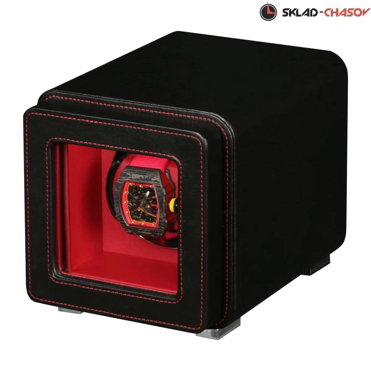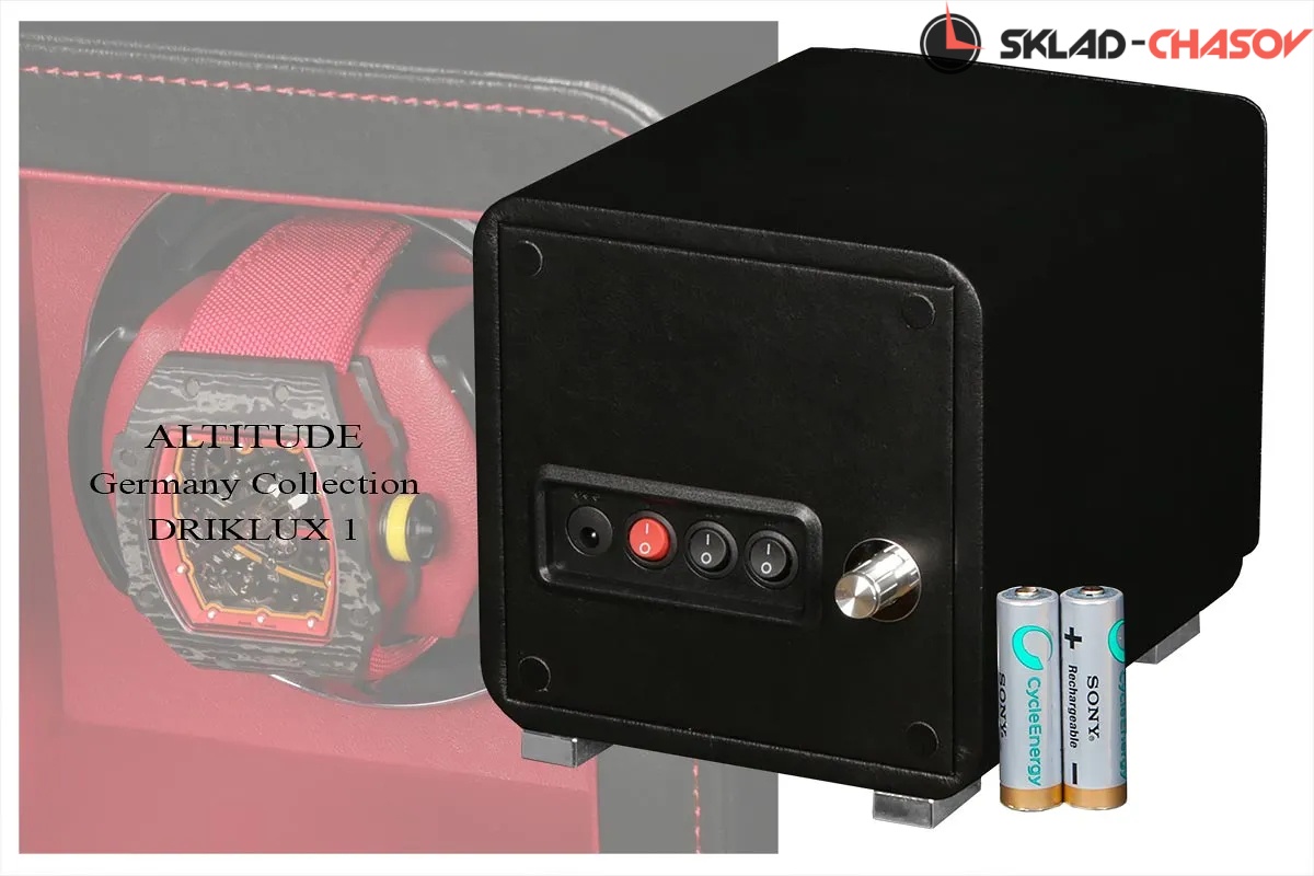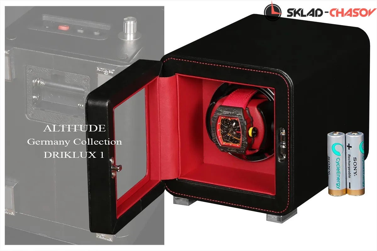 Новая серия шкатулок "Driklux” от немецкого производителя Altitude выполнена из чёрной кожи с красной строчкой, внутри прошито красной кожей с телескопическими держателями, работает от сети 220 вольт или двух батареек. Светодиодная подсветка, металлизированные фирменные ножки, система автостоп при открытии дверцы.