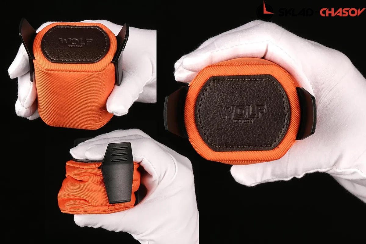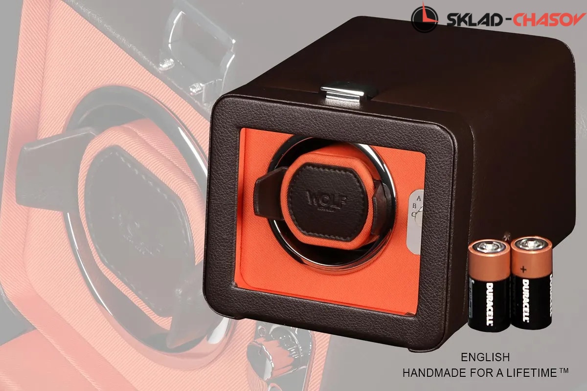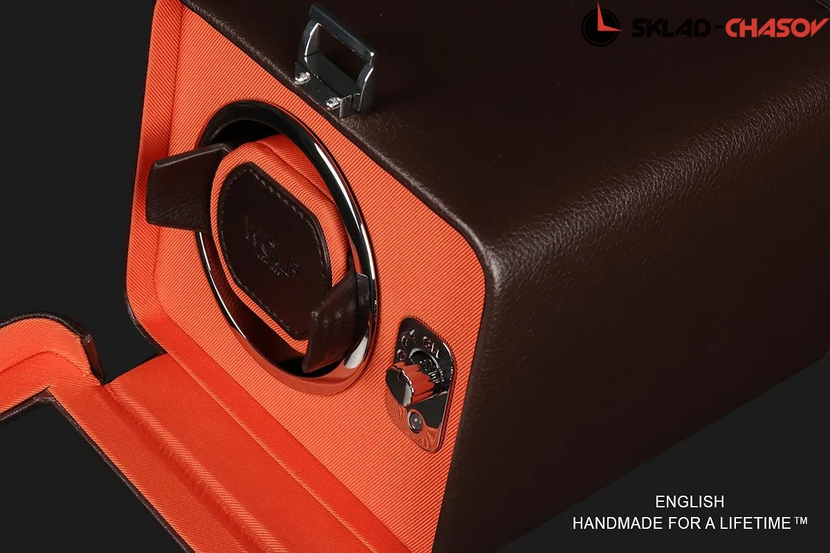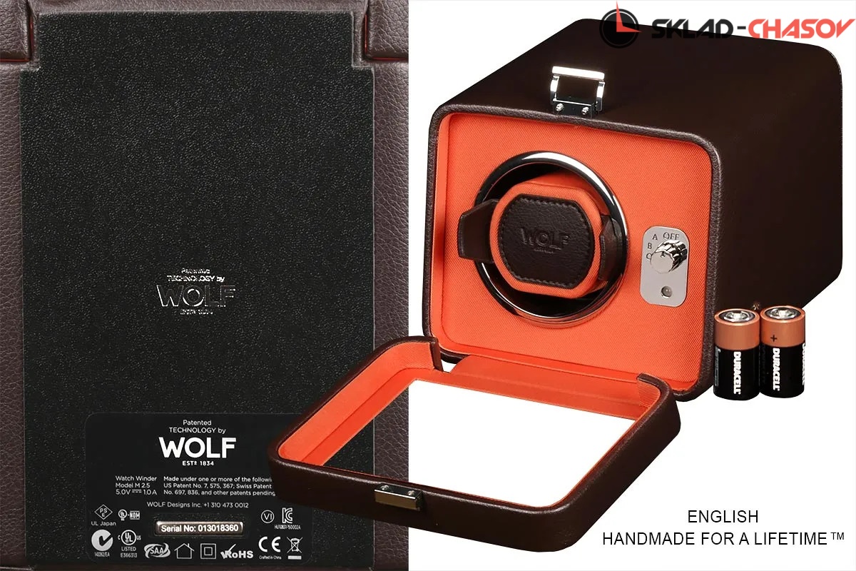 Шкатулка от известного английского бренда "Wolf design" не оставит равнодушным презентабельных и успешных людей, так как выполнена в ручную лучшими мастерами. Корпус шкатулки выполнен из коричневой кожи, внутри качественная шёлковая отделка оранжевого цвета. Подзавод для 1 часов. Доступ к часам при открывании крышки с фиксатором, удобный современный держатель. Каждая шкатулка со своим серийным номером. Работает от сети и от 2 батареек класса "D". Регулируется 3 направления вращения при кол-ве оборотов в сутки 900. Отложенный старт механизма 10 секунд. Гарантия 12 мес. Фирменная подарочная чёрная коробка.