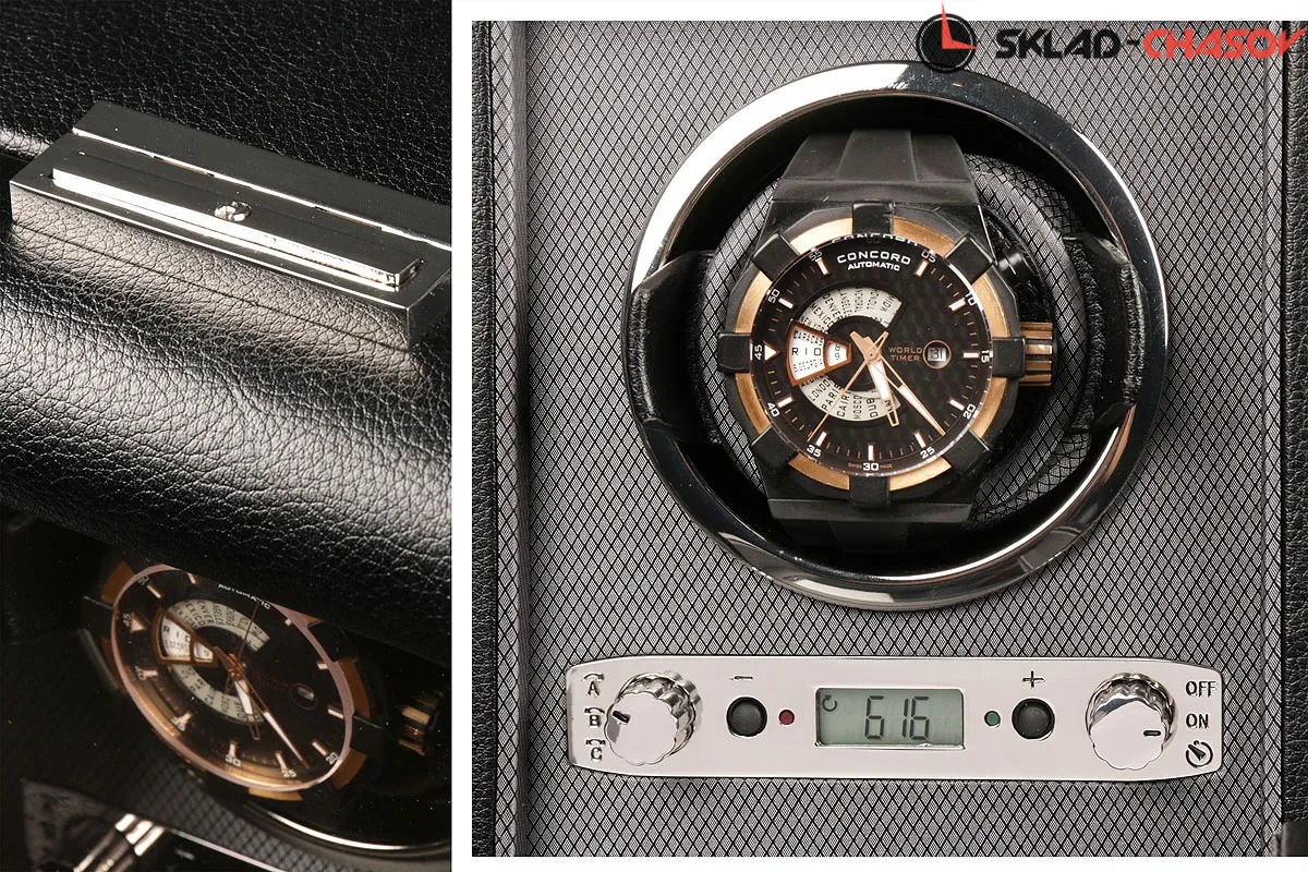 Модель "Wiceroy1". Шкатулка от известного английского и старинного бренда "Wolf design" не оставит равнодушным презентабельных и успешных людей, так как выполнена в ручную лучшими мастерами. Корпус из черной кожи, внутри отделка износостойким шёлком. Открытый доступ к вашим часам, удобный современный держатель для ваших любимых часов с фиксацией. Каждая шкатулка со своим серийным номером. Работает от сети и от 2 батареек класса "D". Регулируется 3 направления вращения при кол-ве оборотов от 300 до 1200 в сутки. Возможность фиксации на ключик. Отложенный старт механизма 10 секунд. Гарантия 18 мес. Фирменная подарочная чёрная коробка. Удобные классические держатели для наручных часов с логотипом WOLF. Корпус из черной кожи, внутри отделка износостойким шёлком.
