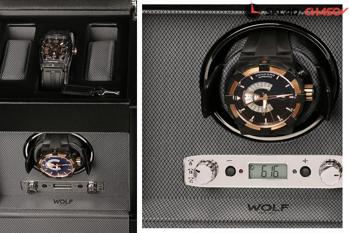 Модель "Viceroy1". Шкатулка от известного английского и старинного бренда "Wolf design" не оставит равнодушным презентабельных и успешных людей, так как выполнена в ручную лучшими мастерами. Корпус из черной кожи, внутри отделка износостойким шёлком. Подзавод одних часов любой сложности, а также хранения трёх наручных часов, современный держатель для ваших любимых часов с фиксацией. Каждая шкатулка со своим серийным номером. Работает от сети и от 2 батареек класса "D". Регулируется 3 направления вращения при кол-ве оборотов от 300 до 1200 в сутки. Возможность фиксации на ключик. Отложенный старт механизма 10 секунд. Гарантия 12 мес. Фирменная подарочная чёрная коробка. Удобный современный держатель для ваших часов с логотипом WOLF. Мягкая подушка черного цвета.