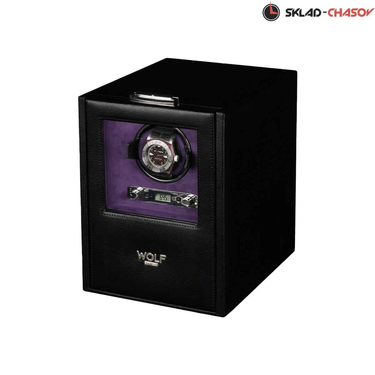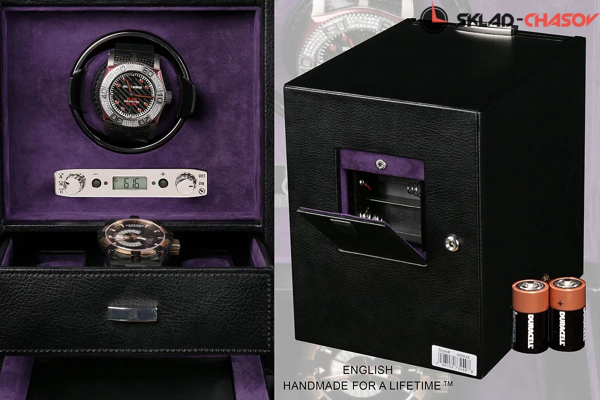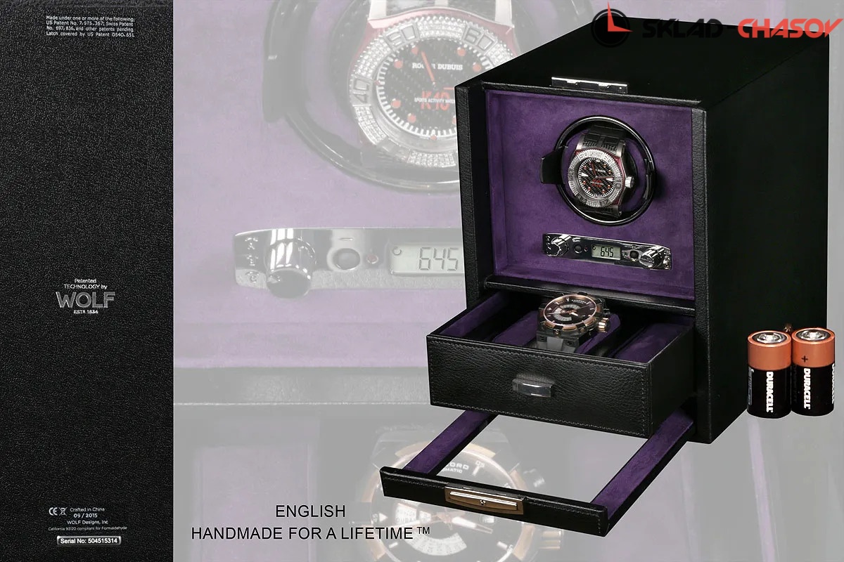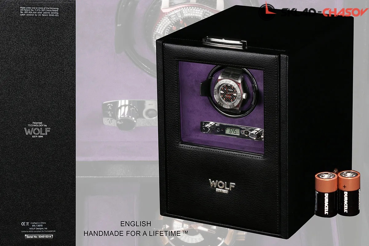Шкатулка от широко известного старинного английского бренда "Wolf design" выполнена вручную лучшими мастерами. Корпус изготовлен из натурального дерева. Внутренняя отделка - износостойкий шёлк. Независимый подзавод одних часов любой сложности. Удобный современный держатель для ваших любимых часов с фиксацией. Каждая шкатулка со своим серийным номером. Регулируется 3 направления вращения при кол-ве оборотов от 300 до 1200 в сутки. Возможность фиксации на ключик. Отложенный старт механизма 10 секунд. Гарантия 18 мес. Фирменная подарочная чёрная коробка. Удобные фирменные держатели для часов с логотипом WOLF. Внутренняя отделка - износостойкий шёлк. Мягкая подушка фиолетового цвета.