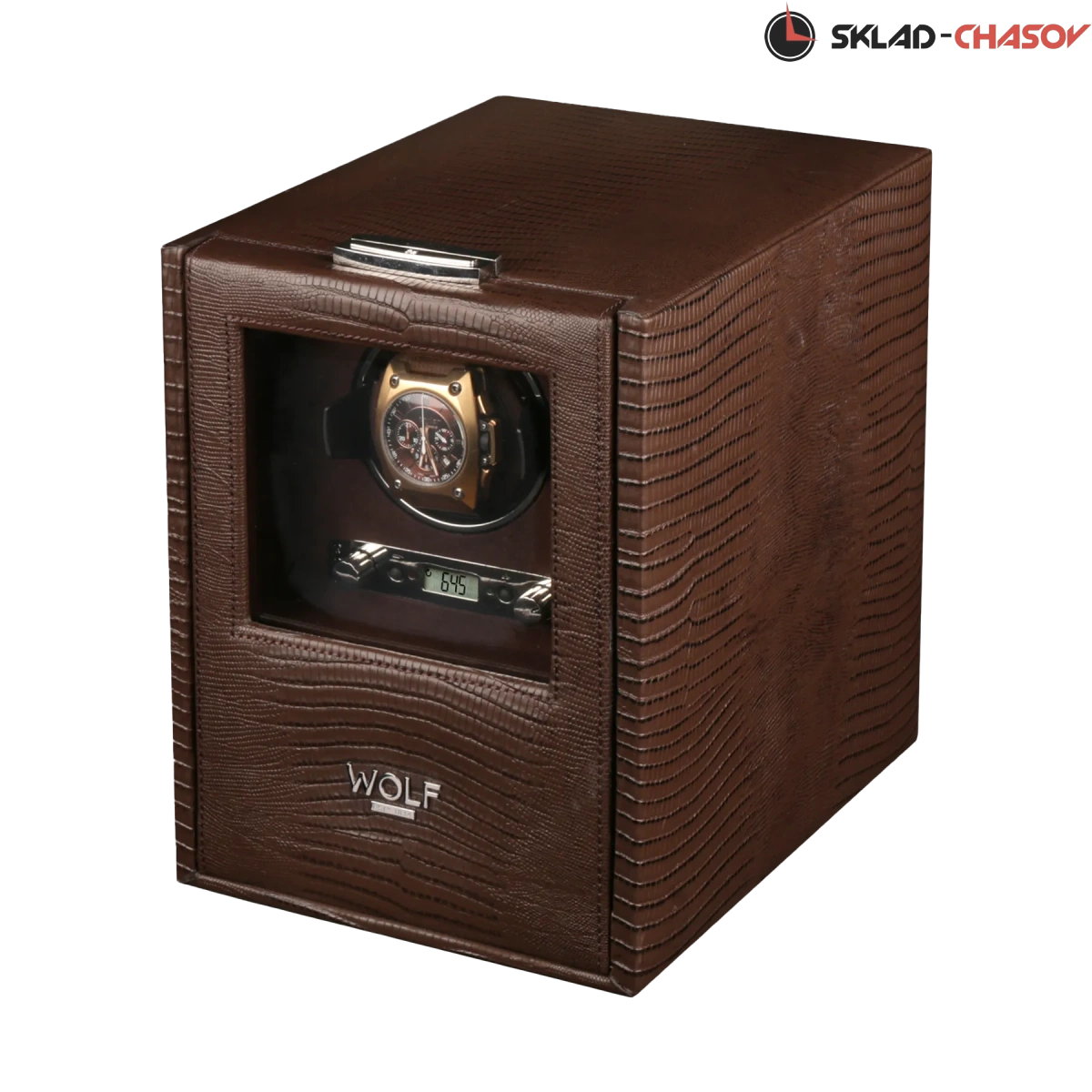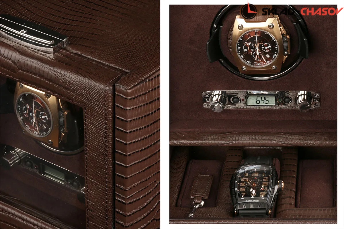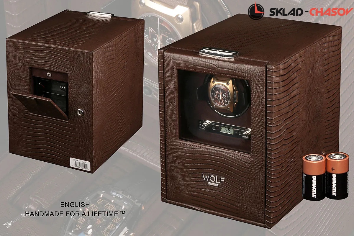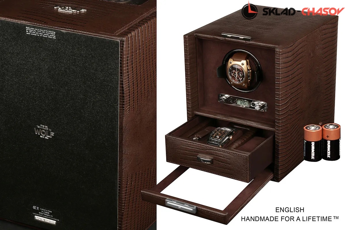 Модель "Blake Single1". Шкатулка от известного английского и старинного бренда "Wolf design" не оставит равнодушным презентабельных и успешных людей, так как выполнена в ручную лучшими мастерами. Корпус из коричневой кожи под "питона", внутри отделка износостойкой замшей в тон шкатулки. Подзавод одних часов любой сложности, а также хранения 3 наручных часов и свободным отделением, удобный современный держатель для ваших любимых часов с фиксацией. Внешняя дверца с возможностью закрытия на ключик, а также при желании она прячется в корпус. Каждая шкатулка со своим серийным номером. Работает от сети и от 2 батареек класса "D". Регулируется 3 направления вращения при кол-ве оборотов от 300 до 1200 в сутки. "Подзаводит любые часы-любой сложности". Возможность фиксации на ключик. Отложенный старт механизма 10 секунд. Гарантия 18 мес. Фирменная подарочная чёрная коробка. Удобные классические держатели для наручных часов с логотипом WOLF. Корпус из коричневой кожи под "питона", внутри отделка износостойкой замшей в тон шкатулки.