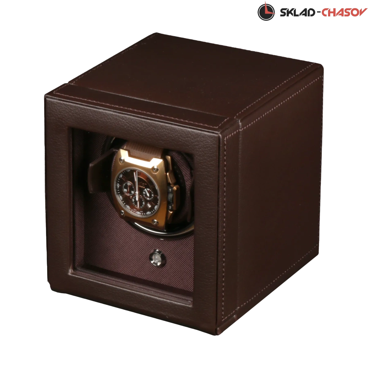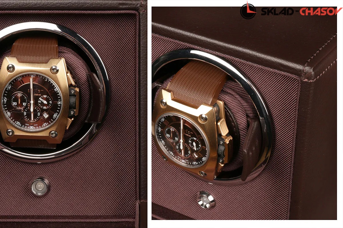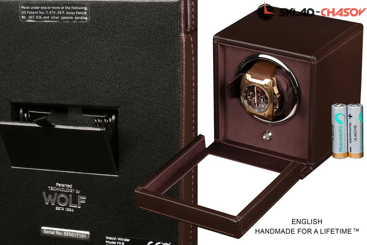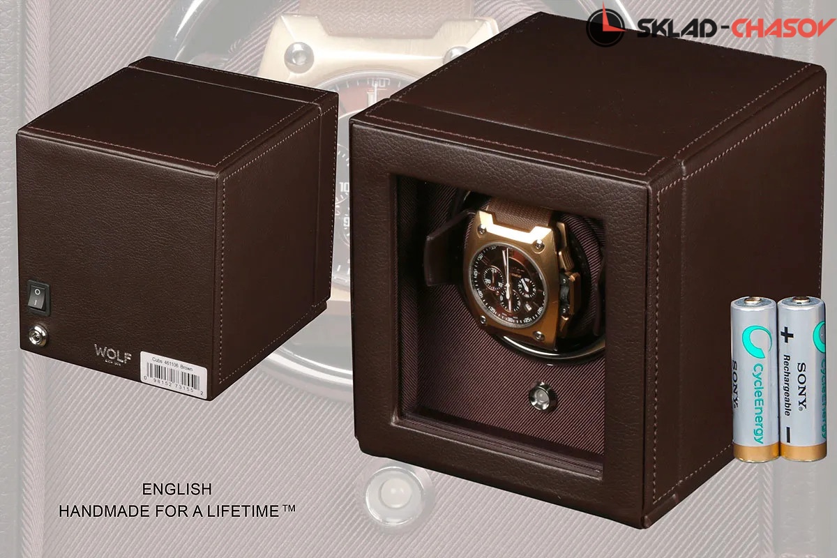 Модель "Cube Cover1". Шкатулка от известного английского и старинного бренда "Wolf" не оставит равнодушным презентабельных и успешных людей, так как выполнена в ручную лучшими мастерами. Корпус из кожи темно-коричневого цвета, внутри отделка износостойким шелком. Открытый доступ к вашим часам, удобный современный держатель для ваших любимых часов с фиксацией. Каждая шкатулка со своим серийным номером. Работает от сети и от 2 батареек класса "AA". Регулируется направления вращения попеременно при кол-ве оборотов в сутки 900. Отложенный старт механизма 10 секунд. Гарантия 18 мес. Фирменная подарочная чёрная коробка. Удобные классические держатели для наручных часов с логотипом WOLF. Корпус из кожи темно-коричневого цвета, внутри отделка износостойким шелком.