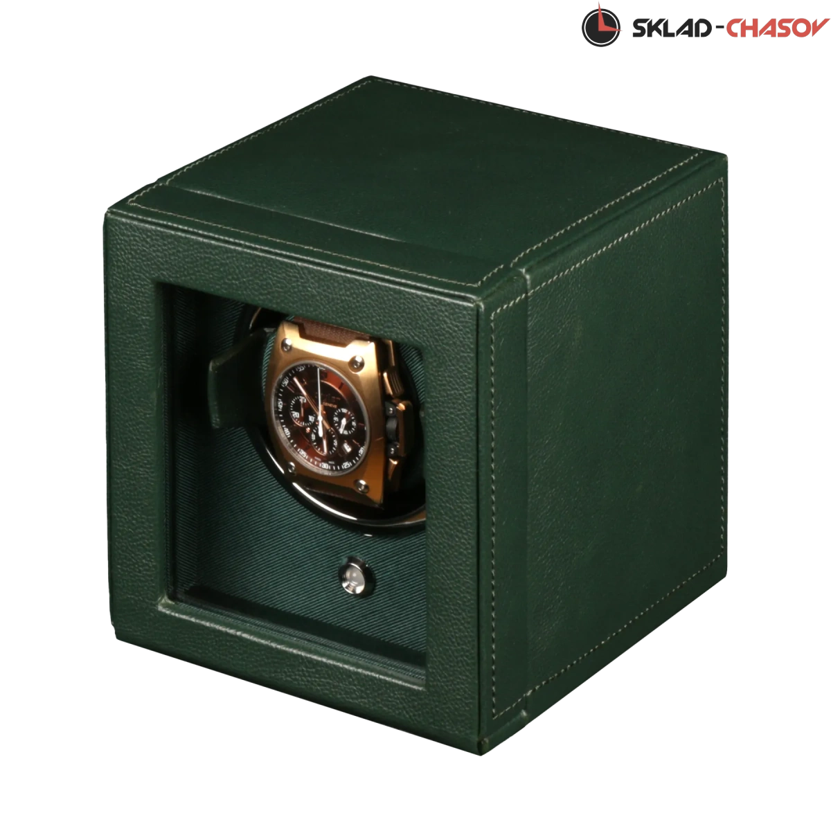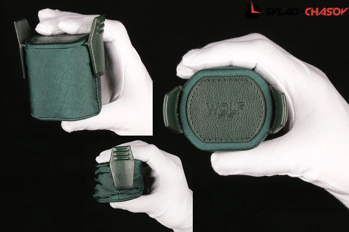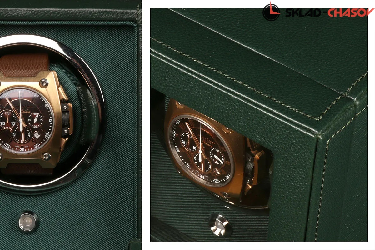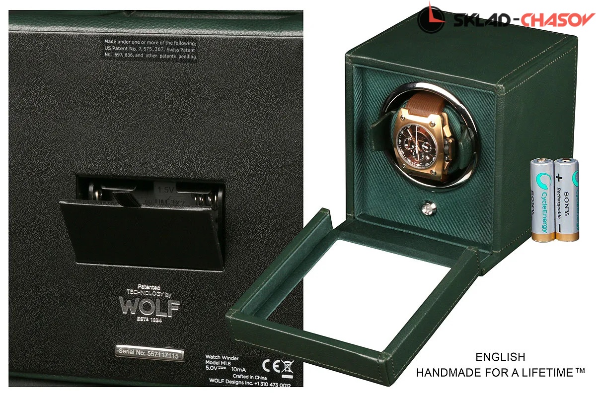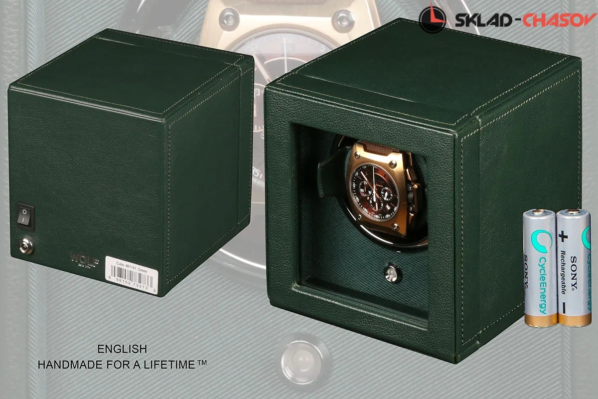 Модель "Cube cover1". Шкатулка от известного английского и старинного бренда "Wolf design" не оставит равнодушным презентабельных и успешных людей, так как выполнена в ручную лучшими мастерами. Корпус из кожи темно-зеленого цвета, внутри отделка износостойким шелком. Открытый доступ к вашим часам, удобный современный держатель для ваших любимых часов с фиксацией. Каждая шкатулка со своим серийным номером. Работает от сети и от 2 батареек класса "AA". Регулируется направления вращения попеременно при кол-ве оборотов в сутки 900. Отложенный старт механизма 10 секунд. Гарантия 18 мес. Фирменная подарочная чёрная коробка. Удобные классические держатели для наручных часов с логотипом WOLF. Корпус из кожи темно-зеленого цвета, внутри отделка износостойким шелком.