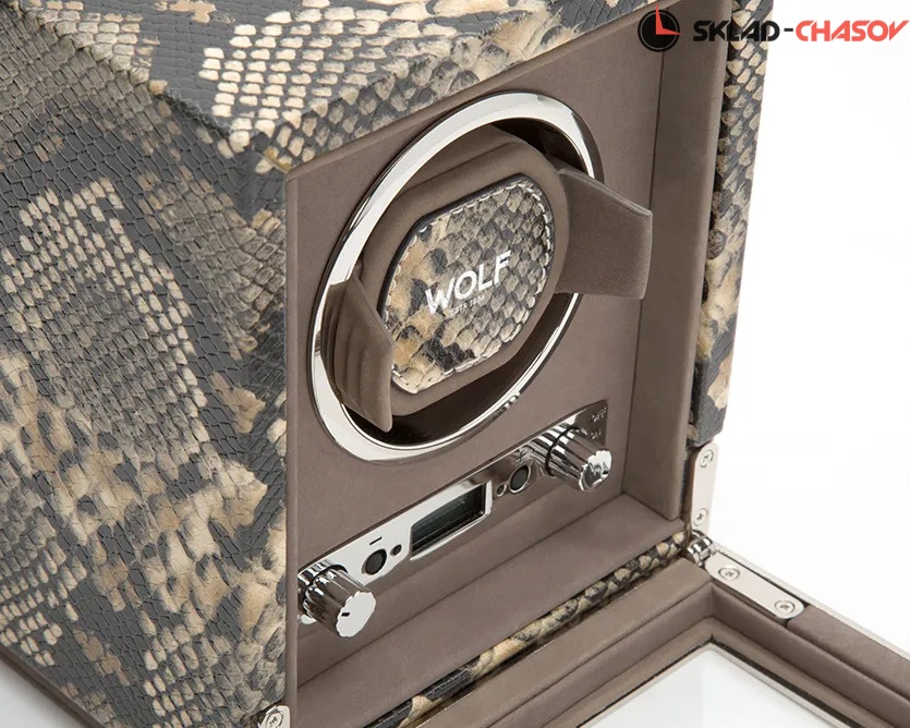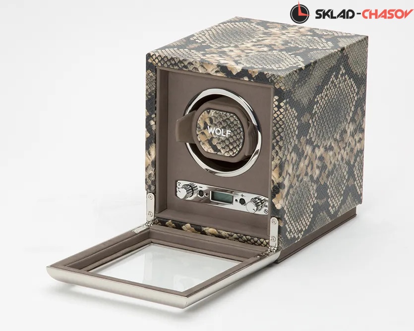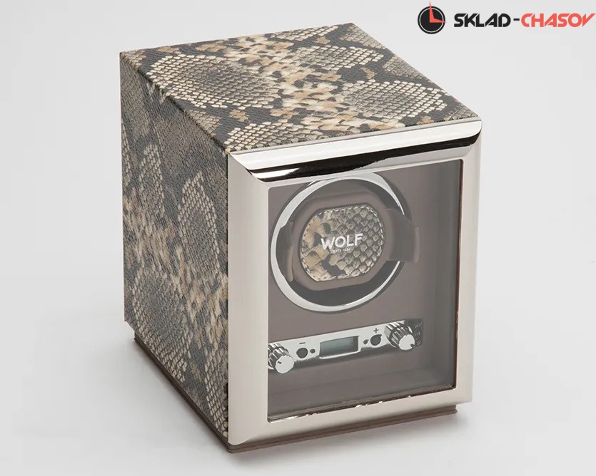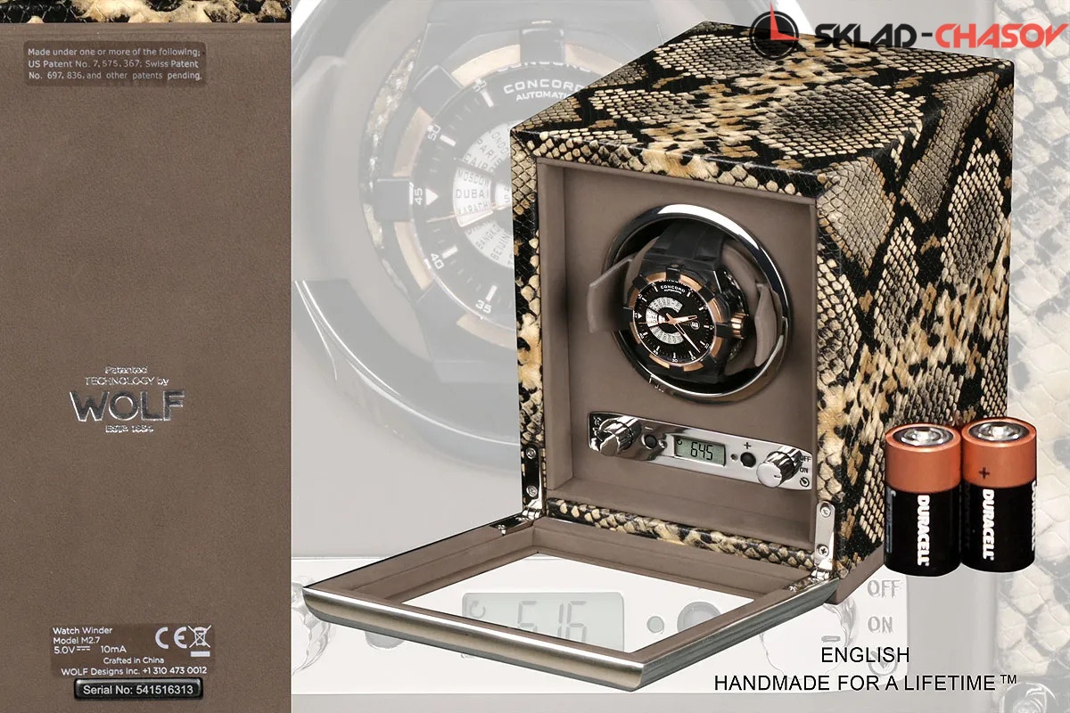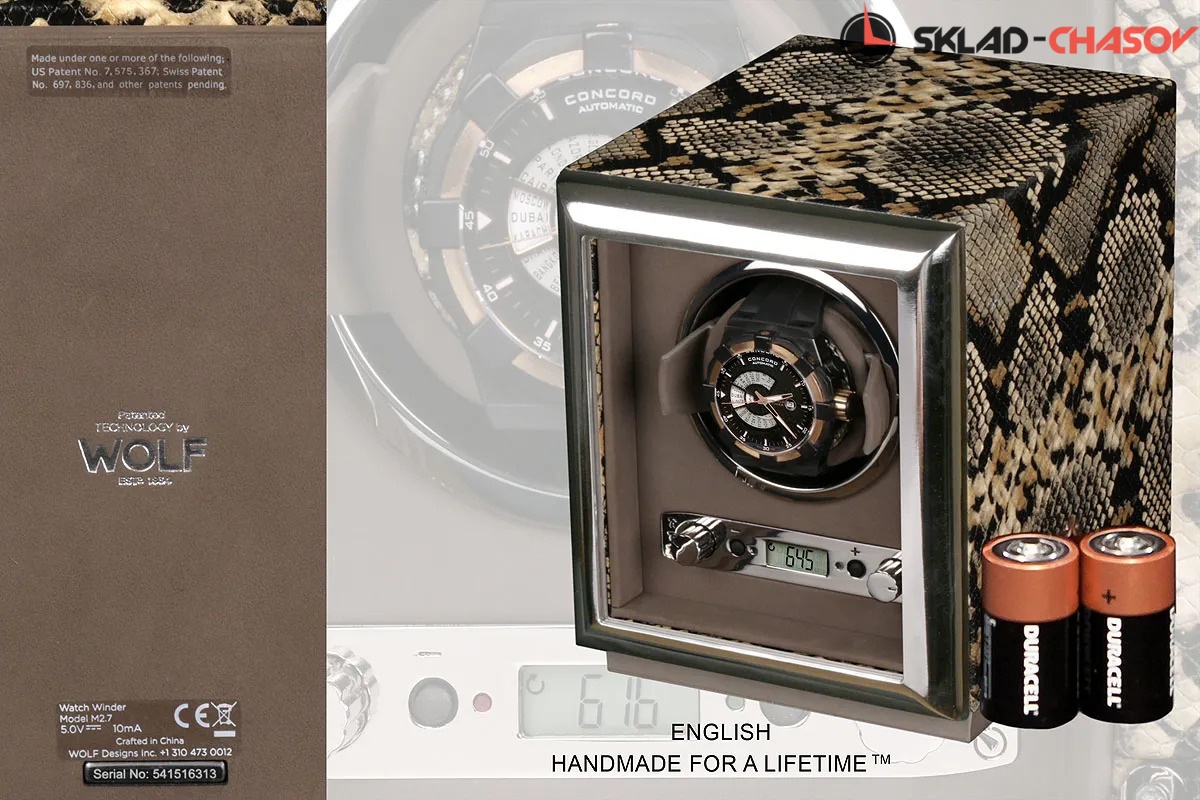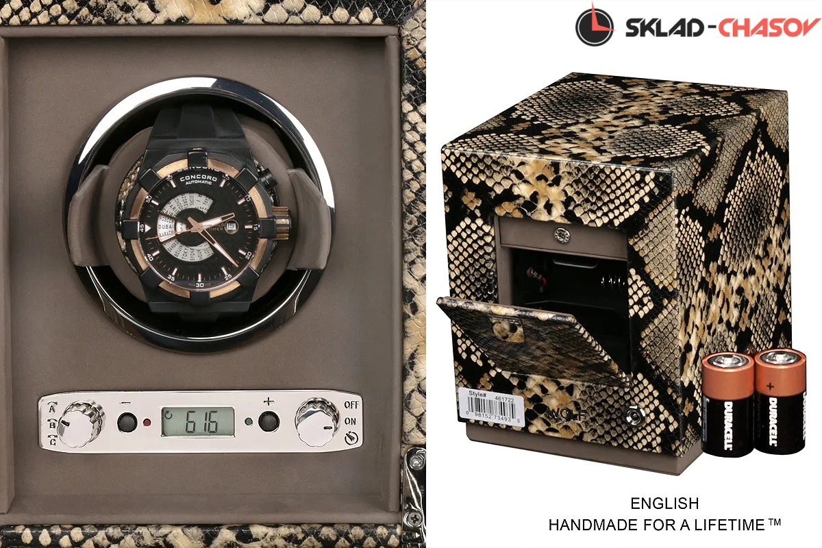 Шкатулка от известного английского и старинного бренда "Wolf design" не оставит равнодушным презентабельных и успешных людей, так как выполнена в ручную лучшими мастерами. Корпус из кожи, внутри отделка бархатом. Открытый доступ к вашим часам, удобный современный держатель для ваших любимых часов с фиксацией. Каждая шкатулка со своим серийным номером. Работает от сети и от 2 батареек класса "D". Регулируется направления вращения попеременно при кол-ве оборотов в сутки 900. Отложенный старт механизма 10 секунд. Гарантия 1 год. Фирменная подарочная чёрная коробка. Удобные классические держатели для наручных часов с логотипом WOLF. Корпус из кожи коричневого цвета, внутри отделка бархатом. Логотип WOLF на лицевой стороне в тоне кожи питона.