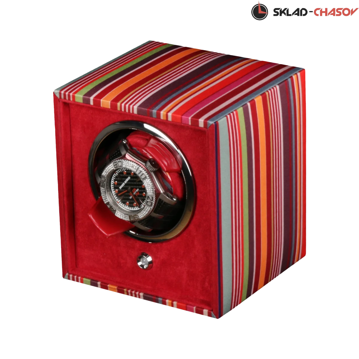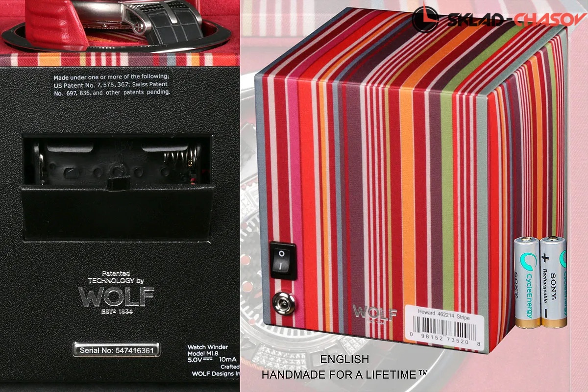 Модель "ETRO stripe”. Шкатулочка от известных английских мастеров компании "Wolf", изготовлена в ручную лучшими мастерами. Подзавод одних часов, корпус "cube" из ЭКО-шелка цветного цвета, внутри выстлана красным бархатом,подушечка для часов телескопическая с фиксации красного цвета. Включения с помощью кнопки на обратной стороне, работа от батареек и сети. Удобные фирменные держатели для наручных часов с логотипом WOLF. Корпус "cube" из ЭКО-шелка цветного цвета, внутри выстлана красным бархатом,подушечка для часов телескопическая с фиксации красного цвета.