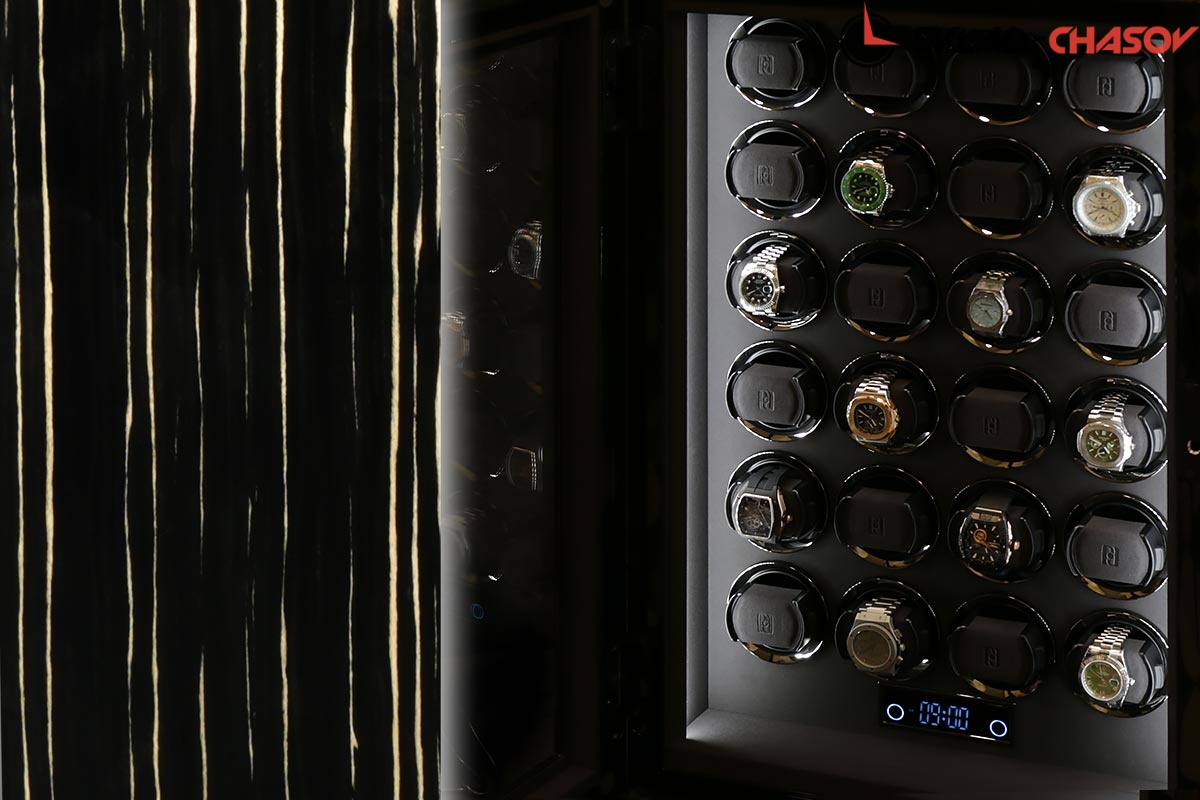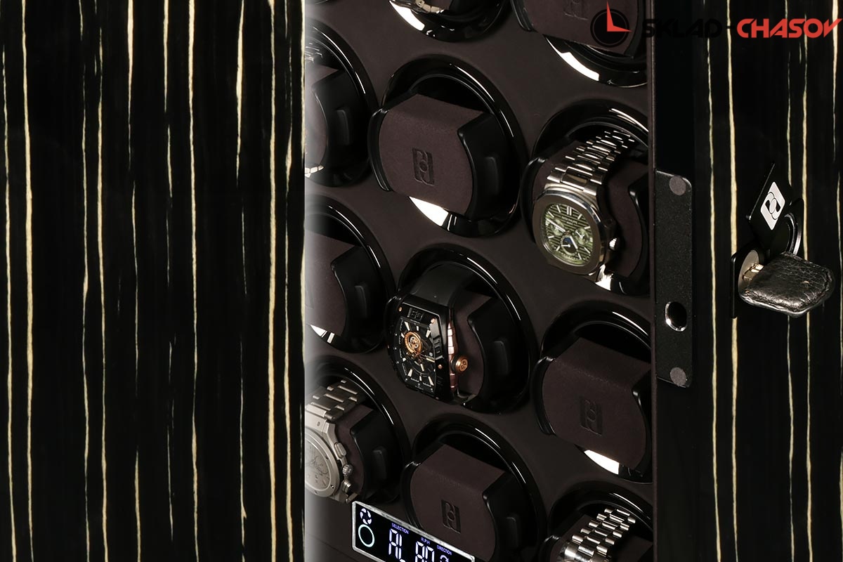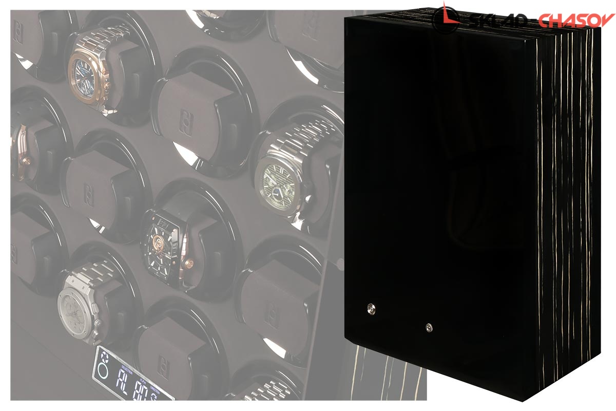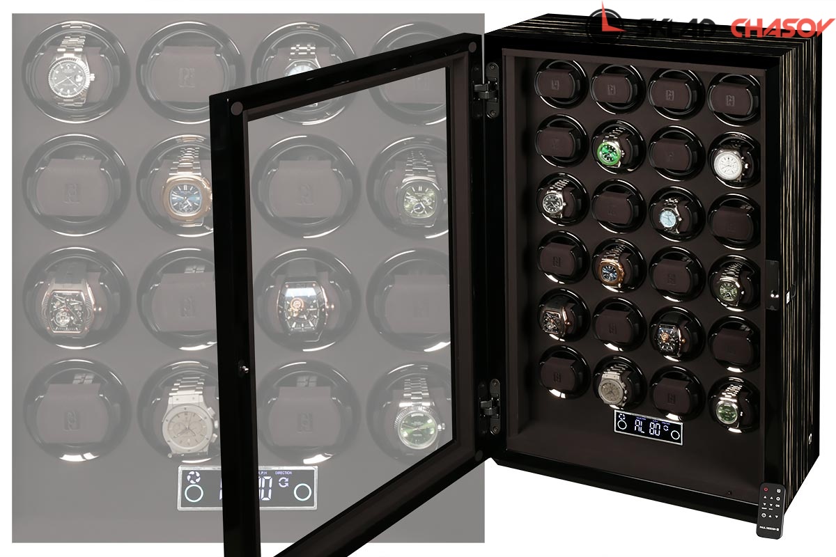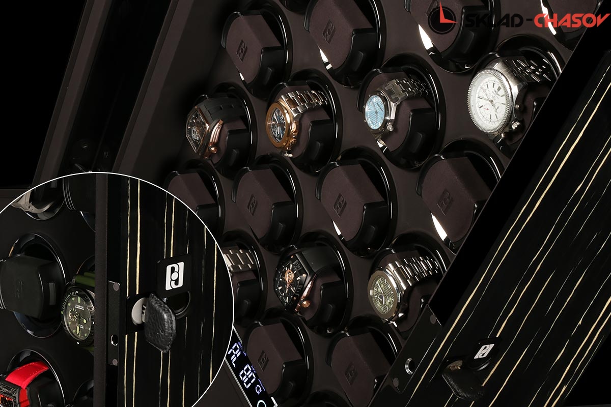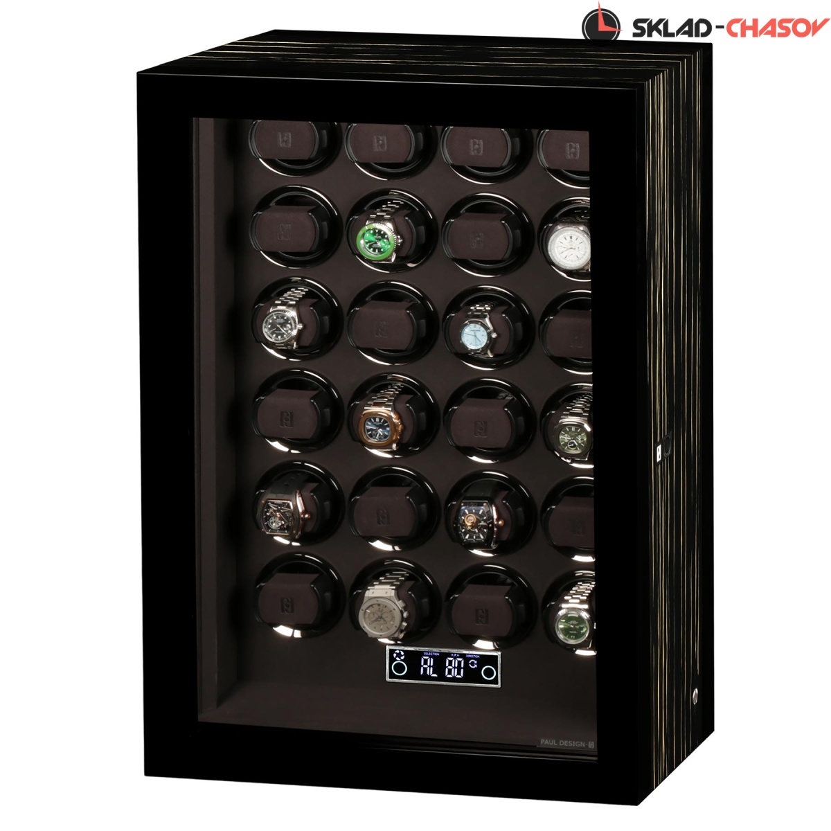 Новая модель для автоподзавода 24-х часов с новым инновационным открытием (отпечаток пальца, с возможностью запрограммировать до 5 отпечатков). Корпус выполнен из двух благородных пород дерева (чёрное Венге и дерево 3д), внутри выстлано практичной микрофиброй. Новые и самые удобные держатели позволяют без труда фиксировать ваши часы под любой размер запястья. Современный сенсорный экран позволяет настраивать автоподзавод для любых часов, любой сложности (все возможные регулировки). Пульт даёт возможность регулировки отдельно на каждые часы. Встроенные часы на табло. Светодиодная подсветка, алюминиевые красивые рамки для часов, отдельная кнопка вкл/выкл подсветки. Фирменная подарочная коробка PaulDesign.