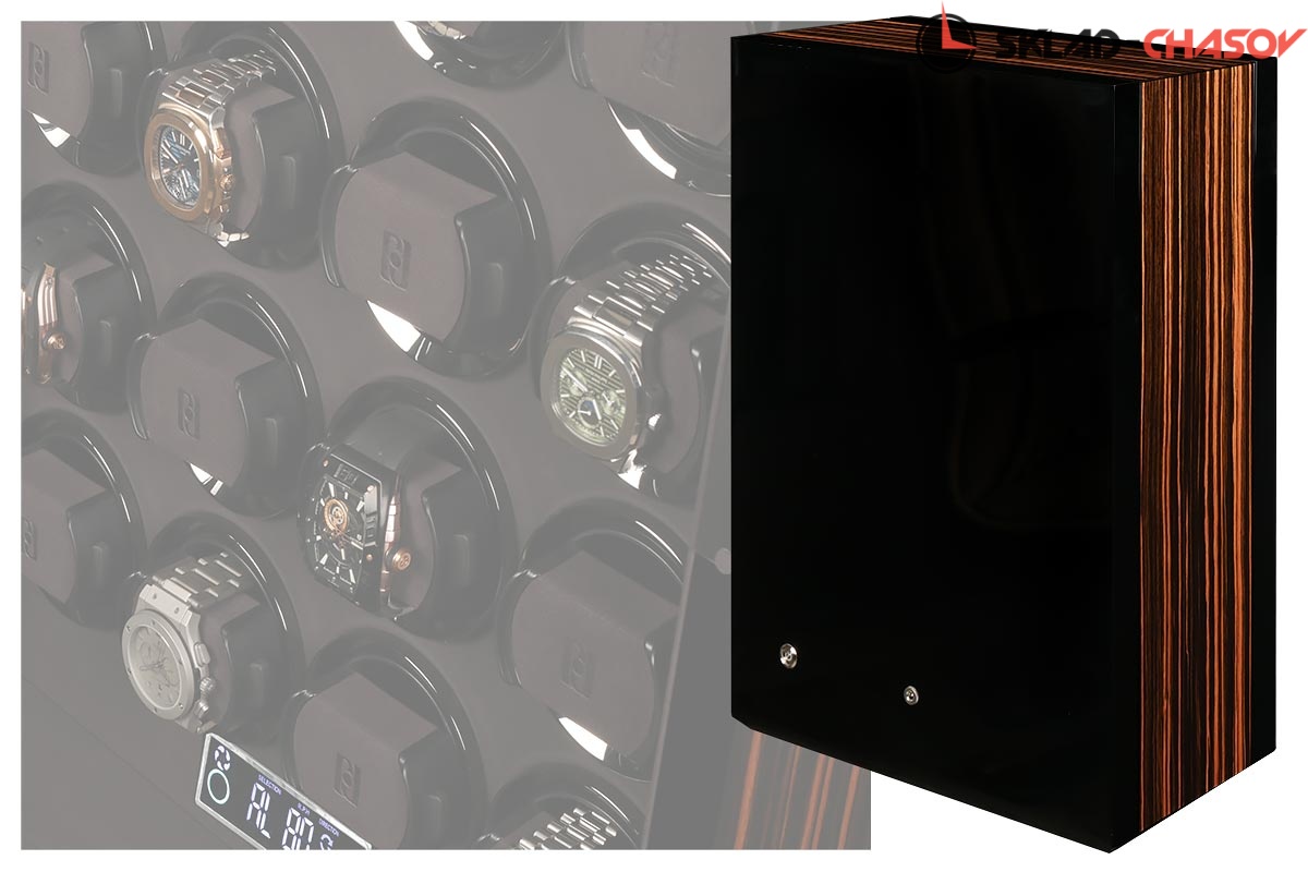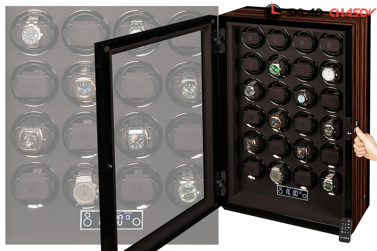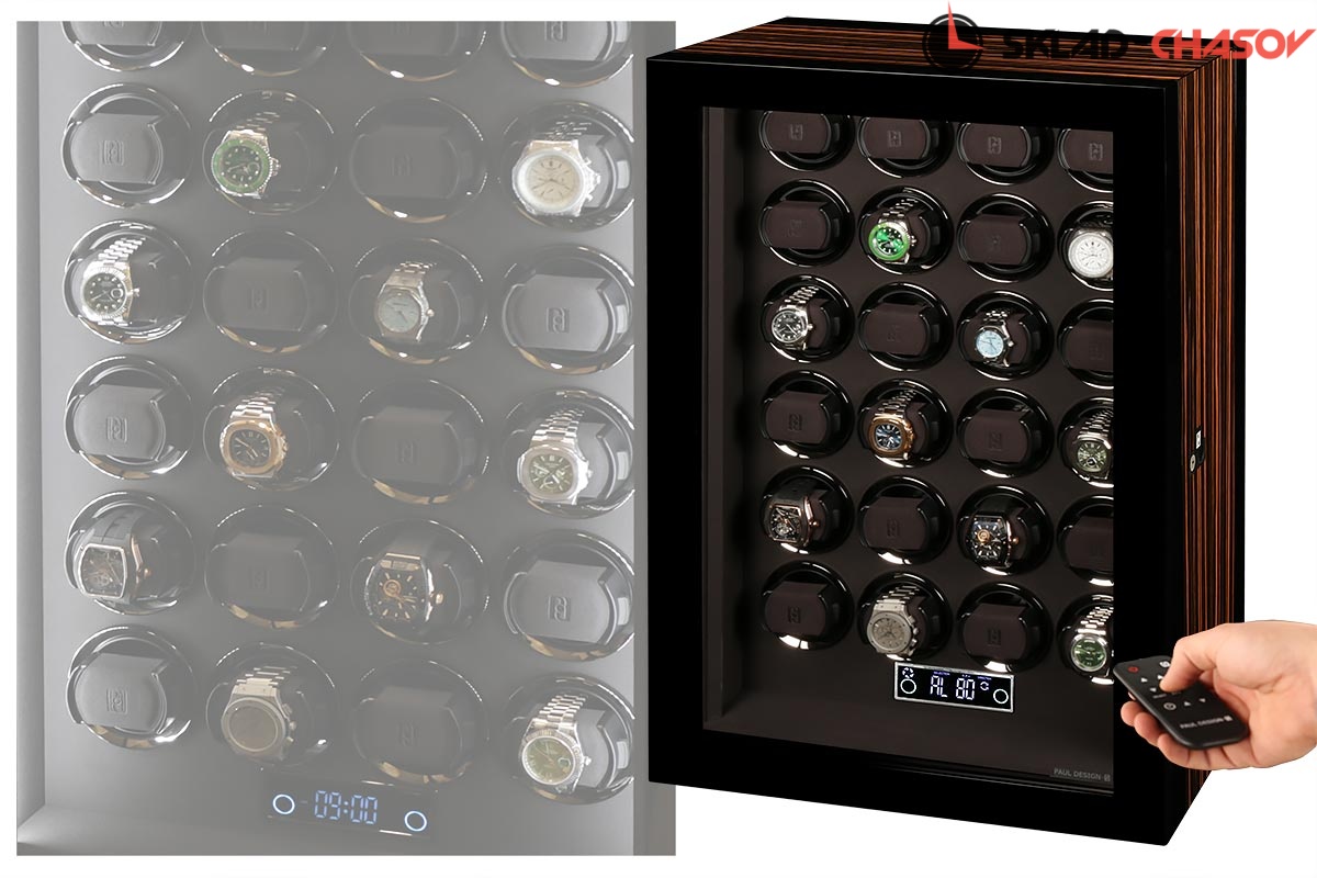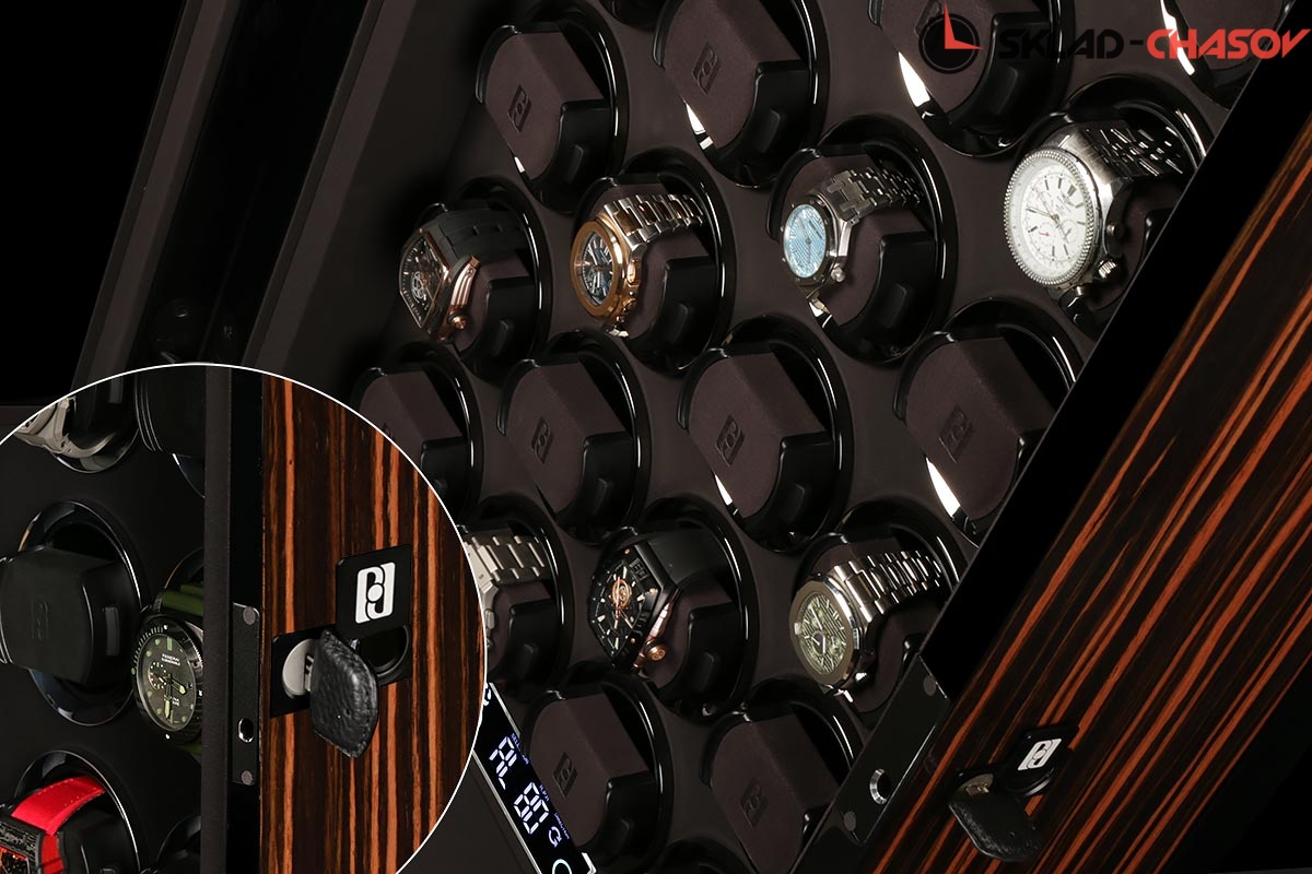 Новая модель для автоподзавода 24-х часов с новым инновационным открытием (отпечаток пальца, с возможностью запрограммировать до 5 отпечатков). Корпус выполнен из двух благородных пород дерева (чёрное Венге и дерево Макассар), внутри выстлано практичной микрофиброй. Новые и самые удобные держатели позволяют без труда фиксировать ваши часы под любой размер запястья. Современный сенсорный экран позволяет настраивать автоподзавод для любых часов, любой сложности (все возможные регулировки). Пульт даёт возможность регулировки отдельно на каждые часы. Встроенные часы на табло. Светодиодная подсветка, алюминиевые красивые рамки для часов, отдельная кнопка вкл/выкл подсветки. Фирменная подарочная коробка PaulDesign.