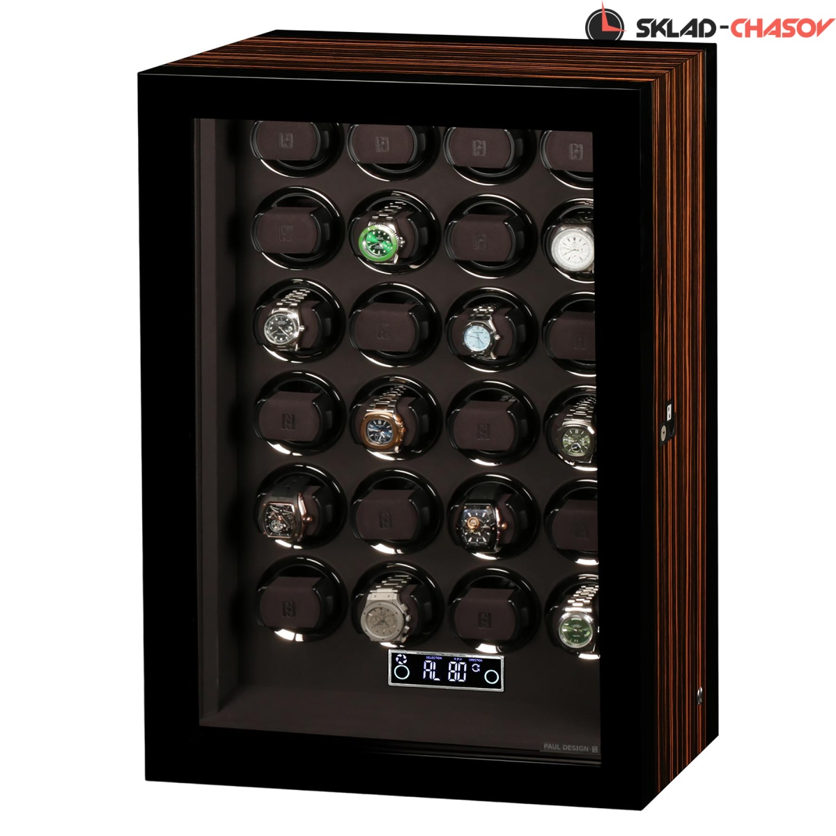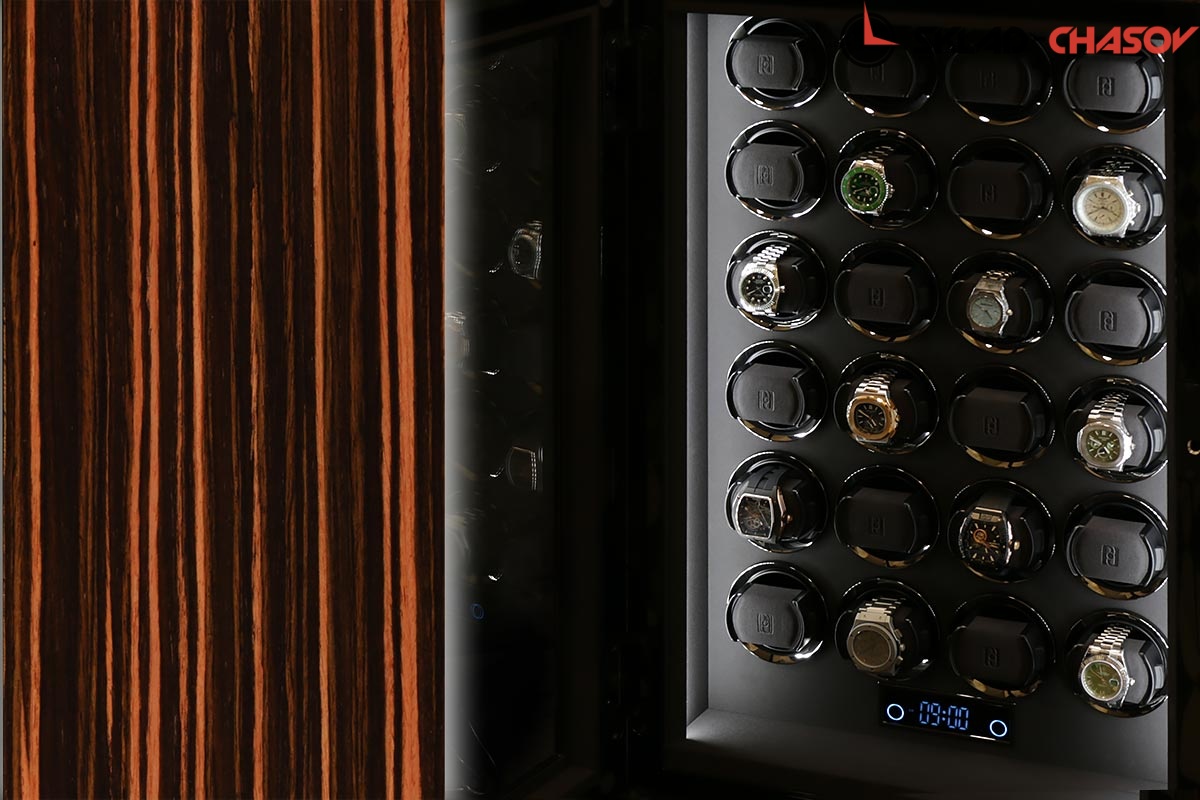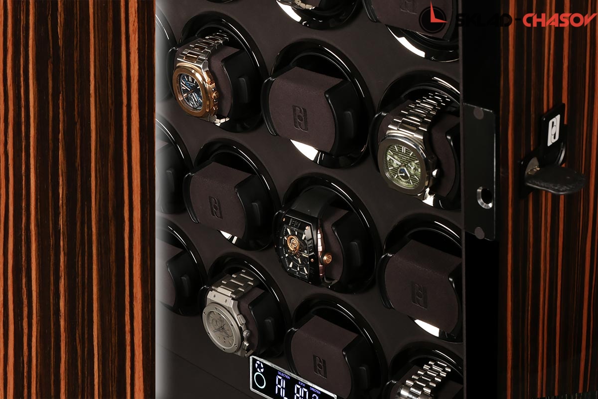 Новая модель для автоподзавода 24-х часов с новым инновационным открытием (отпечаток пальца, с возможностью запрограммировать до 5 отпечатков). Корпус выполнен из двух благородных пород дерева (чёрное Венге и дерево Макассар), внутри выстлано практичной микрофиброй. Новые и самые удобные держатели позволяют без труда фиксировать ваши часы под любой размер запястья. Современный сенсорный экран позволяет настраивать автоподзавод для любых часов, любой сложности (все возможные регулировки). Пульт даёт возможность регулировки отдельно на каждые часы. Встроенные часы на табло. Светодиодная подсветка, алюминиевые красивые рамки для часов, отдельная кнопка вкл/выкл подсветки. Фирменная подарочная коробка PaulDesign.