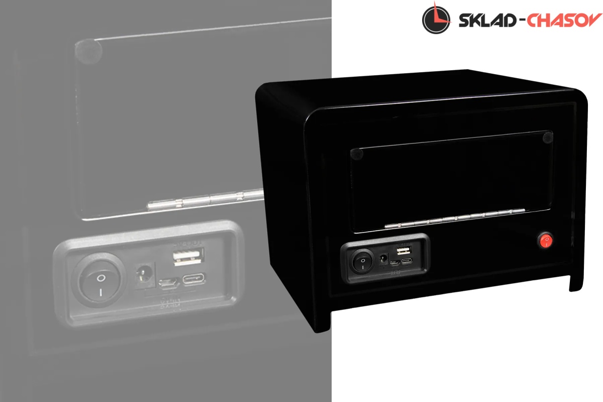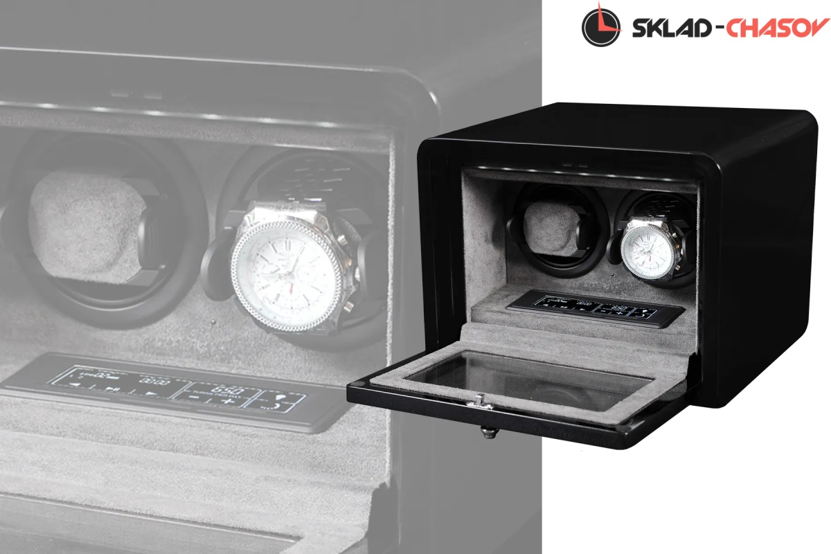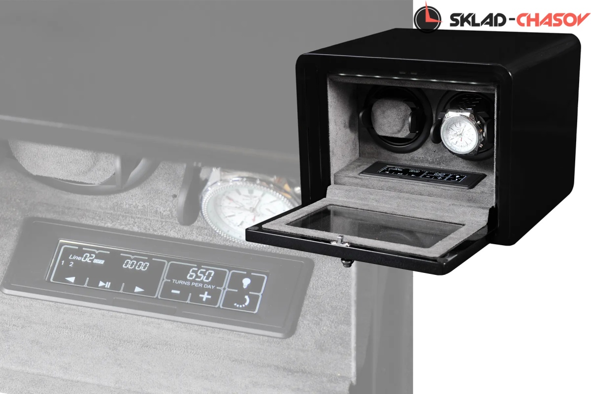 Новая модель "Times2". Шкатулка выполнена из чёрного дерева венге, покрыта 15 слоями лака. Внутри выстлана темно-серой микрофиброй, удобные телескопические держатели, крышка открывается вниз, натуральное стекло. Электронное табло позволяет отдельно настраивать все возможные регулировки - для любых часов! Количество оборотов в сутки от 600-1800, 3 варианта направления вращения. Работает от сети 220 в.