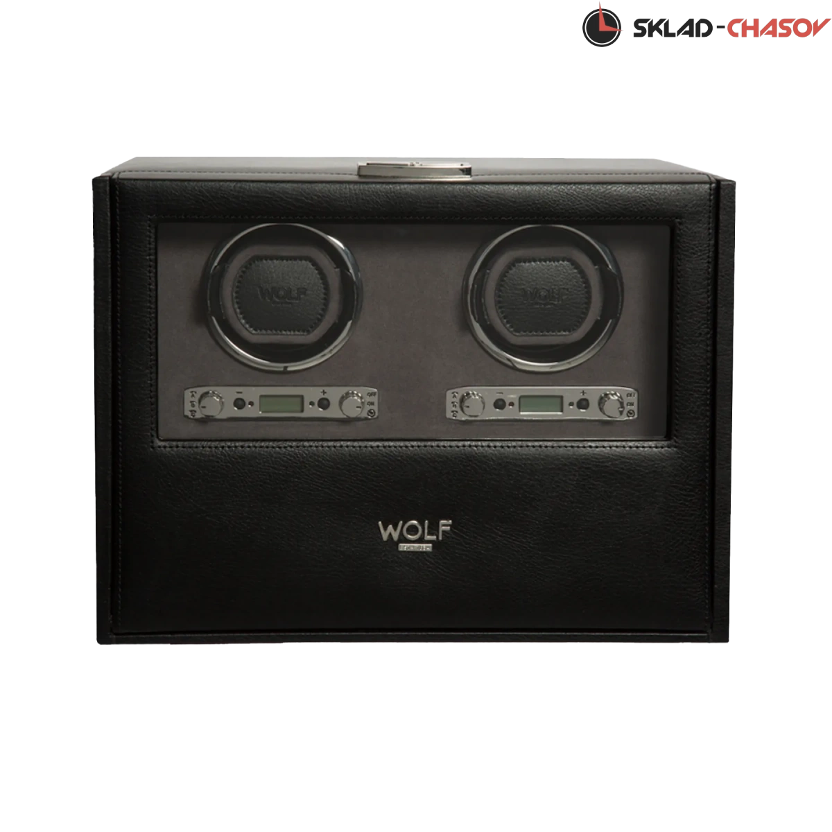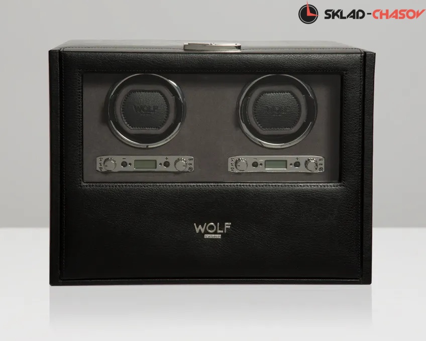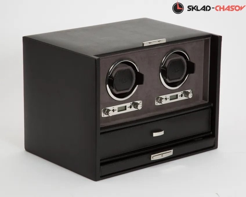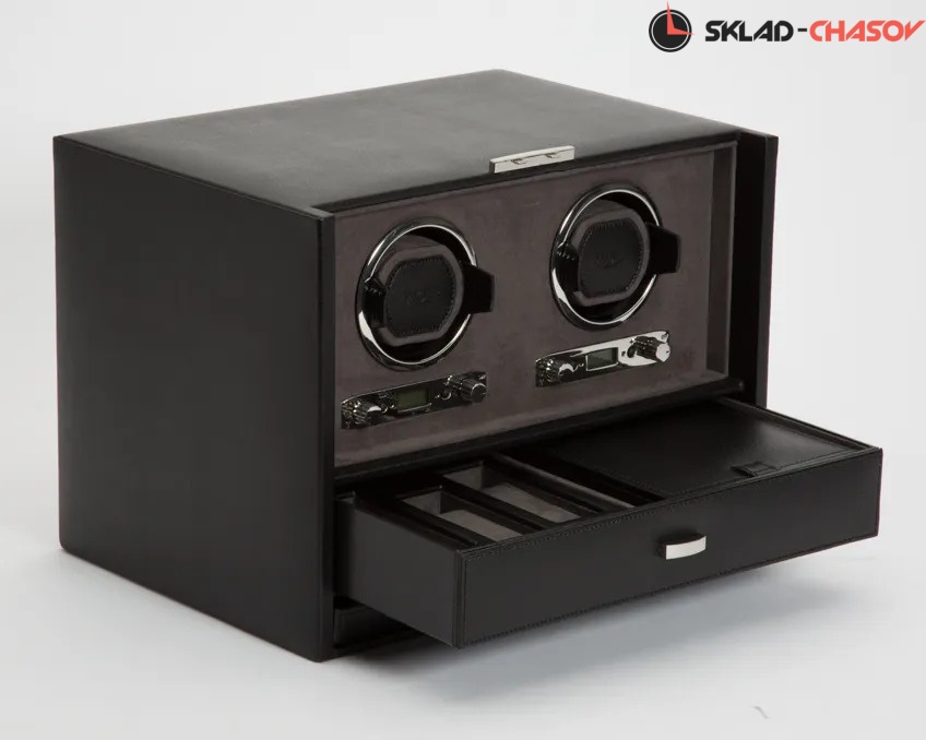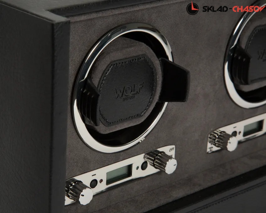 Шкатулка от известного английского и старинного бренда "Wolf design" не оставит равнодушным презентабельных и успешных людей, так как выполнена в ручную лучшими мастерами. Корпус из черной кожи покрытого рояльным лаком, внутри отделка замша. Подзавод двух часов любой сложности, дополнительное пространство для трех часов и аксессуаров можно найти в неприметном выдвижном ящике, современный держатель для ваших любимых часов с фиксацией. Внешняя дверца с возможностью закрытия на ключик. Каждая шкатулка со своим серийным номером. Работает от сети и от 2 батареек класса "D". Регулируется 3 направления вращения при кол-ве оборотов от 300 до 1200 в сутки. Возможность фиксации на ключик. Отложенный старт механизма 10 секунд. Гарантия 18 мес. Фирменная подарочная чёрная коробка.