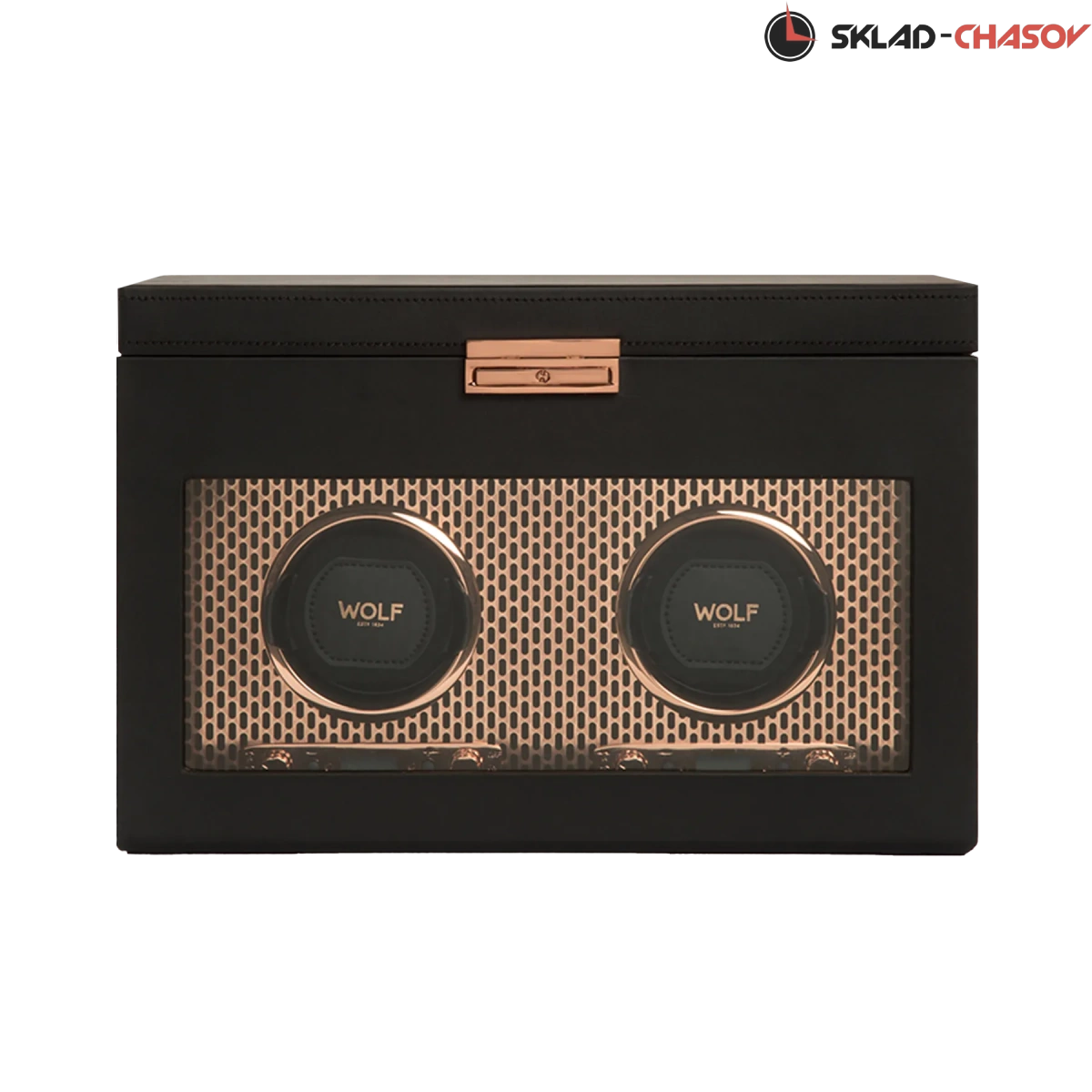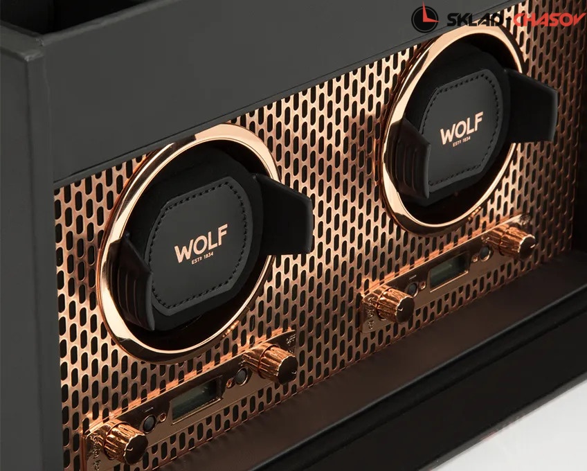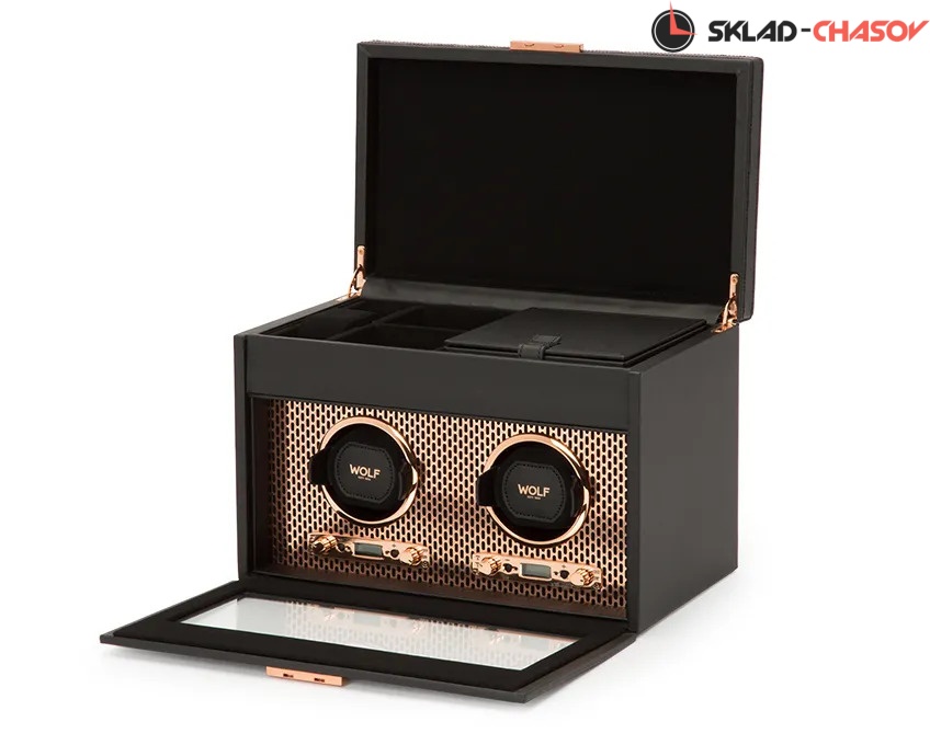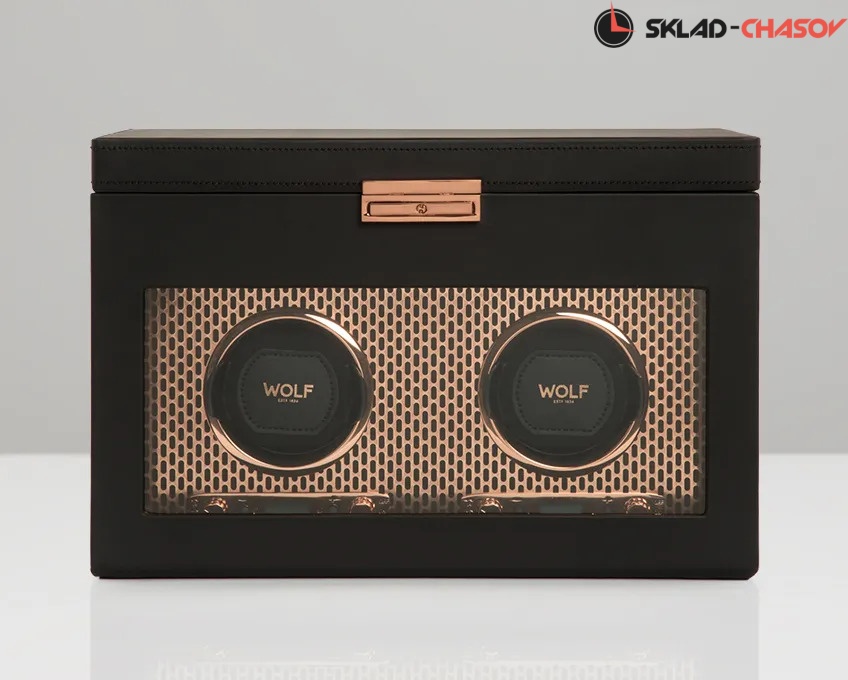 Шкатулка от известного английского и старинного бренда "Wolf" не оставит равнодушным презентабельных и успешных людей, так как выполнена в ручную лучшими мастерами. Корпус в особенности пользовательского медного металлического покрытия, внутри отделка замша. Подзавод двух часов любой сложности, 1 хранилище часов с повышенной манжетой, 2 средних отсека, чехол для путешествий и 2 модуля обмоток, современный держатель для ваших любимых часов с фиксацией. Внешняя дверца с возможностью закрытия на ключик. Каждая шкатулка со своим серийным номером. Работает от сети и от 2 батареек класса "D". Регулируется 3 направления вращения при кол-ве оборотов от 300 до 1200 в сутки. Возможность фиксации на ключик. Отложенный старт механизма 10 секунд. Гарантия 18 мес. Фирменная подарочная чёрная коробка.