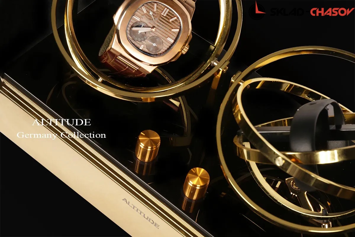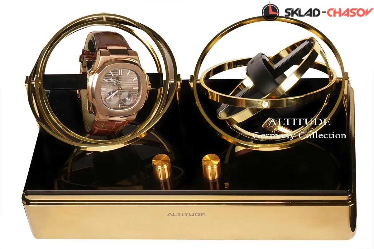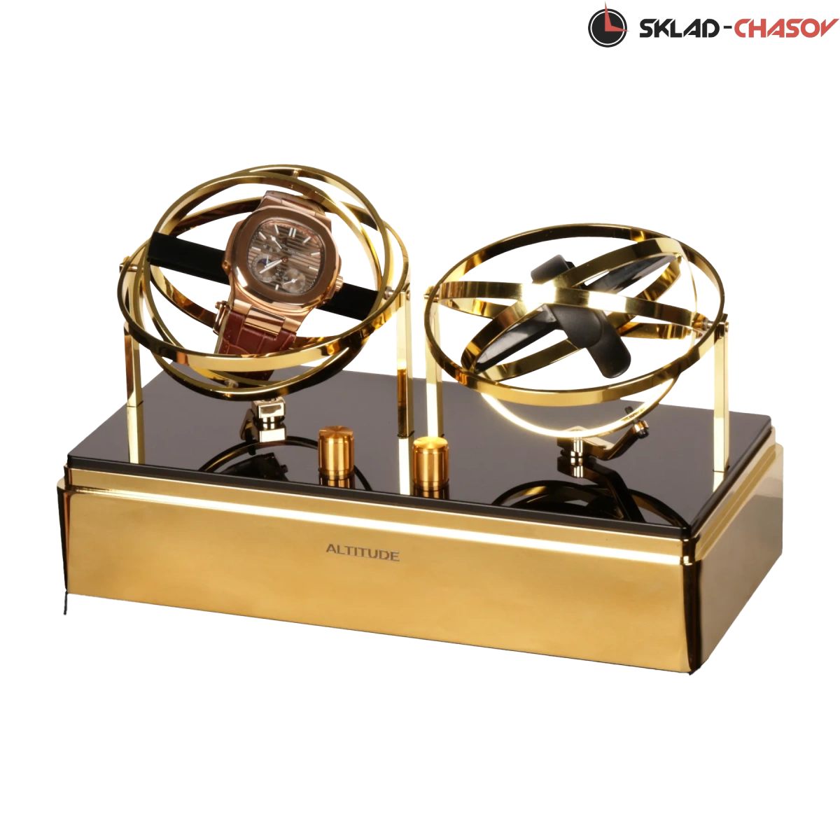 Футуристическая и эксклюзивная шкатулка выполнена из полированного металла с позолотой, тяжелая и статусная шкатулка идеально украсит интерьер кабинета или комнаты. Вращения по разным диагоналям в открытом механизме позволяет наблюдать и восхищаться. Регулировка каждых из двух часов отдельно.