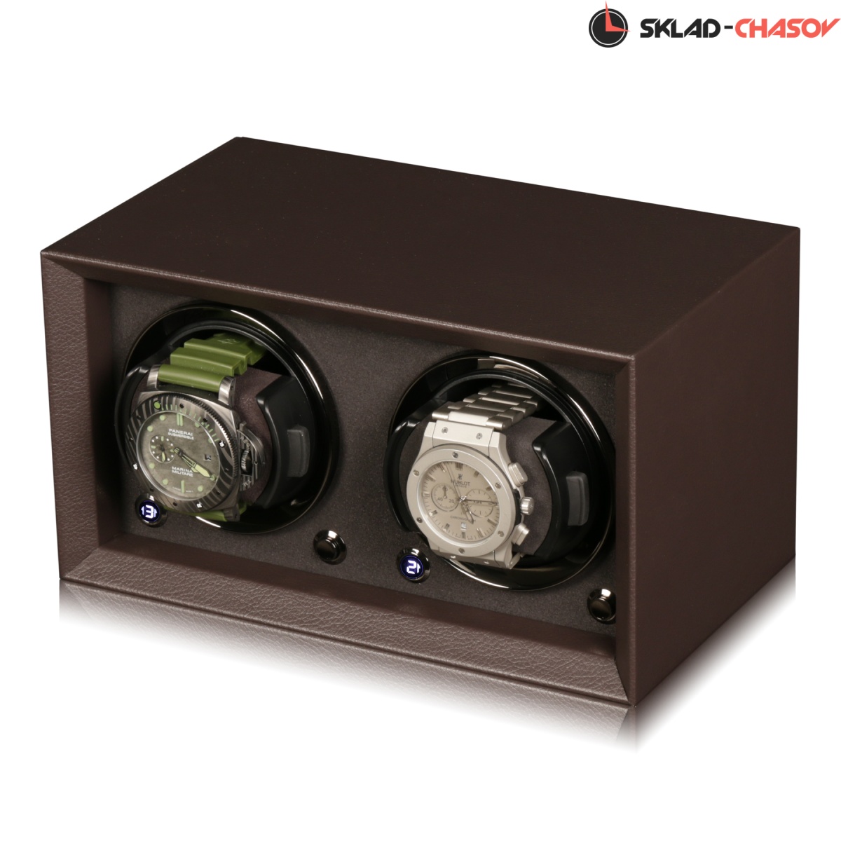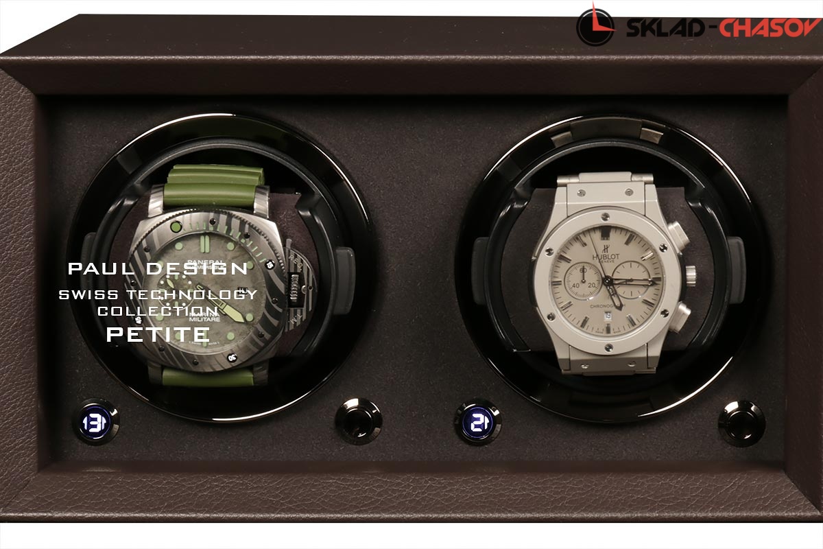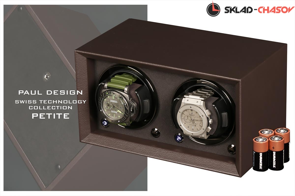 Новая модель создана с красивым внешнем дизайном и удобством эксплуатации! Открытый корпус обшит коричневой кожей, внутри обшито чёрной микрофиброй, немецкая чёрная фурнитура, удобные телескопические держатели для часов, позволяет подзаводить любые часы — любой сложности, работа от сети 220 в и встроенного блока батареек класса С.