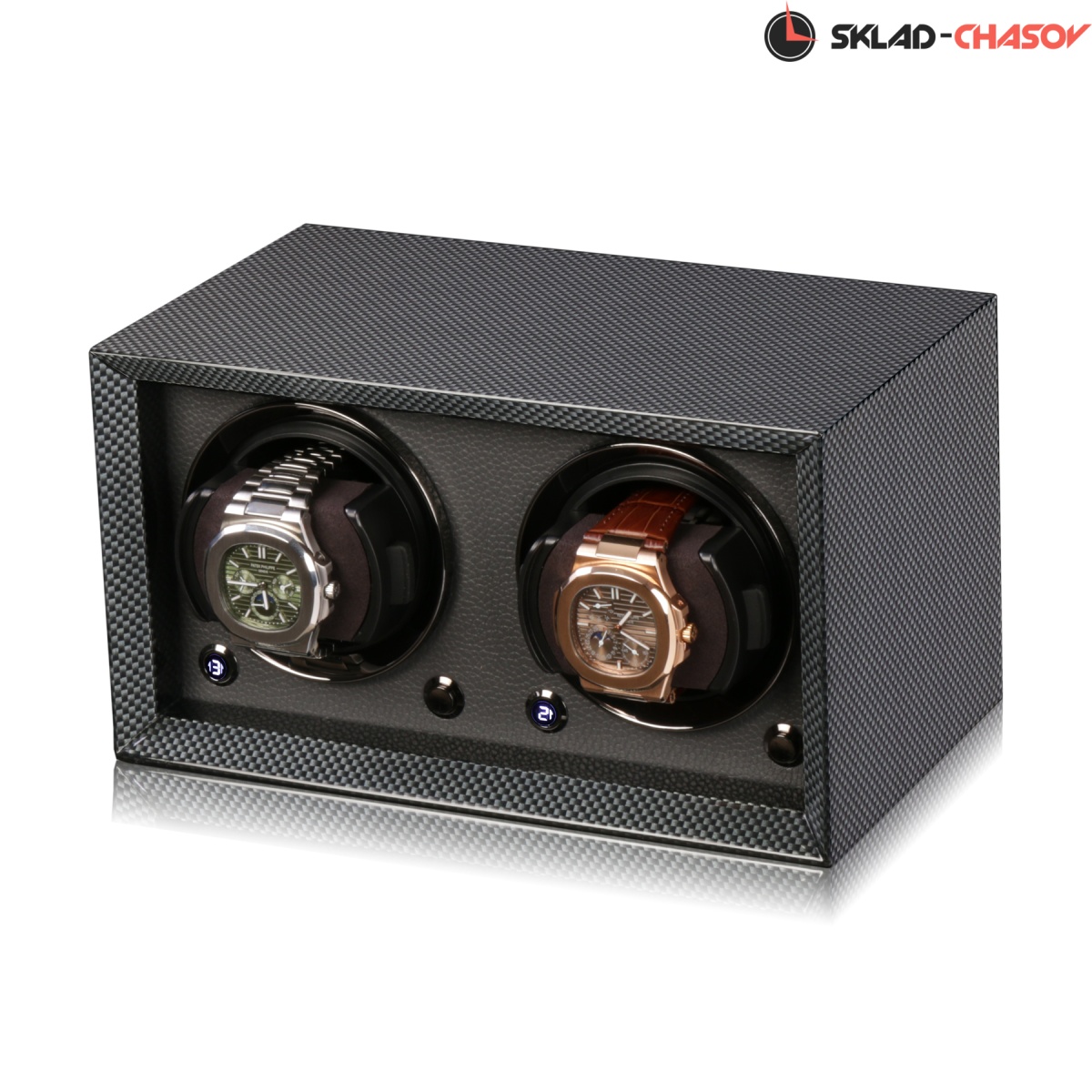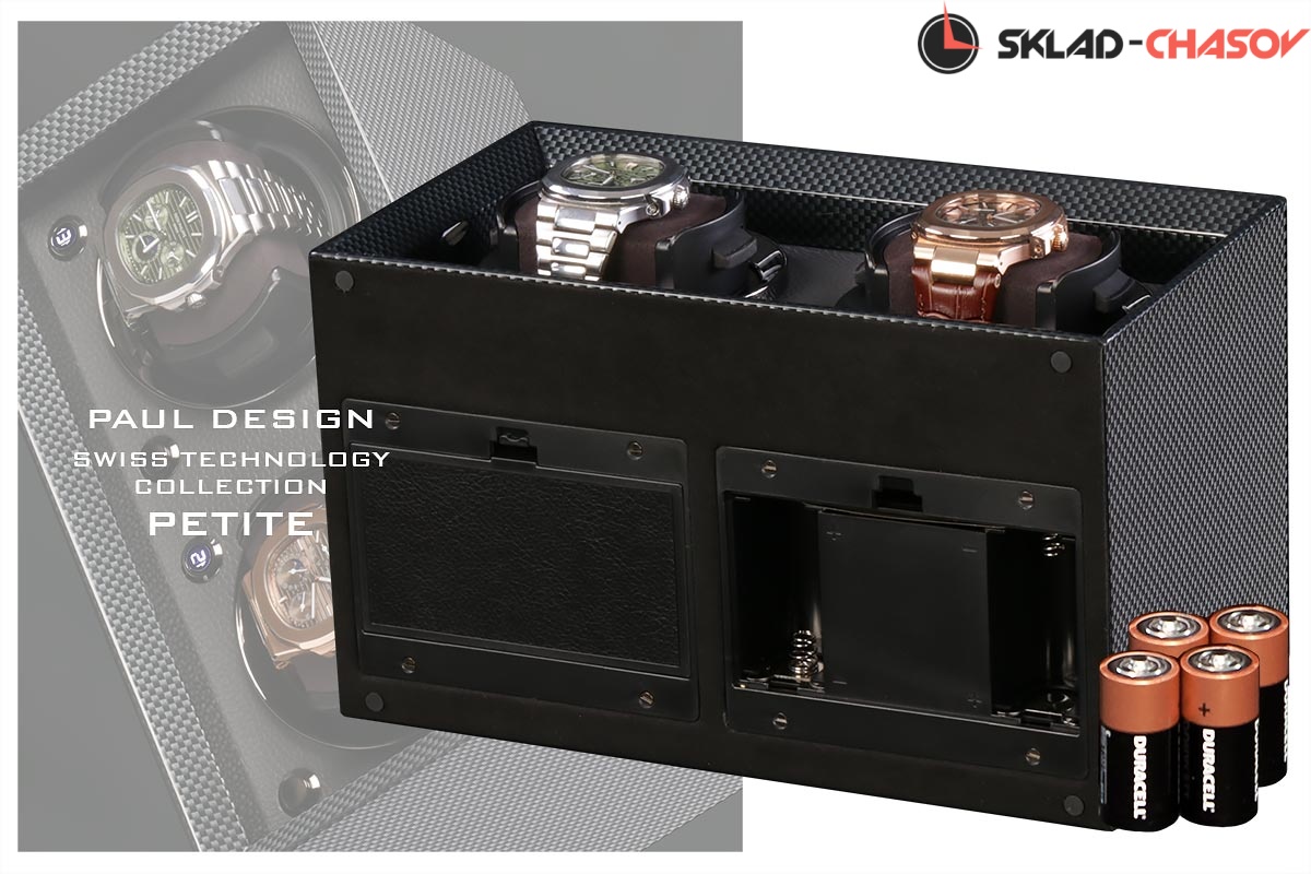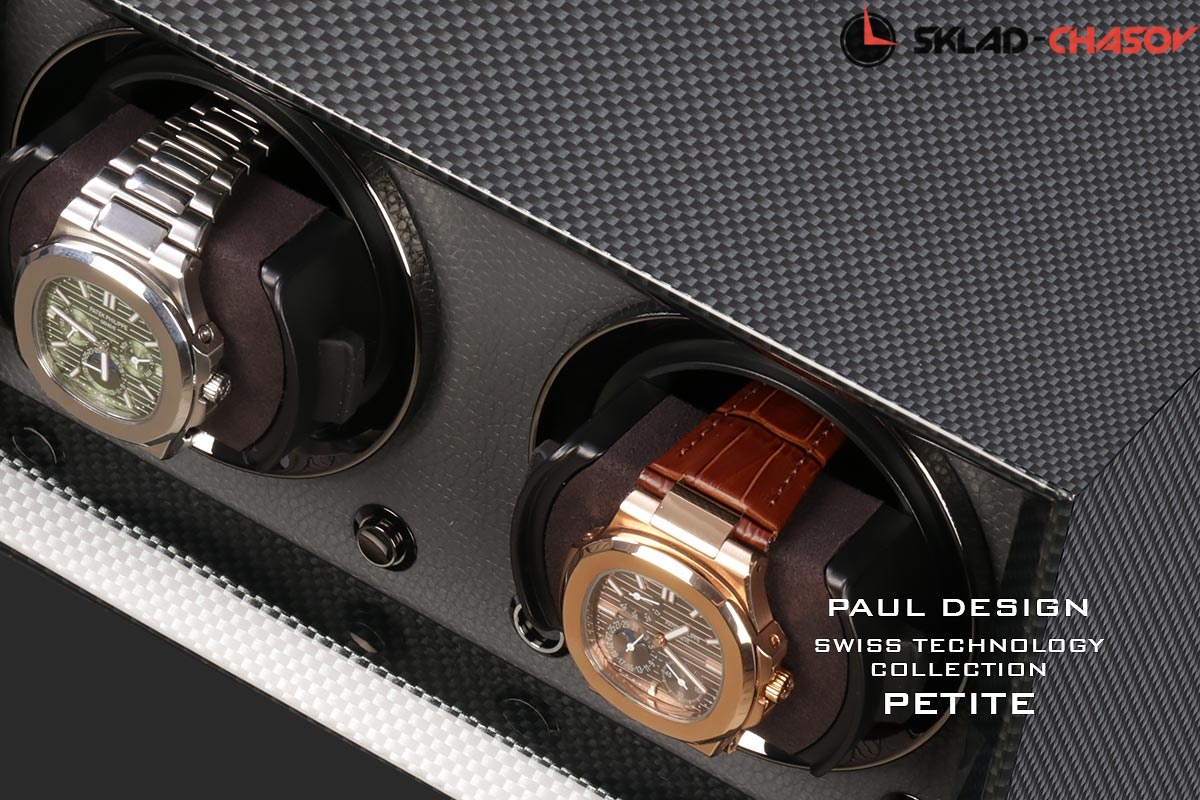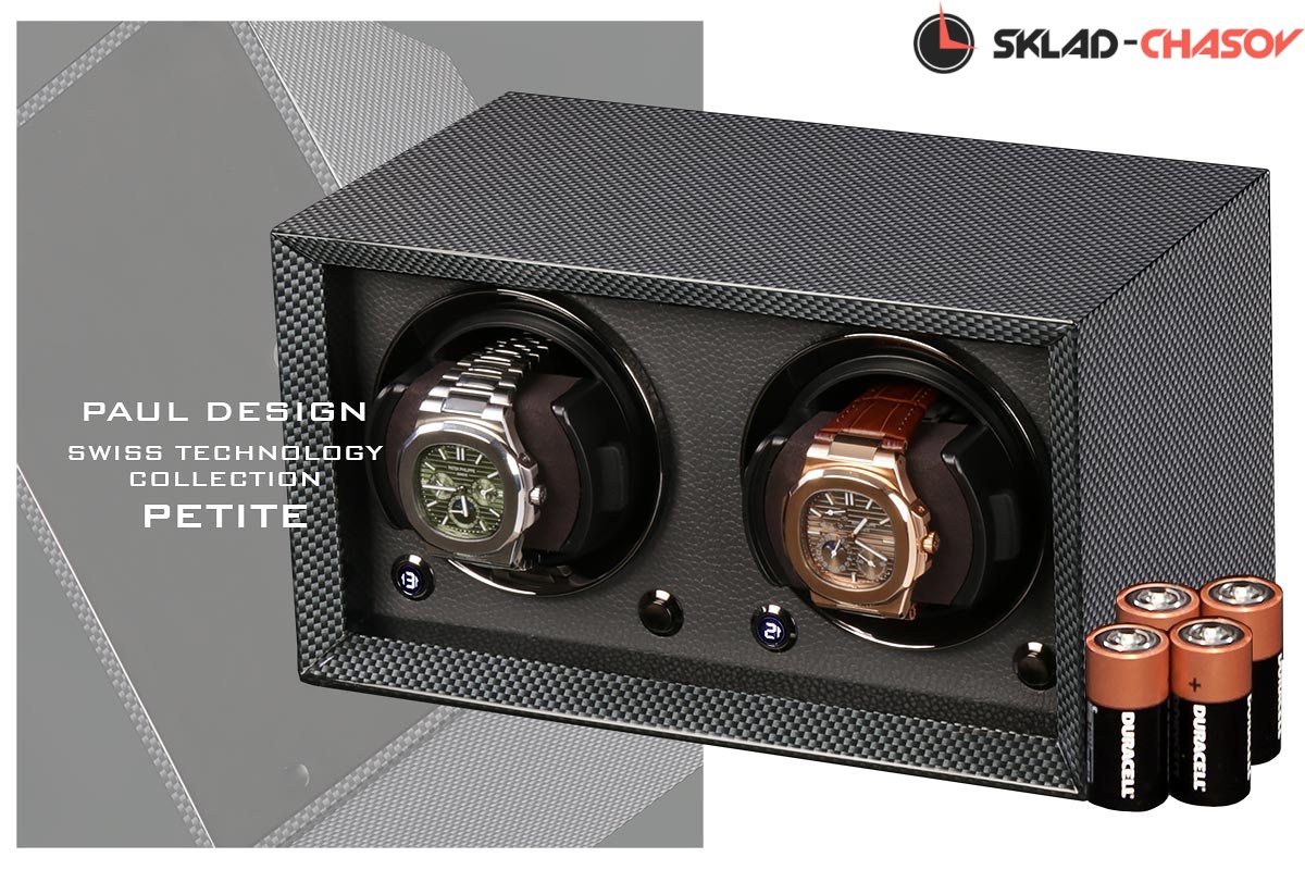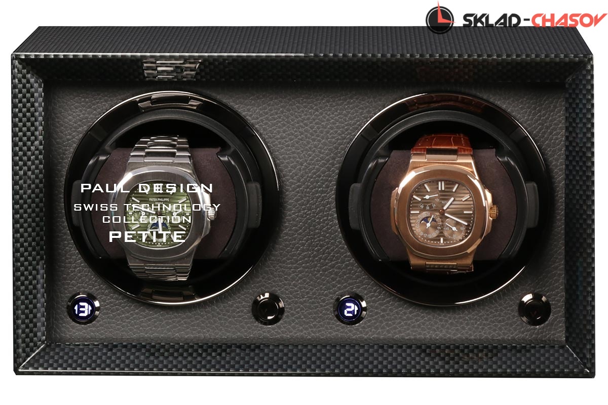 Новейшая модель создана для раздельного подзавода 2 часов с красивым внешнем дизайном и удобством эксплуатации! Открытая, стильная Шкатулка выполнена из дерева покрытого карбоном, внутри обшито чёрной кожей, немецкая чёрная фурнитура, удобные телескопические держатели для часов (идеально для любого размера запястья), позволяет подзаводить любые часы — любой сложности (окно показывает выбор регулировки), работа от сети 220 в и встроенного блока 4 батареек класса С. Фирменная упаковка PD.