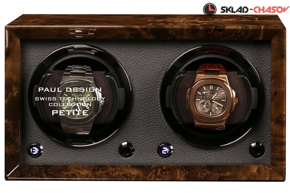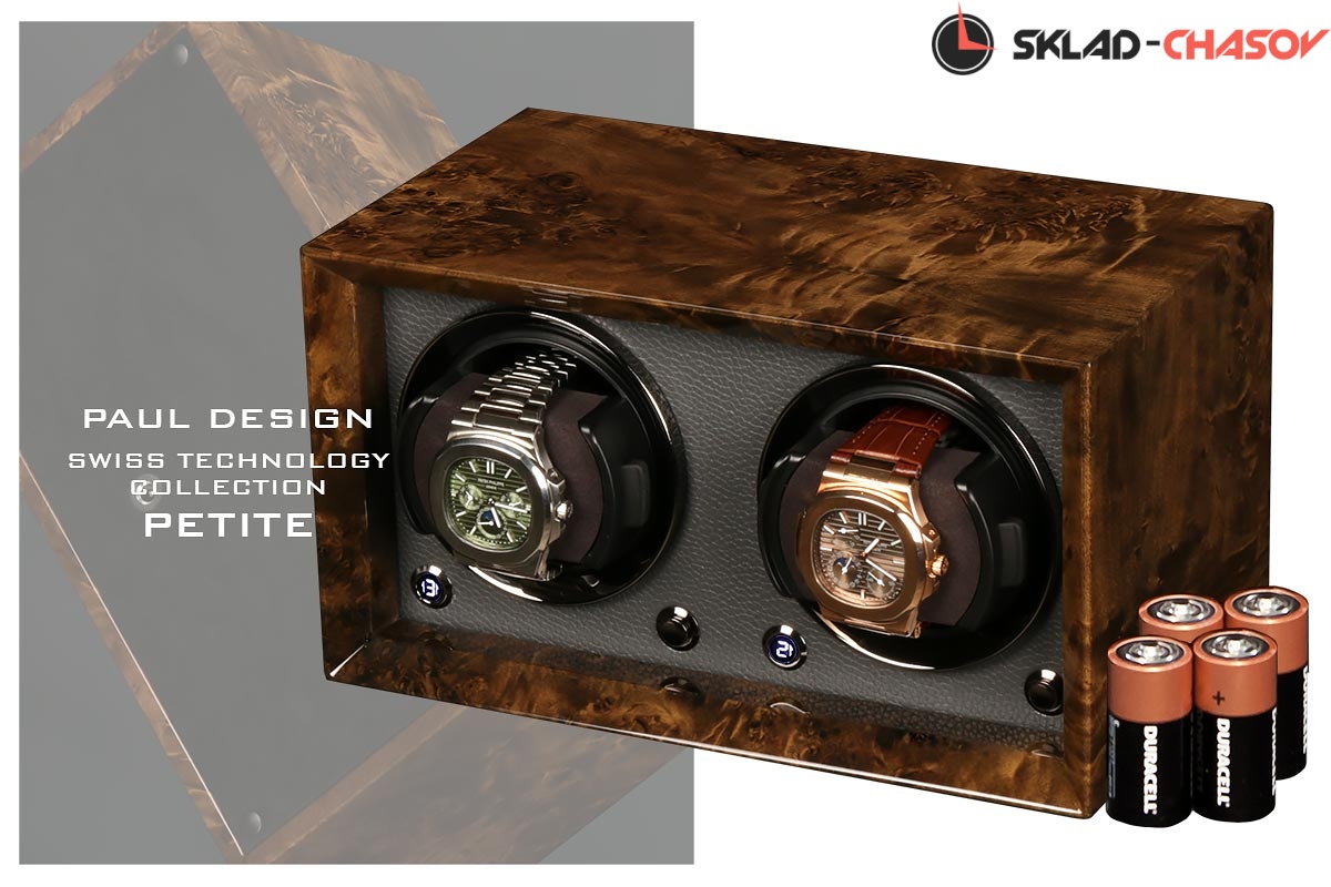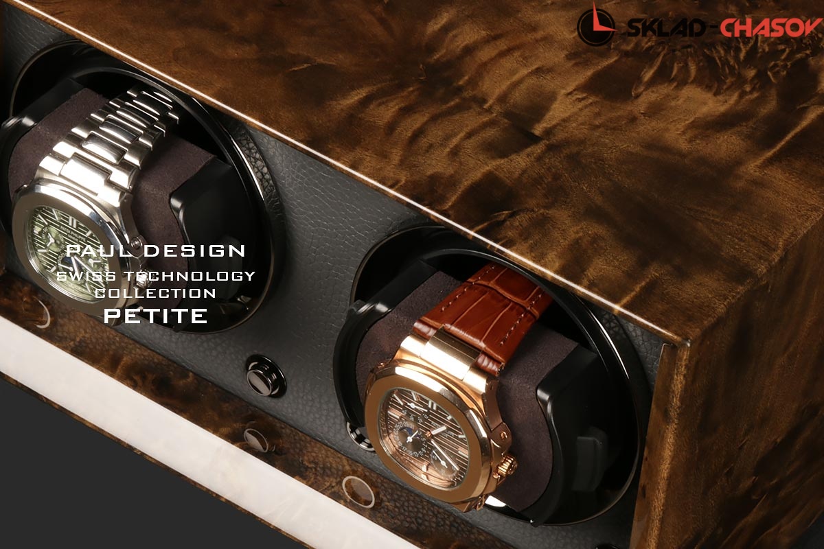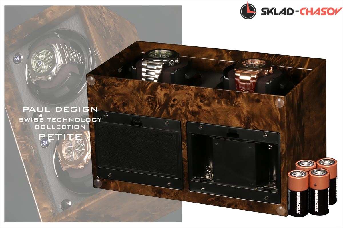 Новейшая модель создана с красивым внешнем дизайном и удобством эксплуатации! Открытая, стильная шкатулка выполнена из коричневого дерева макасар, покрытого рояльным лаком, внутри обшито чёрной кожей, немецкая чёрная фурнитура, удобные телескопические держатели для часов (идеально для любого размера запястья), позволяет подзаводить любые часы — любой сложности (окно показывает выбор регулировки), работа от сети 220 в. и встроенного блока 4 батареек класса С.