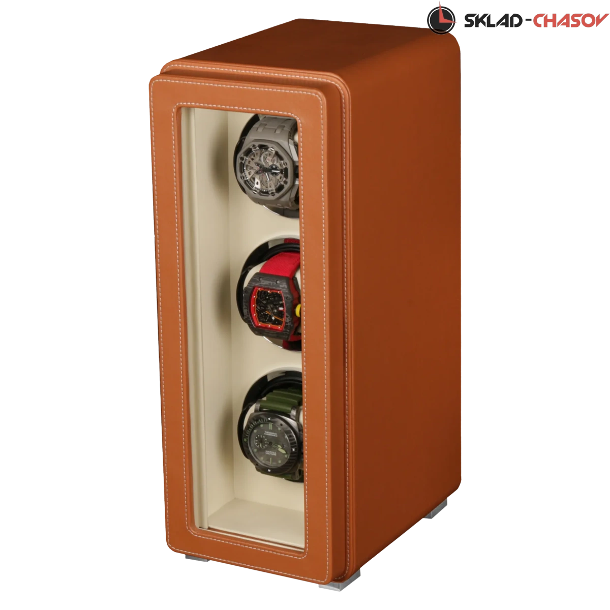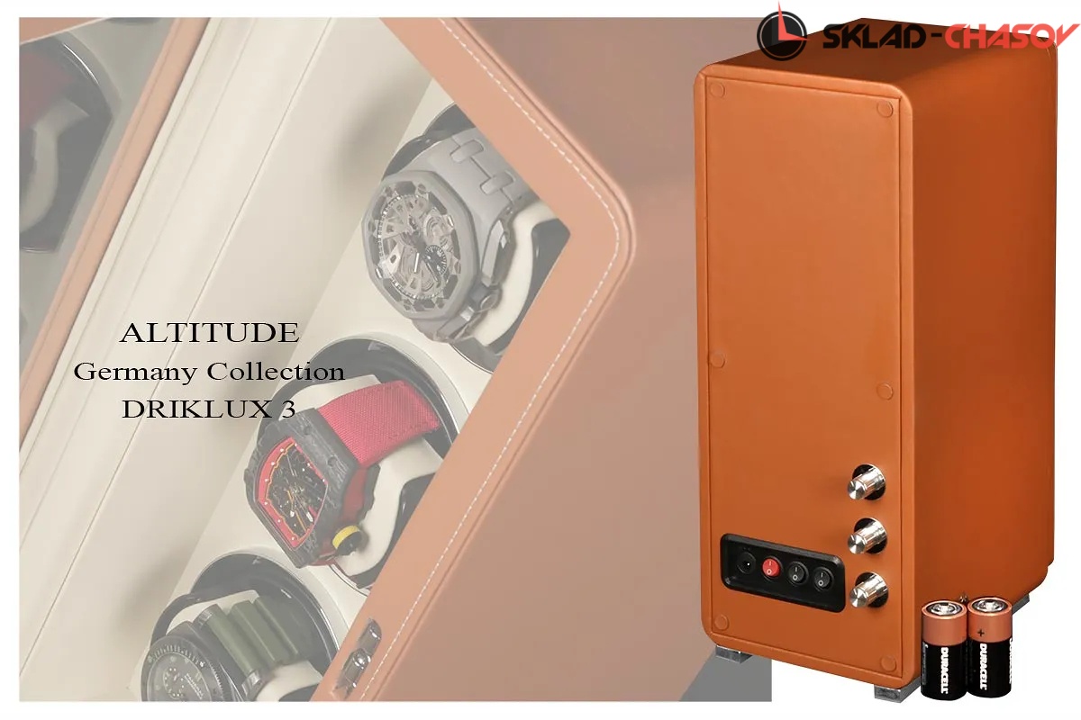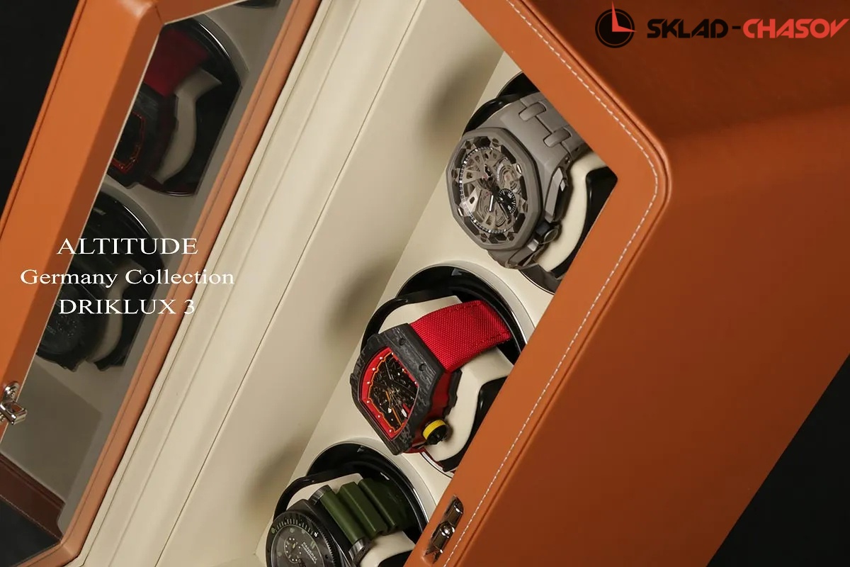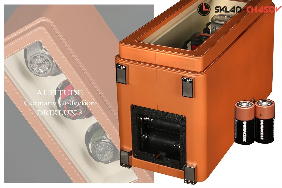 Новая серия шкатулок "Driklux" от немецкого производителя Altitude выполнена из коричневой кожи с белой строчкой, внутри прошито белой кожей с телескопическими держателями, работает от сети 220 вольт или двух батареек. Светодиодная подсветка, металлизированные фирменные ножки, система автостоп при открытии дверцы.