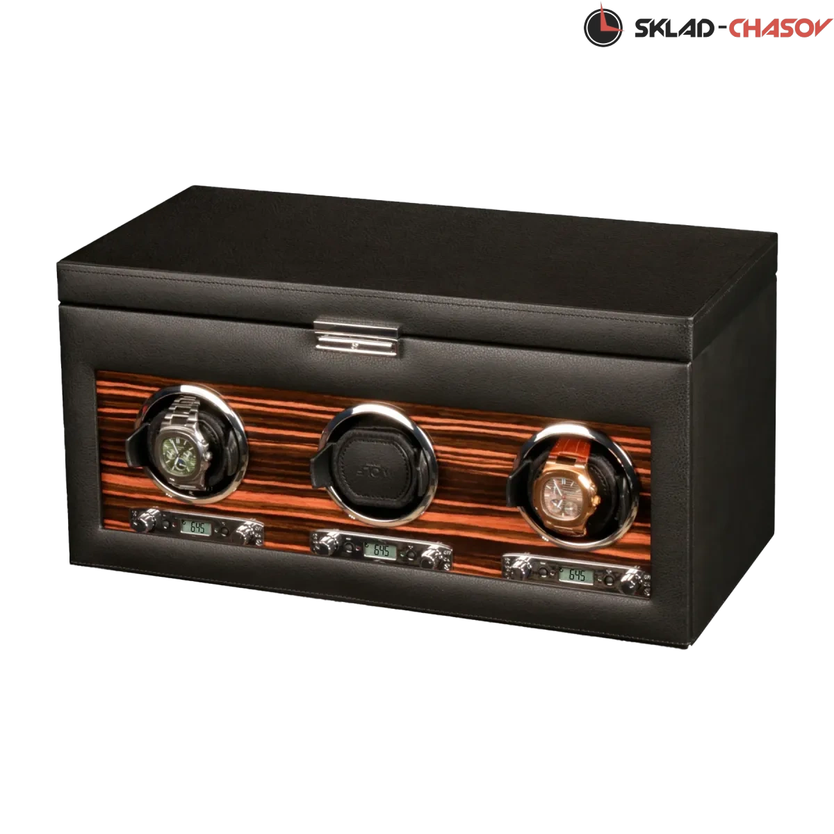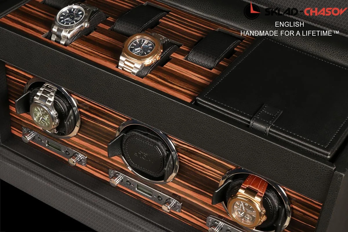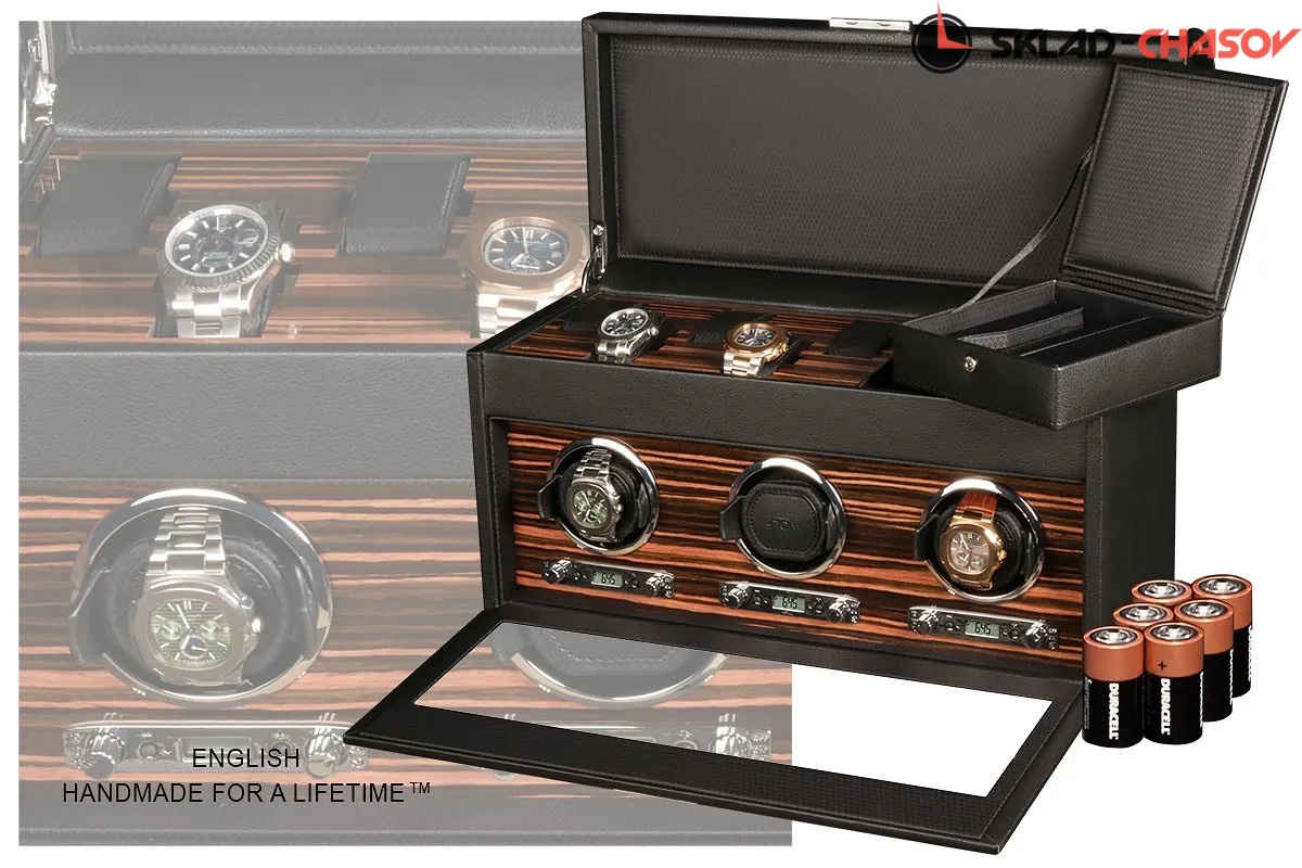 Подзавод 3 часов с удобной телескопической мягкой подушечкой, фиксируется с вашими часами в стакане, сверху дополнительно хранение 5 часов на подушечках из приятного чёрного шелка, а также кожаный чехол для перевозки. Фирменная гарантия от Тайммувер-сервиса 1 год (единственного - аккредитованного сервиса в России, более 17 лет). Фирменная упаковка и коробка (идеально для подарка).