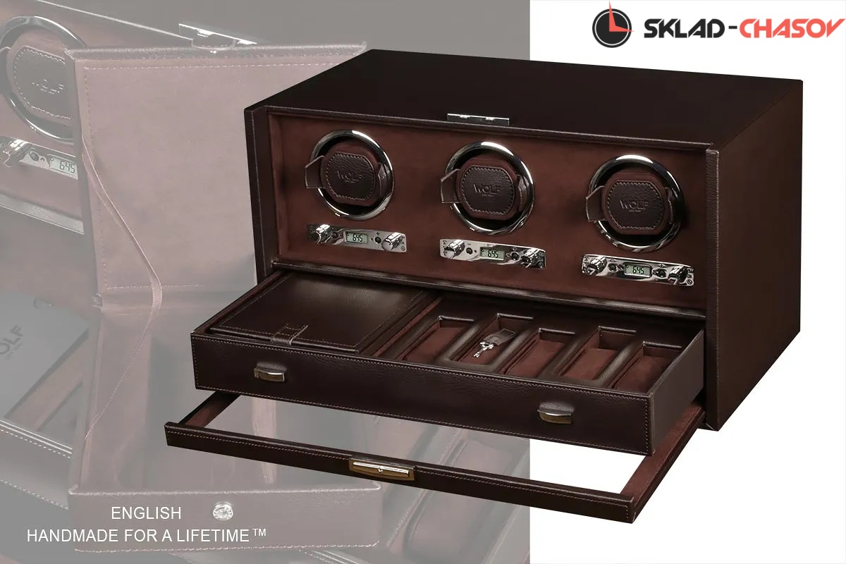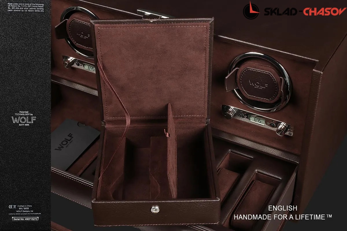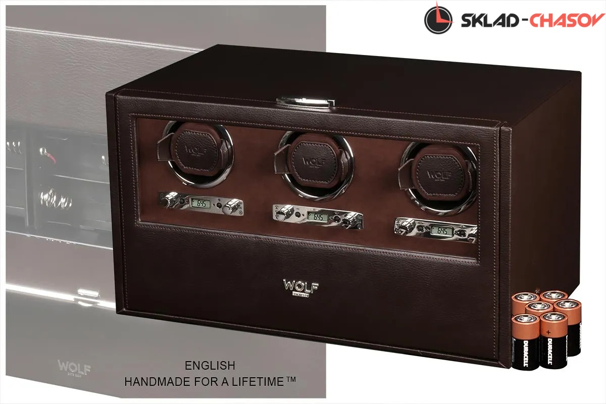 Шкатулка от известного английского "Wolf design" не оставит равнодушным презентабельных и успешных людей, так как выполнена в ручную лучшими мастерами. Корпус из благородной темно- коричневой кожи, внутри замшевая отделка также коричневого цвета. Подзавод трех часов любой сложности, дополнительное пространство для пяти часов и аксессуаров можно найти в неприметном выдвижном ящике, современный держатель для ваших любимых часов с фиксацией. Внешняя дверца с возможностью закрытия на ключик и убирается внутрь корпуса при желании .Каждая шкатулка со своим серийным номером. Работает от сети и от 6 батареек класса "D". Регулируется 3 направления вращения при кол-ве оборотов от 300 до 1200 в сутки. Возможность фиксации на ключик. Отложенный старт механизма 10 секунд. Гарантия 1 год. Фирменная подарочная чёрная коробка.