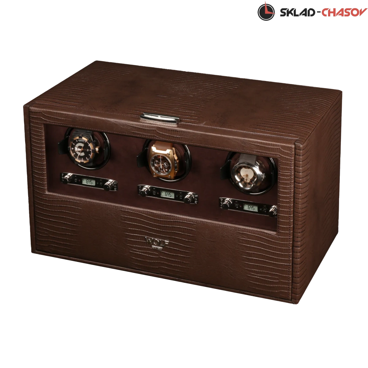 Модель "Braun triple". Шкатулка от известного английского и старинного бренда "Wolf design" не оставит равнодушным презентабельных и успешных людей, так как выполнена в ручную лучшими мастерами. Корпус из темно-коричневой кожи под "рептилию", внутри отделка бархатом "премиум" коричневого цвета. Подзавод трех часов любой сложности, а также хранения 5 наручных часов, удобный и переносной футляр для хранения одних часов и карманчик, современный держатель для ваших любимых часов с фиксацией коричневого цвета. Каждая шкатулка со своим серийным номером. Верхний крышку можно закрывать на ключик , а также убирать во внутрь корпуса. Работает от сети и от 6 батареек класса "D". Регулируется 3 направления вращения при кол-ве оборотов от 300 до 1200 в сутки. Отложенный старт механизма 10 секунд. Гарантия 18 мес. Фирменная подарочная чёрная коробка. Удобный современный держатель для ваших любимых часов с логотипом WOLF. Корпус из темно-коричневой кожи под "рептилию", внутри отделка бархатом "премиум" коричневого цвета.
