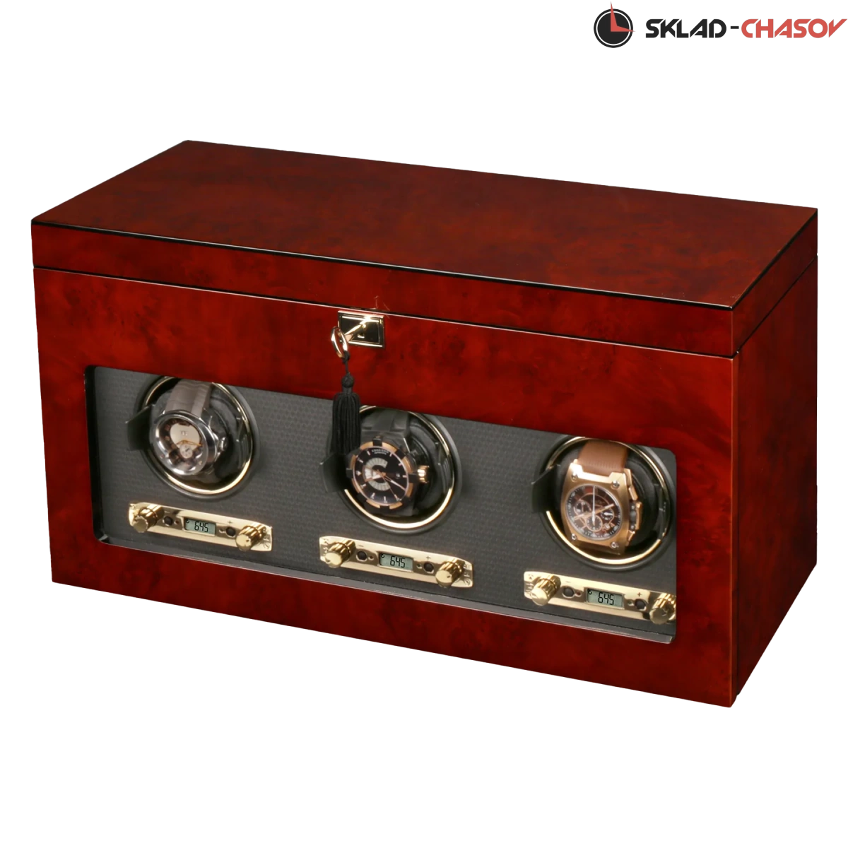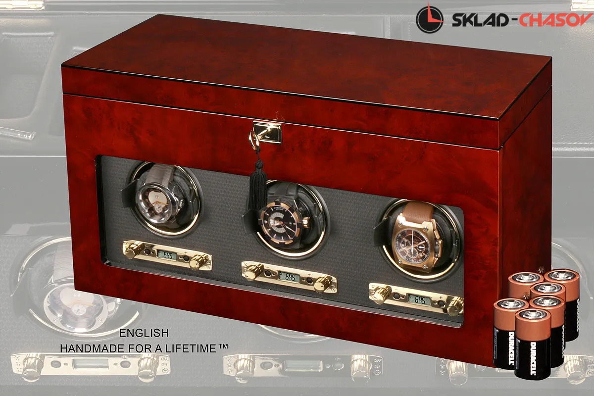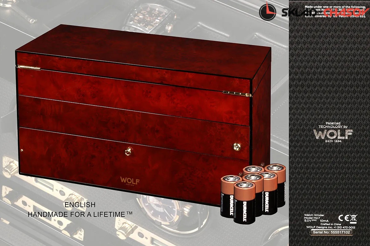 Модель "Savoy3". Шкатулка от известного английского и старинного бренда Wolf не оставит равнодушным презентабельных и успешных людей, так как выполнена в ручную лучшими мастерами. Корпус из коричневого дерева "тополь", внутри отделка износостойким шёлком. Подзавод трех часов любой сложности, а также в верхнем ящике хранение 5 часов и футляр для переноски одних часов с отделением, современный держатель для ваших любимых часов с фиксацией. Внешняя дверца с возможностью закрытия на ключик. Каждая шкатулка со своим серийным номером. Работает от сети и от 6 батареек класса "D". Фирменная подарочная чёрная коробка. Удобные классические держатели для наручных часов с логотипом WOLF. Мягкая подушка черного цвета.