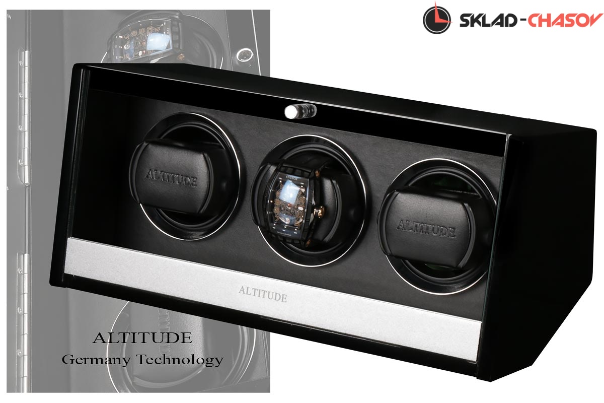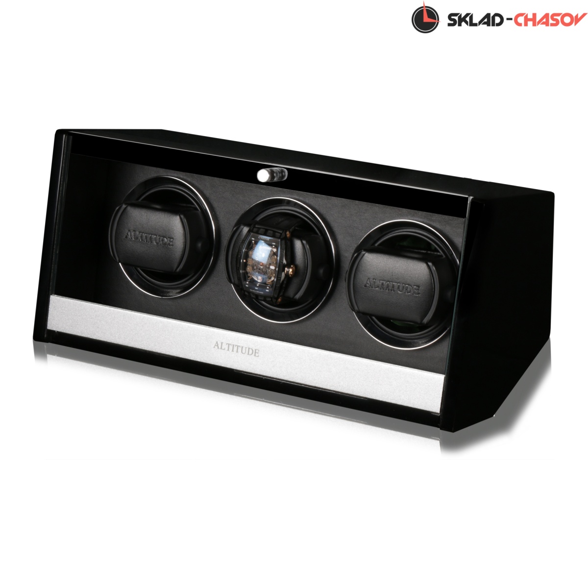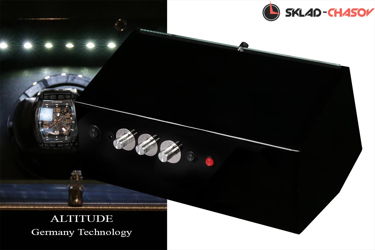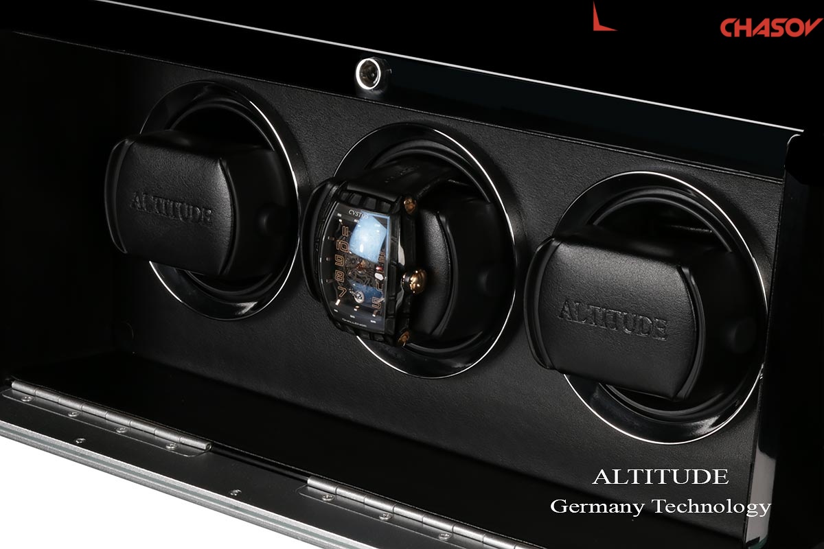 Экстерьер шкатулки выполнен из благородного черного дерева «венге», стекла и полированного металла. Декоративная панель:Деревянные элементы покрываются множественными слоями рояльного лака. Внутренние поверхности выстлана эко-кожей чёрного цвета. "Стакан" аллюминиевый. Светодиодная подсветка с функцией включения/выключения. Основное предназначение шкатулки — автоматических независимый подзавод 3 часов любой сложности.