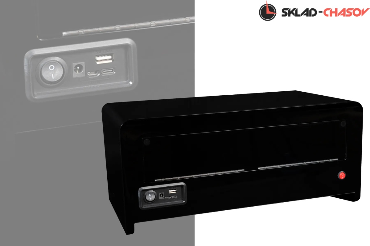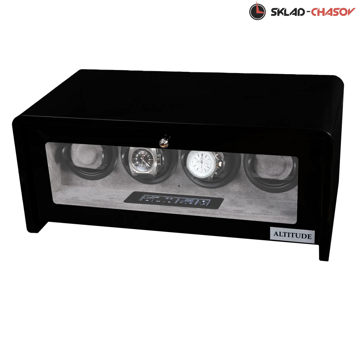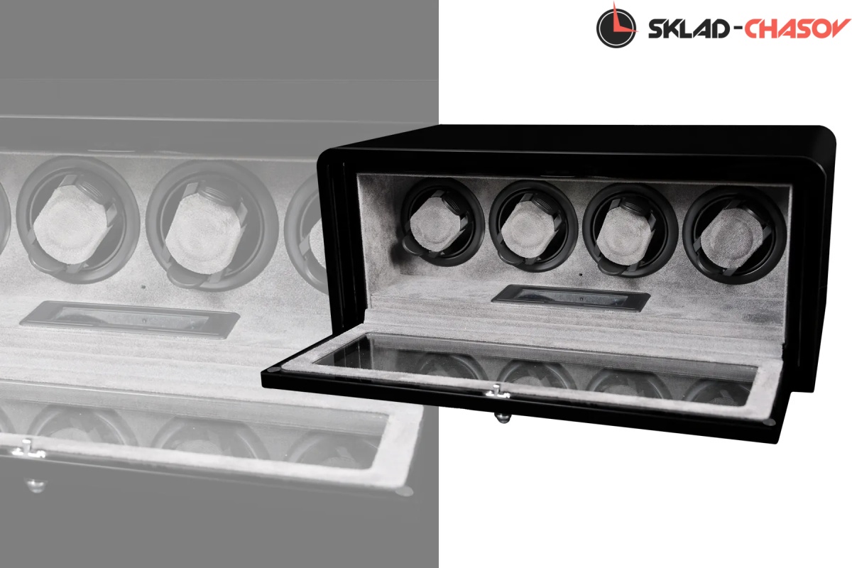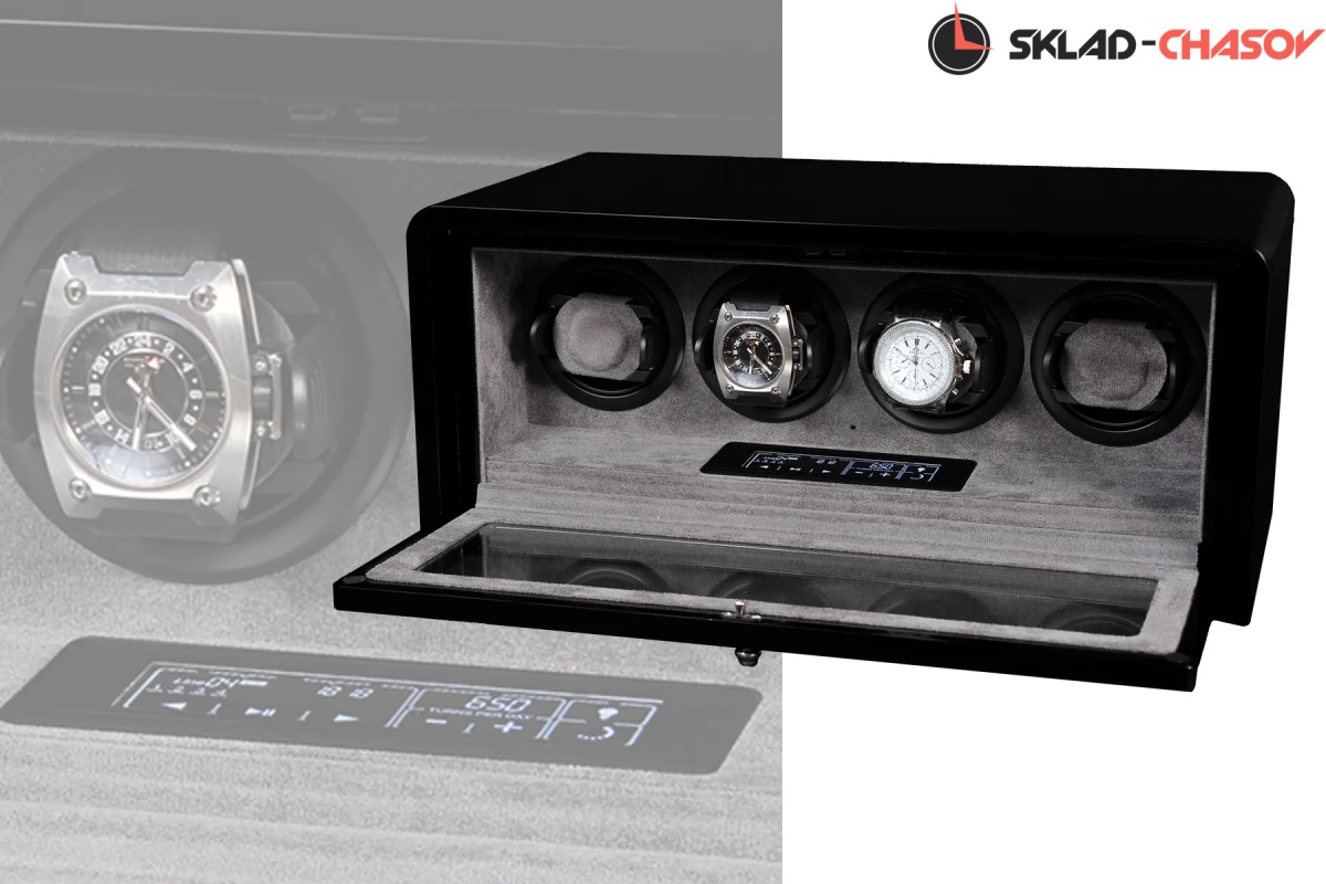 Новая модель "Times". Шкатулка выполнена из чёрного дерева венге, покрыта 15 слоями лака. Внутри выстлана темно-серой микрофиброй, удобные телескопические держатели, крышка открывается вниз, натуральное стекло. Электронное табло позволяет отдельно настраивать все возможные регулировки - для любых часов! Количество оборотов в сутки от 600-1800, 3 варианта направления вращения.