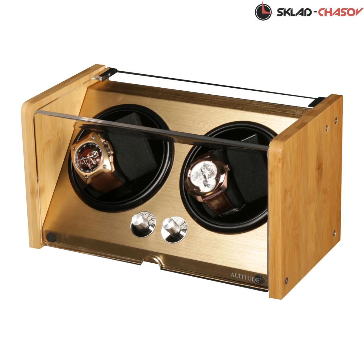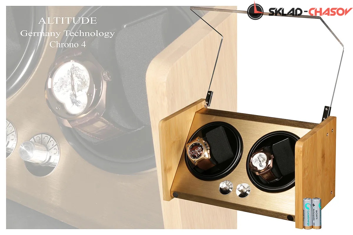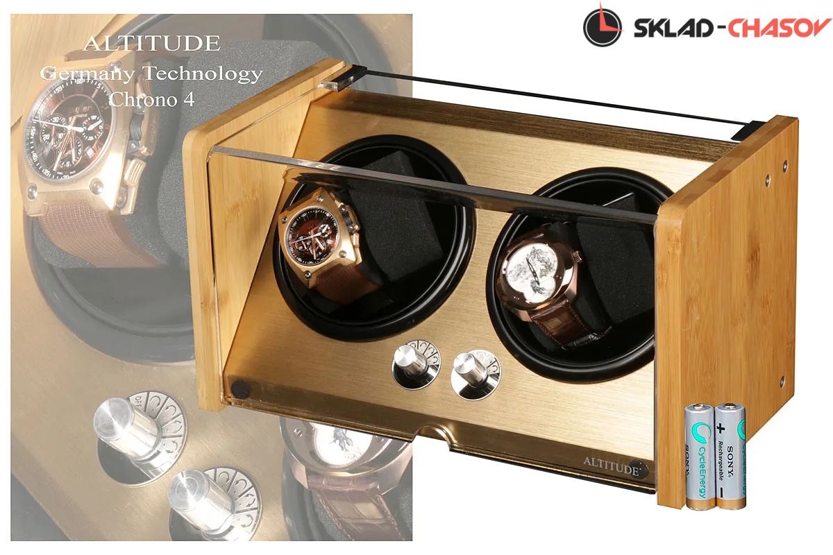 Модель "Chrono4”. Шкатулка для подзавода 4-х наручных часов в двух стаканах с мягкими держателями, выполнена из светлого дерева "клён", внутри алюминий золото цвета, изогнутое стекло для видимости ваших часов. Регулируется количество оборотов от 850-2000 оборотов в сутки, и 3 направления вращения. Работа от сети 220 вольт и 2 батареек АА.