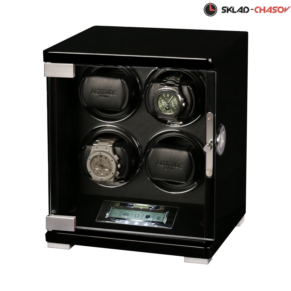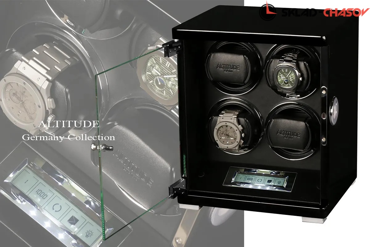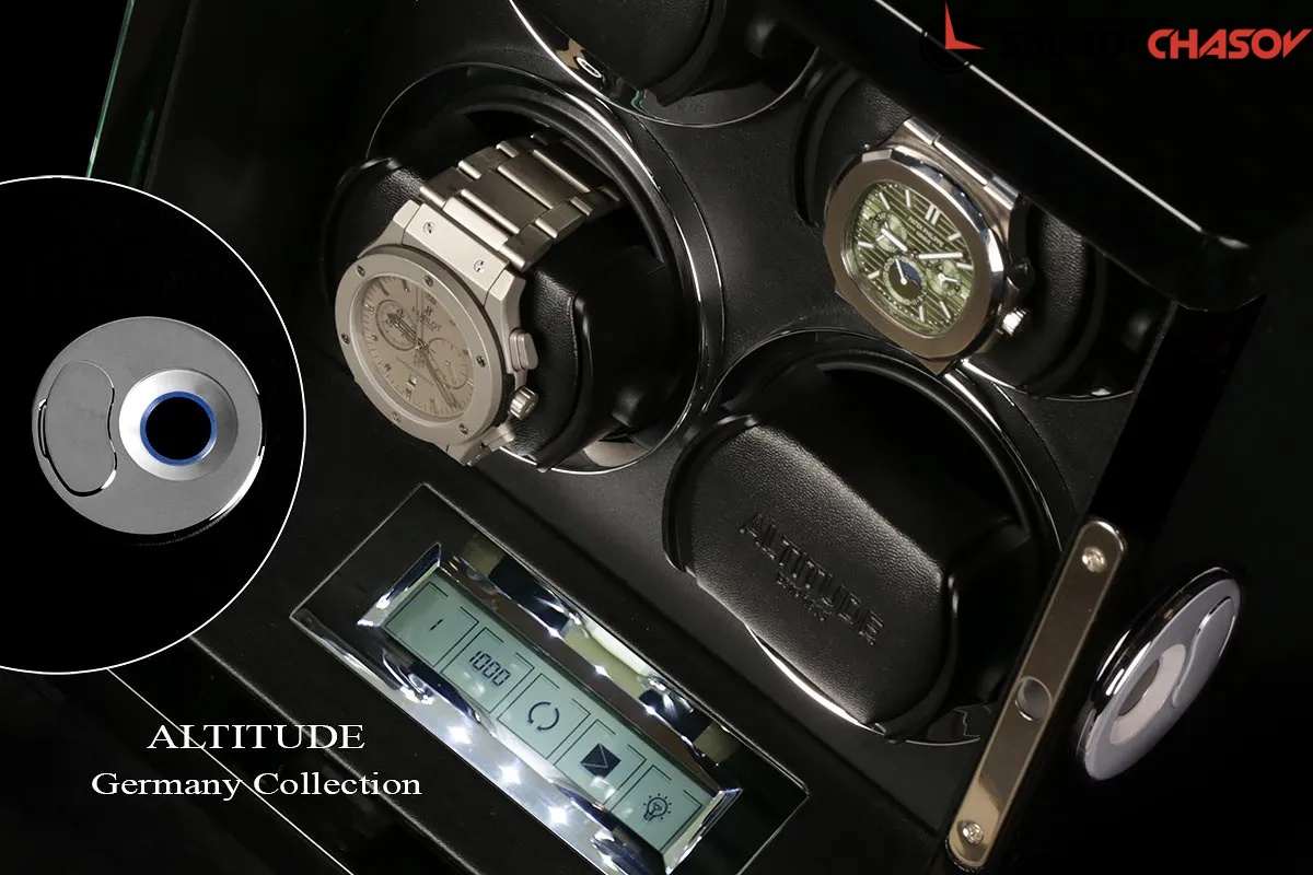 Новая серия шкатулок “Diamond“. Удобная и популярная на сегодняшний день система открывания с помощью отпечатка пальца (возможность программирования более 5 разных отпечатков). Черное дерево «венге» покрыто 15 слоями рояльного лака, натуральное стекло, внутри прошито чёрной кожей, есть удобный тачскрин дисплей, позволяет выбрать нужные для ваших часов регулировки направления вращения (3 варианта) и количество оборотов в сутки (600/750/100/1800). Для любых часов - любой сложности. Система автостоп - при открытие дверцы, моторы останавливаются. Самые удобные держатели для часов, идеальна регулировка под ваше большое или маленькое запястье. Возможность вкл/ выкл на задней части шкатулки.
