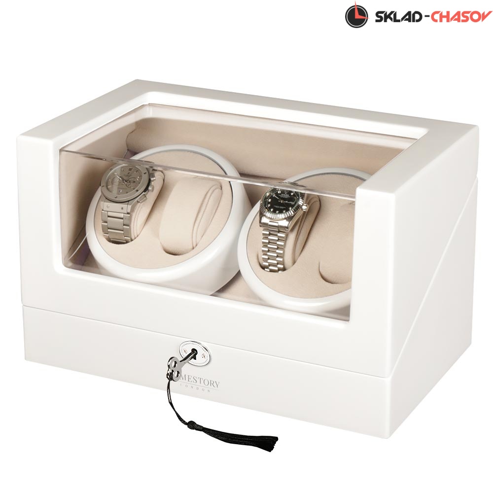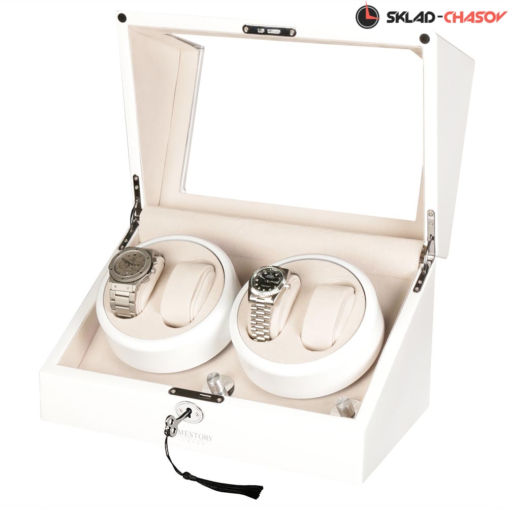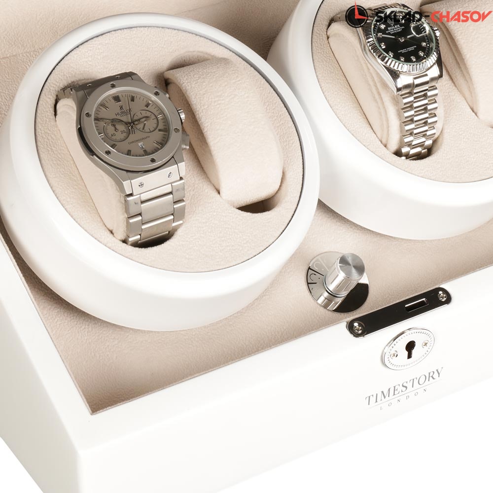 В экстерьере используется дерево Макассар, покрытое множественными слоями высококачественного белого глянцевого лака. Для максимальной простоты в использовании автоподзавод включается всего с одной кнопки на задней стороне бокса. Истинные ценители часов оценят четыре режима подзавода в шкатулке, управляемые на торцевой части рядом с крутящимся кольцом. Продуманная система выбора режимов вращения сможет завести любые часы любой сложности. Достаточно просто повернуть тумблер на нужный режим, и часы будут автоматически подзаводиться. Для ночной видимости часов, в шкатулке встроена приятная светло-синяя светодиодная подсветка под кольцом подзавода, включающаяся с кнопки на задней стороне.