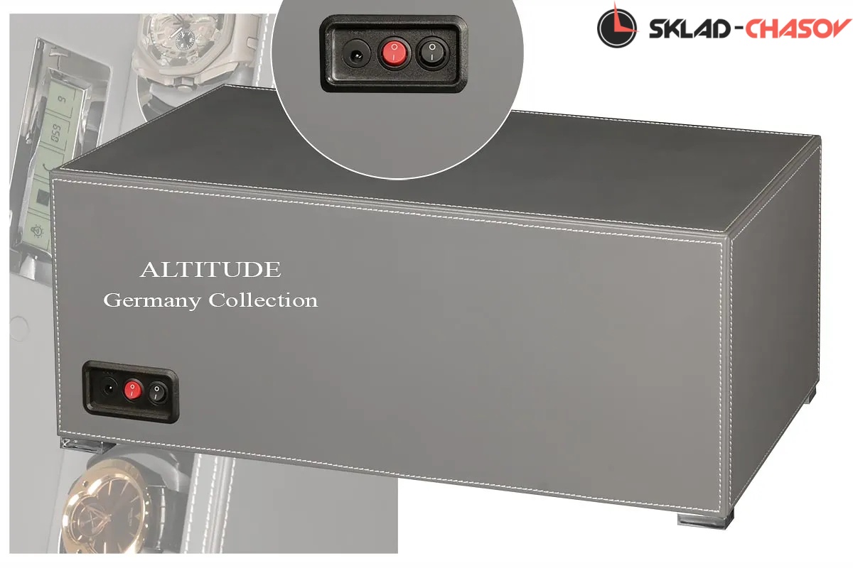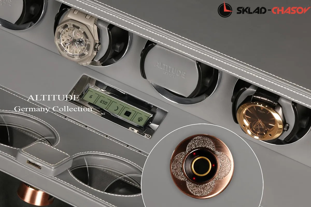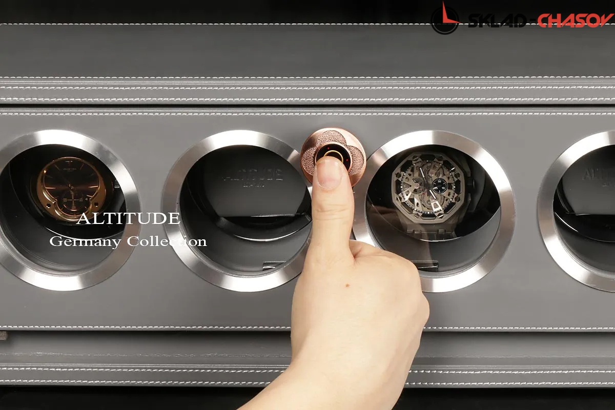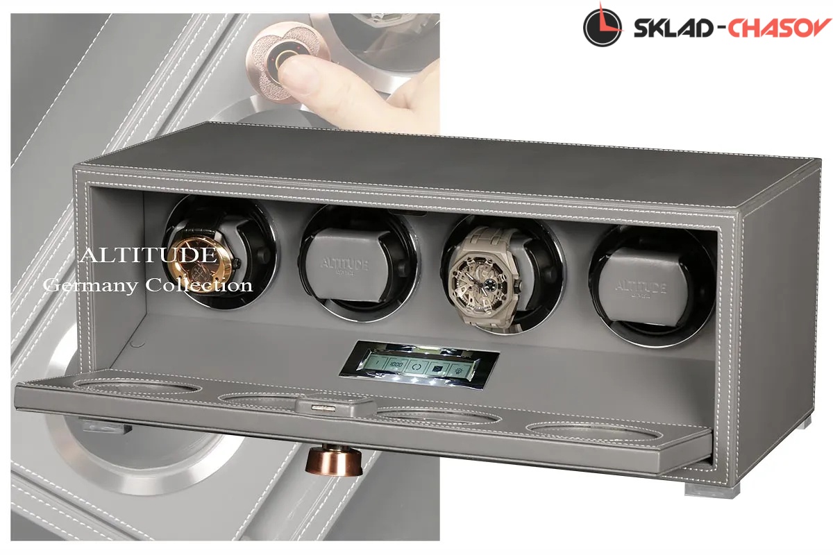 Подзавод отдельно для каждых из четырёх часов. Новая серия шкатулок с отпечатком пальца (память на 5 владельцев) серия "Driklux" от немецкого производителя Altitude выполнена из серой кожи с белой строчкой, внутри прошито серой кожей в цвет корпуса, телескопические держатели (идеально подходящих для больших и малых запястьев), работает от сети 220 вольт. Светодиодная подсветка, металлизированные фирменные ножки, система автостоп при открытии дверцы. Регулируется направления вращения в трёх вариантах и количество оборотов в сутки 600/750/1000/1800.