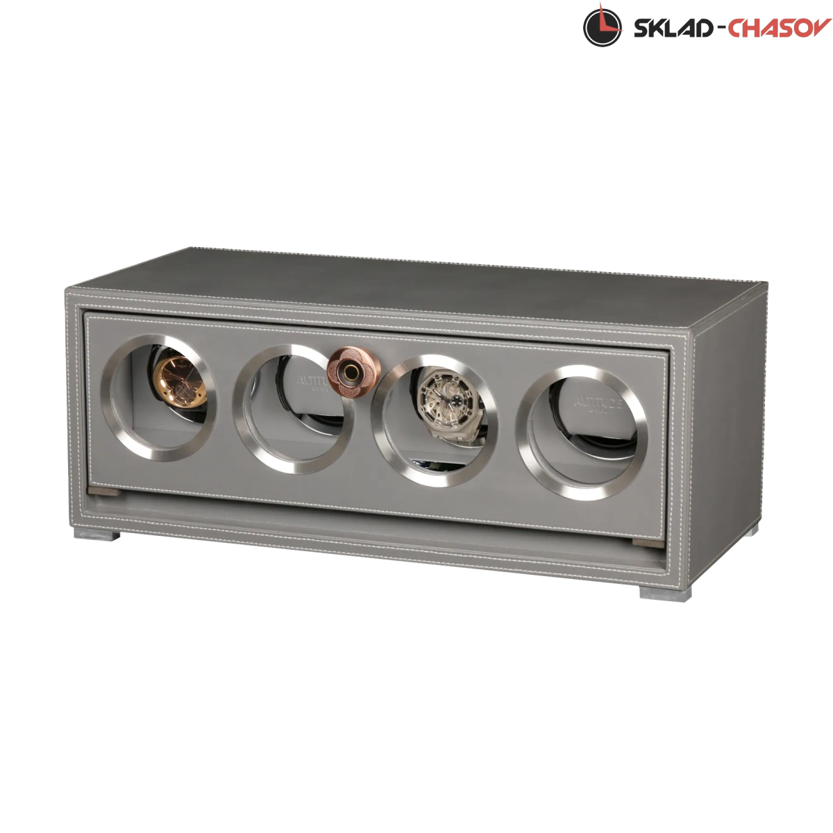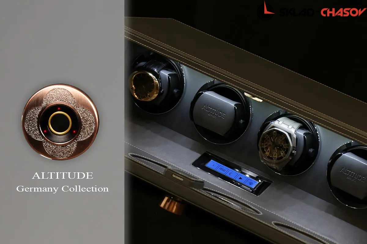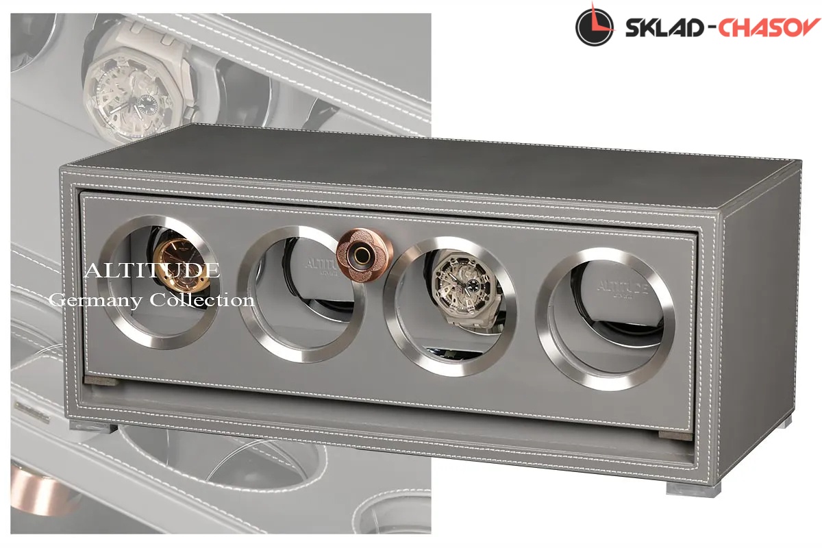 Подзавод отдельно для каждых из четырёх часов. Новая серия шкатулок с отпечатком пальца (память на 5 владельцев) серия "Driklux" от немецкого производителя Altitude выполнена из серой кожи с белой строчкой, внутри прошито серой кожей в цвет корпуса, телескопические держатели (идеально подходящих для больших и малых запястьев), работает от сети 220 вольт. Светодиодная подсветка, металлизированные фирменные ножки, система автостоп при открытии дверцы. Регулируется направления вращения в трёх вариантах и количество оборотов в сутки 600/750/1000/1800.