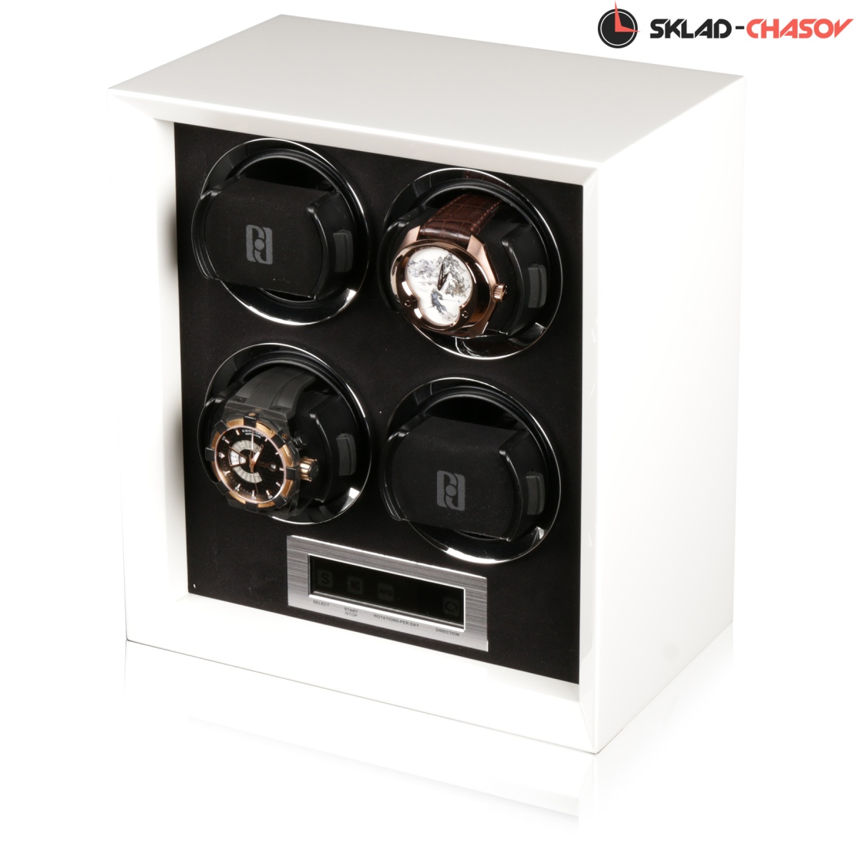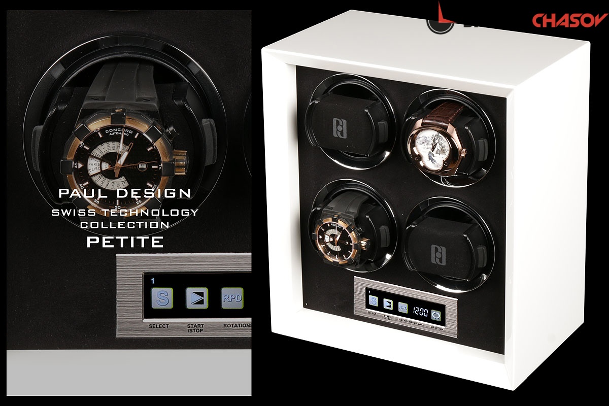 Шкатулка нового поколения ,для бережного подзавода 4-х часов ,не большого размера для удобства использования и перемещения,выполнена из белого дерева ,открытый доступ к вашим часам ,внутри выстлана чёрной микрофиброй ( материал удобен для очистки от загрязнений), возможность встраиваемости в сейф или гардеробную, металлические колечки вокруг держателя последнего поколения ,которые идеально регулируется под маленькие и большие браслеты а также фиксируются внутри стакана, держатель с каучуковой основой , независимые моторы с регулировкой 3-х направлений вращения и выбора количества оборотов 600,900,1200,1500,1800,2100 в сутки. Удобный и небольшой вариант для подзавода часов в вашей квартире или загородном доме. Фирменная - подарочная упаковка и комплект с карточкой прилагается. Гарантия расширенная 12 мес .