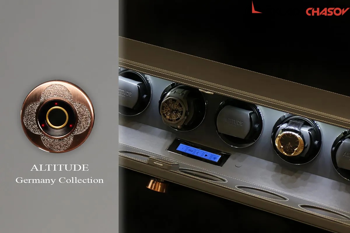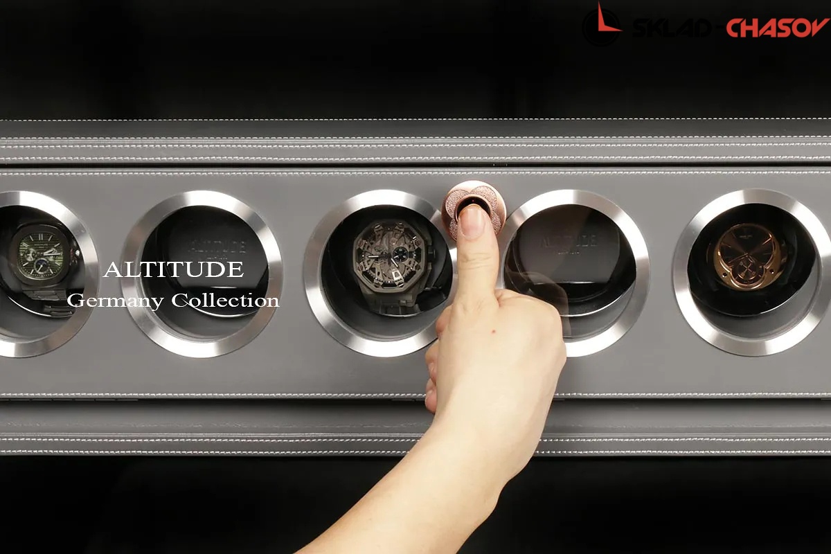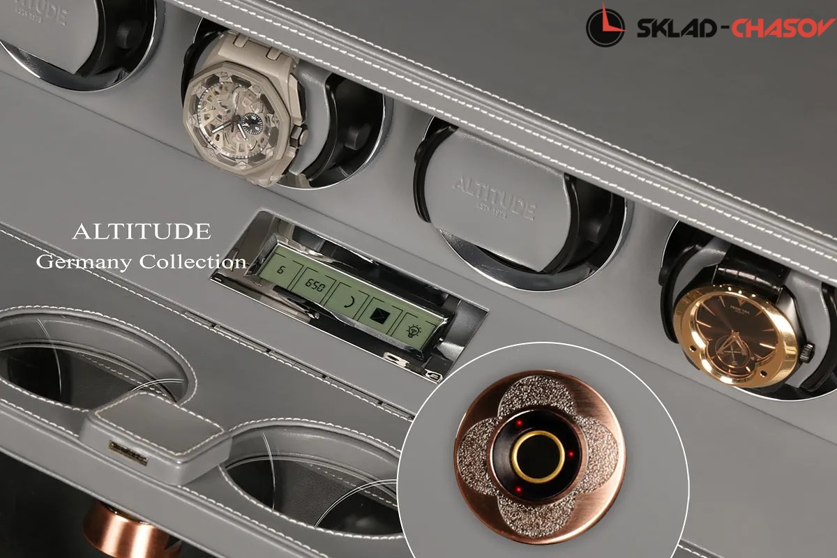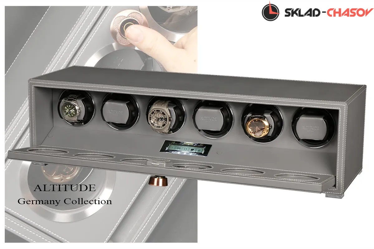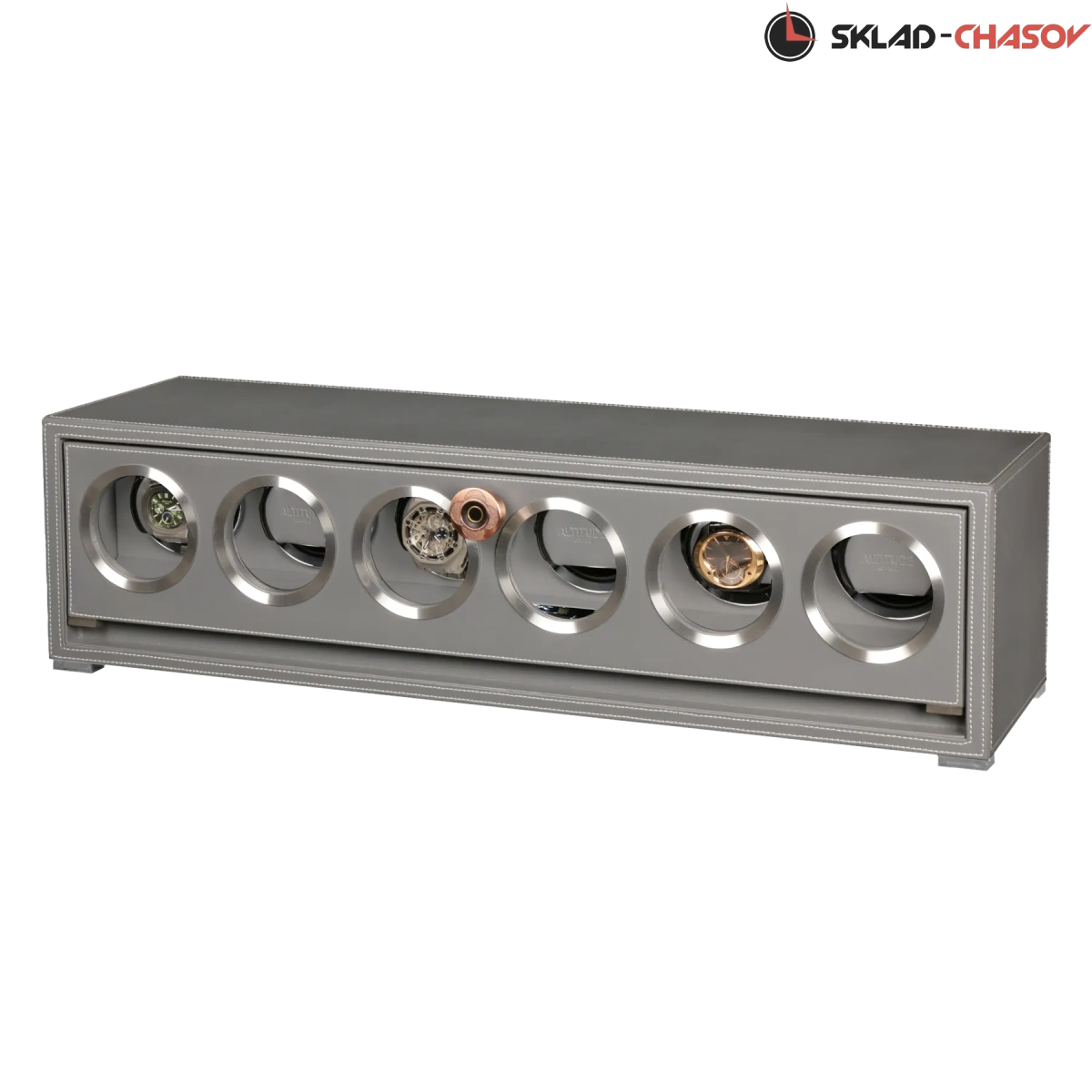 Подзавод отдельно для каждых из шестерых часов. Новая серия шкатулок с отпечатком пальца (память на 5 владельцев) серия "Driklux" от немецкого производителя Altitude выполнена из серой кожи с белой строчкой, внутри прошито серой кожей в цвет корпуса, телескопические держатели (идеально подходящих для больших и малых запястьев), работает от сети 220 вольт. Светодиодная подсветка, металлизированные фирменные ножки, система автостоп при открытии дверцы. Регулируется направления вращения в трёх вариантах и количество оборотов в сутки 600/750/1000/1800.