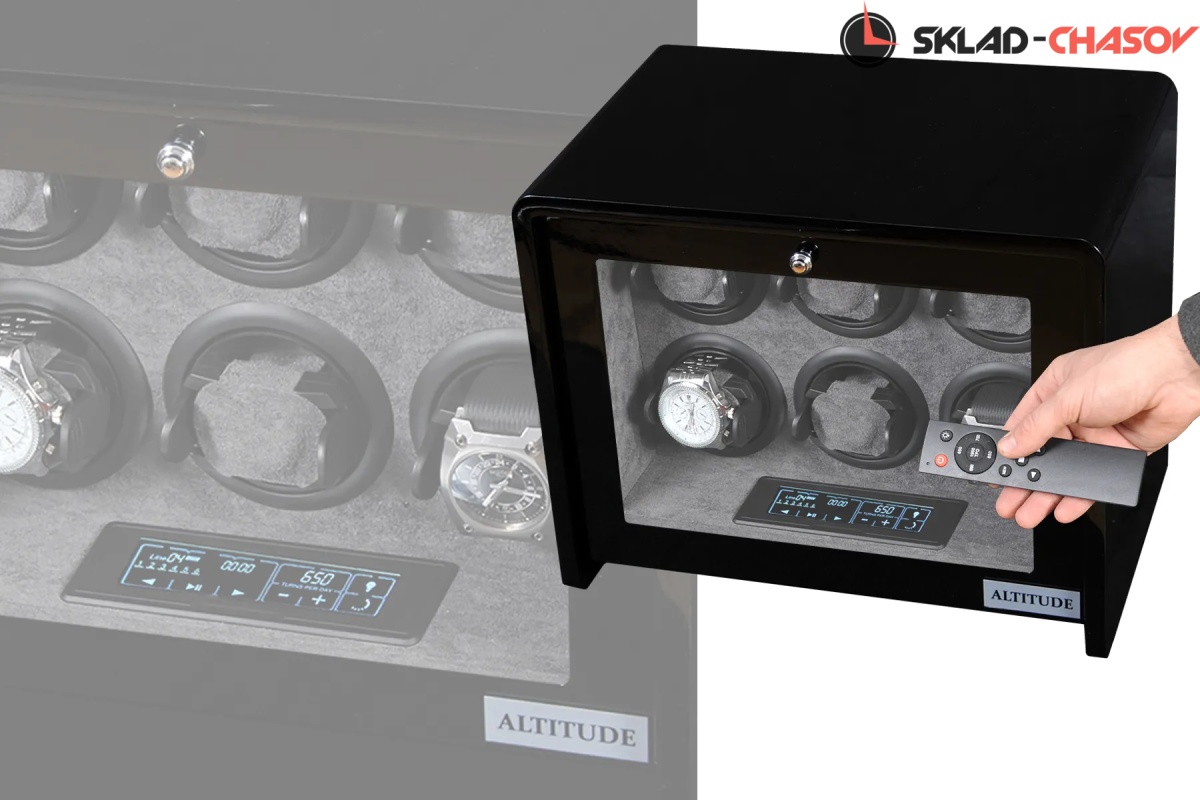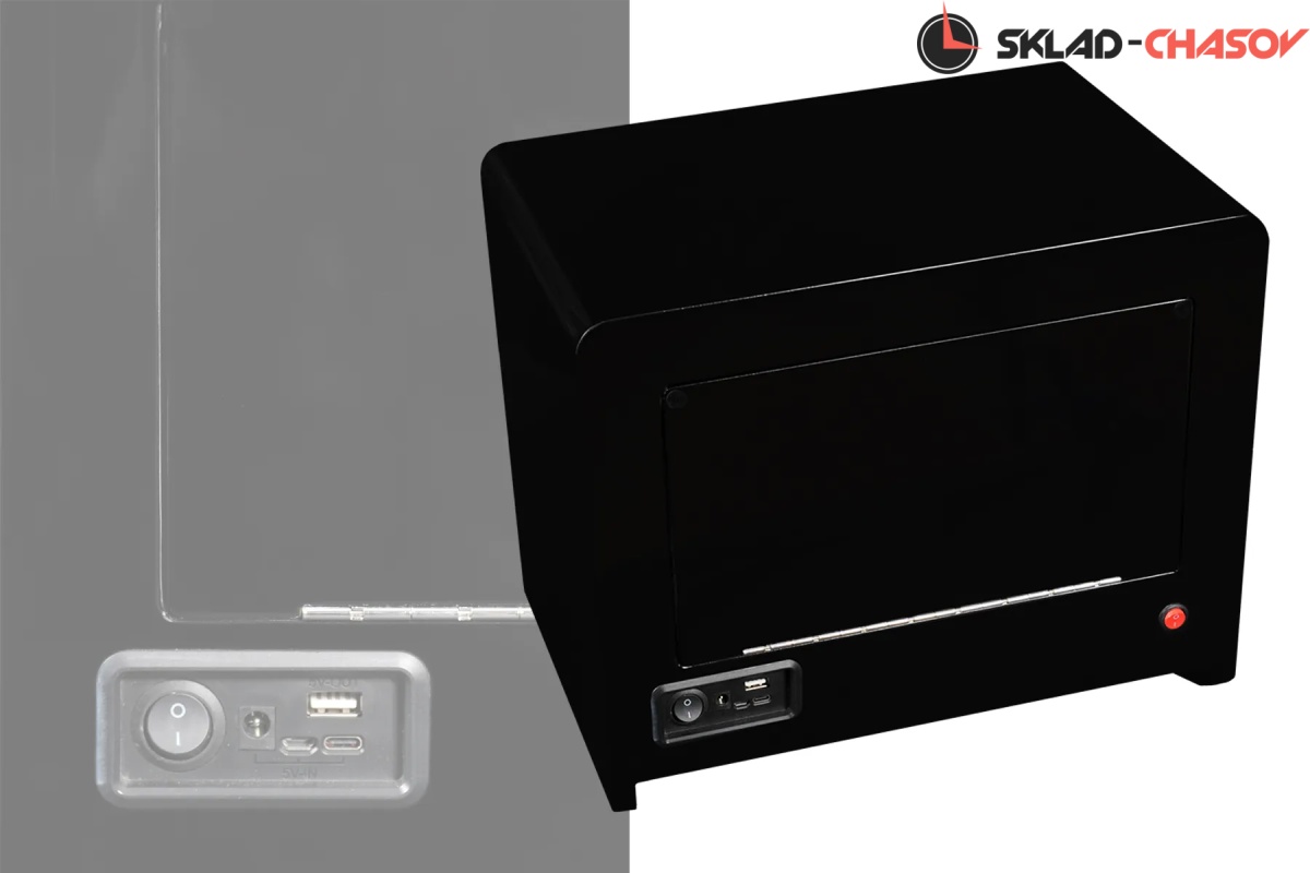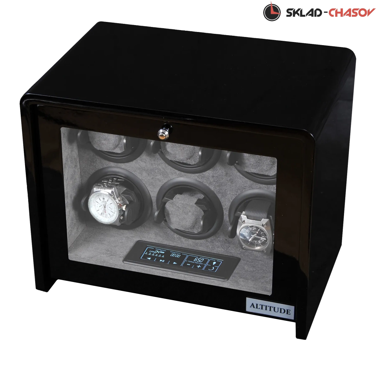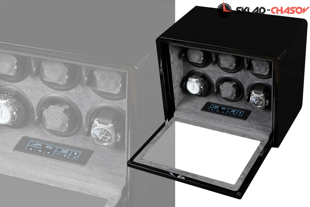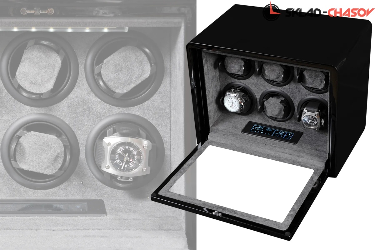 Новая модель "Times6". Шкатулка выполнена из чёрного дерева венге, покрыта 15 слоями лака. Внутри выстлана темно-серой микрофиброй, удобные телескопические держатели, крышка открывается вниз, натуральное стекло. Электронное табло позволяет отдельно настраивать все возможные регулировки - для любых часов! Количество оборотов в сутки от 600-1800, 3 варианта направления вращения. Работает от сети 220 в.
