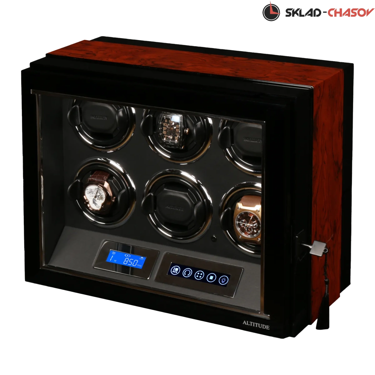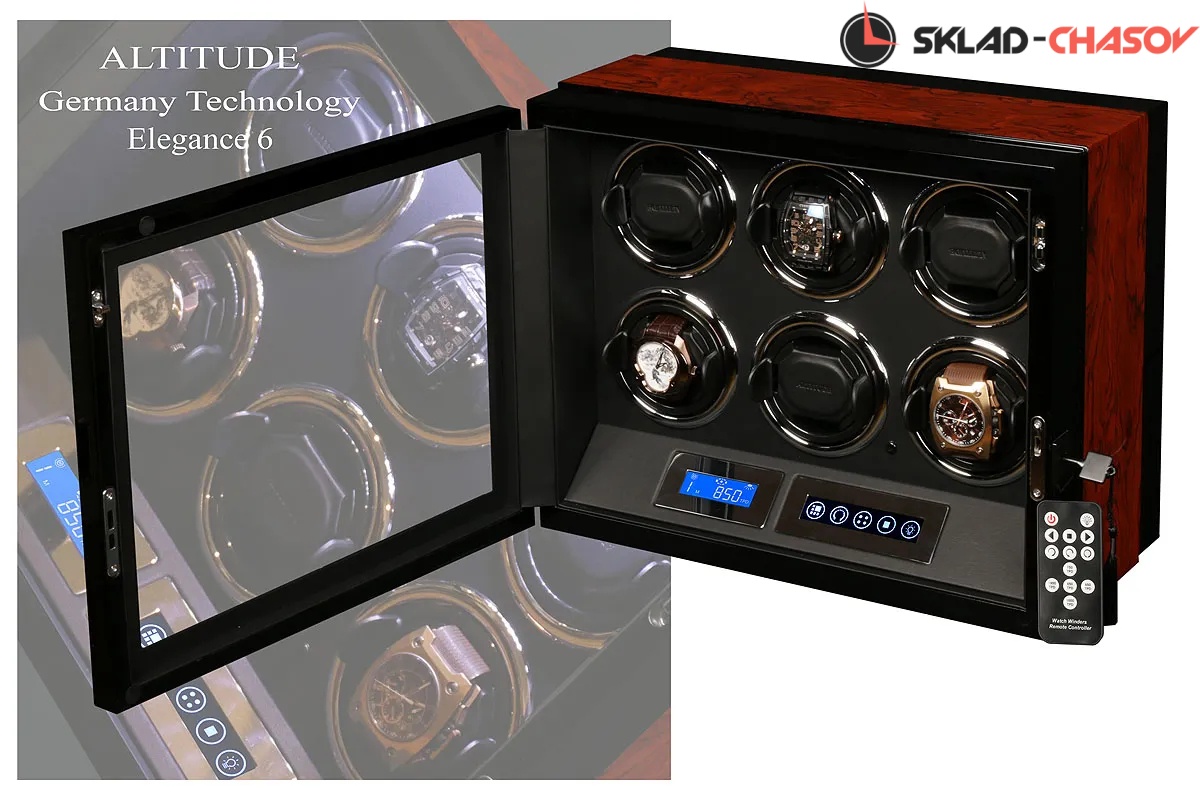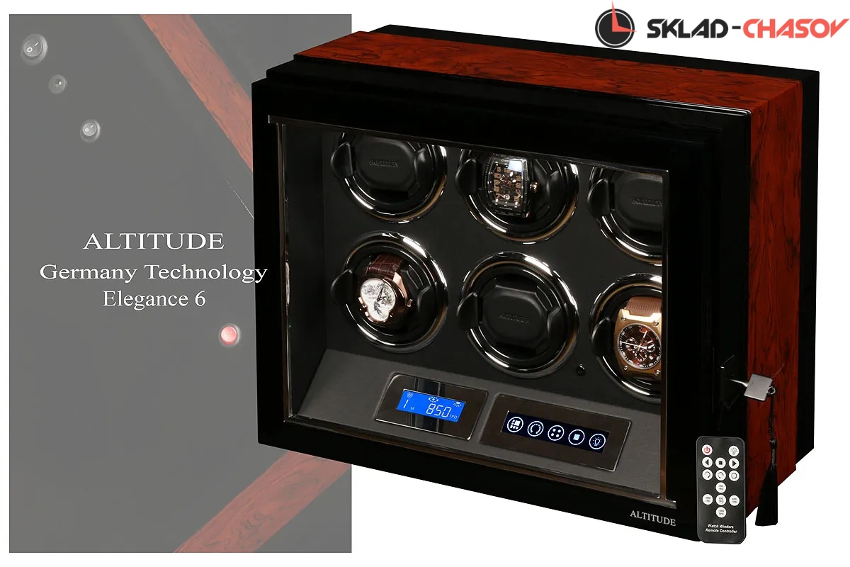 Mодель "Elegance6". Новая модель от немецкого производителя Altitude, выполнена полностью из дерева двух пород (чёрного венге и канадского клёна), внутри выстлана чёрной кожей, новые телескопические держатели, дисплей "touchscreen”, автостоп при открывании дверцы, электронные часы, регулировка количества оборотов в сутки 650/750/850/1000/1950 и выбор из 3-х направлений вращения. Светодиодная подсветка с функцией вкл/выкл. Фирменная гарантия 18 мес. Закрывается на магнитик и при желании на чёрный ключик. Возможность регулировок с помощью пульта. Упакована в белую картонную коробку.