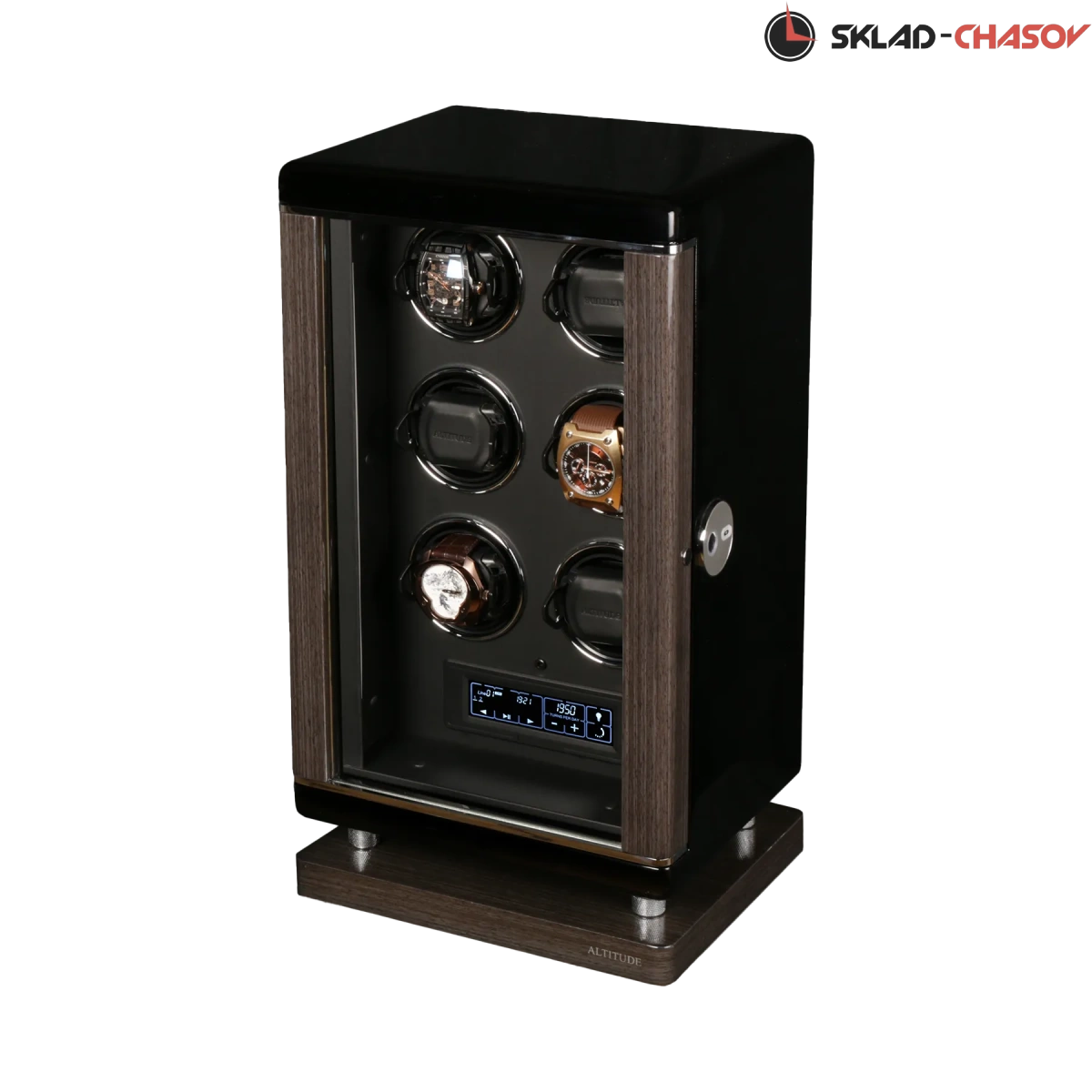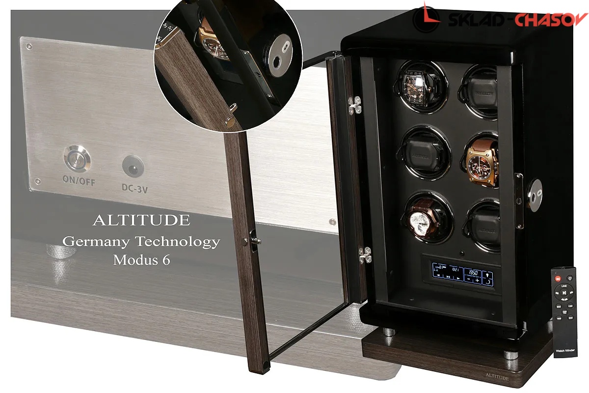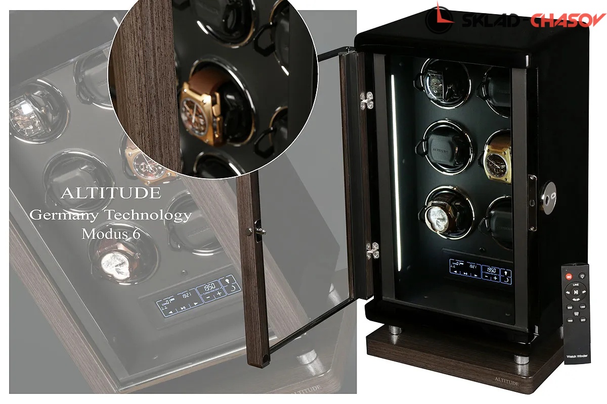 Модель "Modus 6 Vip”. Новая серия шкатулок от известного "Altitude” в лакшери версии для независимого подзавода 6 часов, основное отличие - это качество, технологии открытия от отпечатка пальца, новый "touchscreen” - дисплей с всевозможными регулировками, новое сочетание дерева (темный бамбук и чёрное венге), возможная регулировка с пульта, металлизированные обрамления держателей с функцией фиксации, двухсторонняя светодиодная подстветка, современная система автостоп при открывании, новые расширенные держатели. Выбор направления вращения и количество оборотов от 650/750/850/1000/1950 позволяет подзаводить любые часы - любой сложности. Белая картонная коробка от производителя.