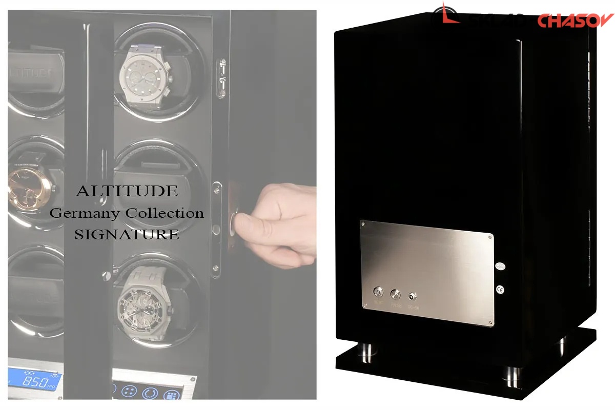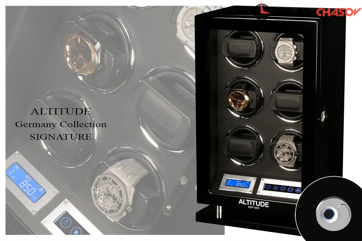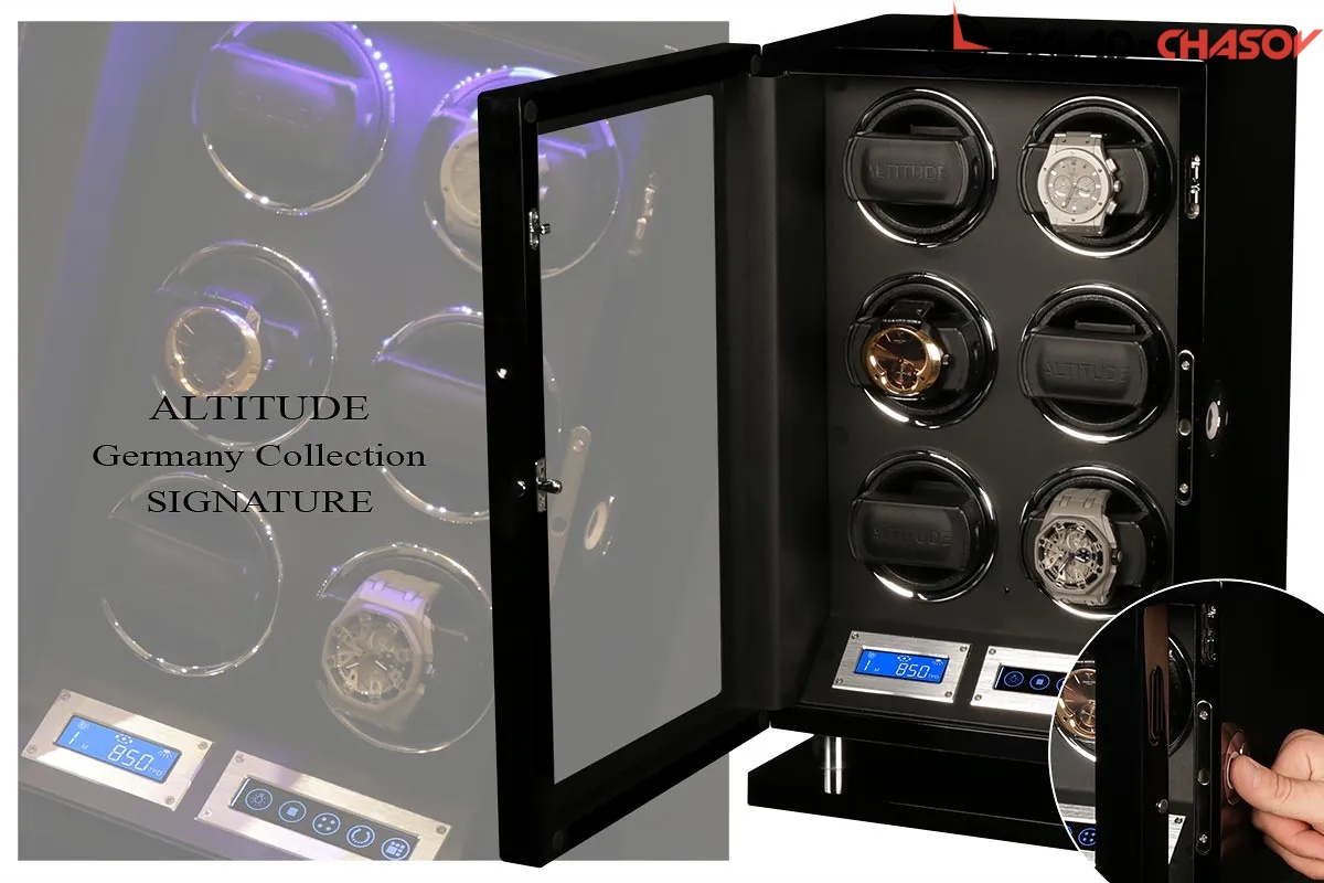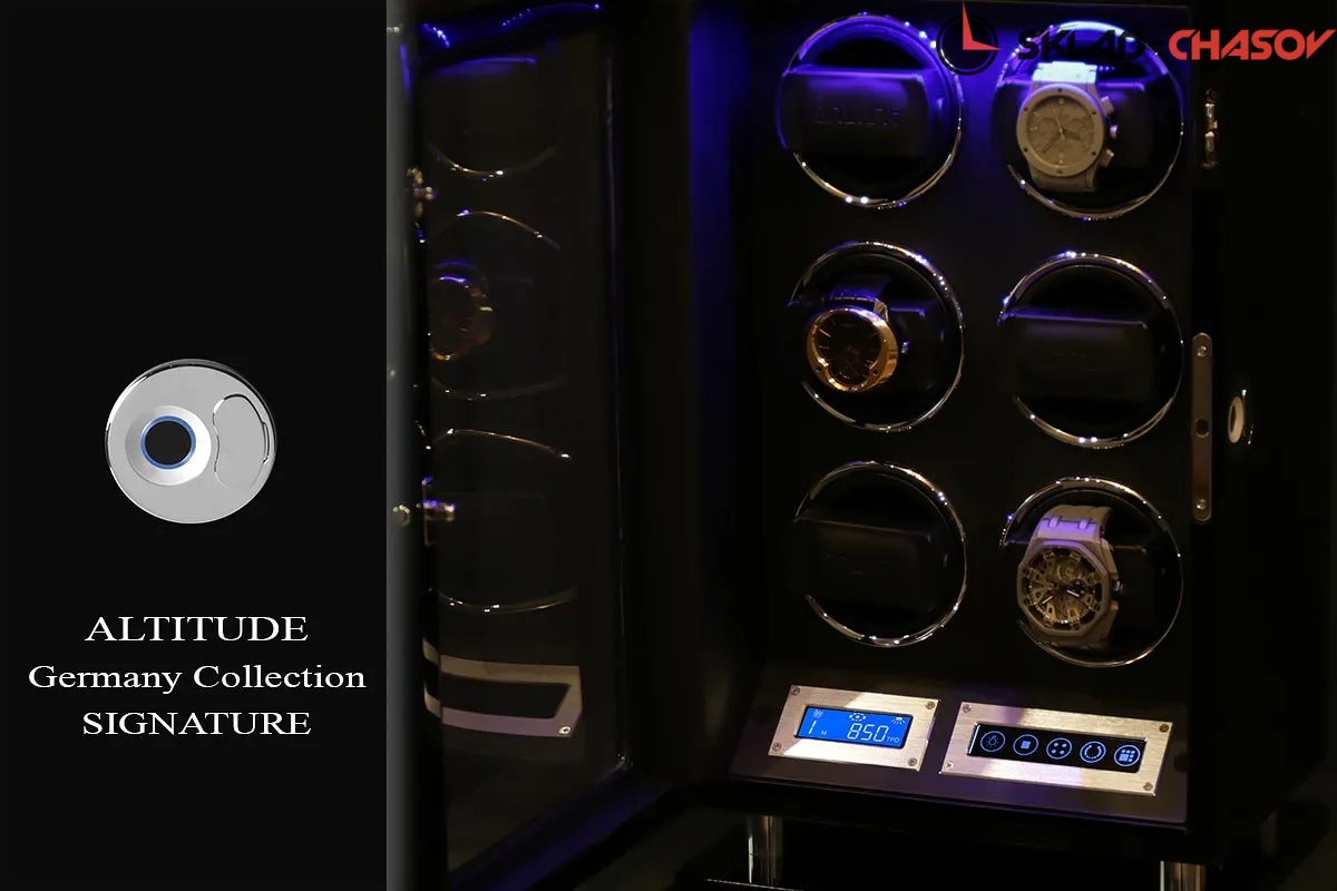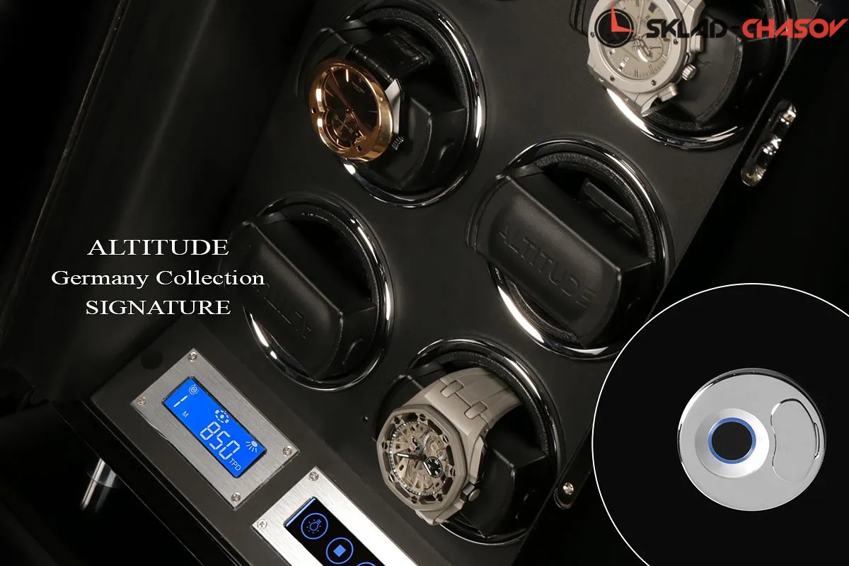 Новая серия шкатулок "Signature“ с отпечатком пальца по очень привлекательным ценам для наших дорогих клиентов, удобно и просто настроить и пользоваться этим инновационным решением от немецких дизайнеров (настроить можно не менее 5 отпечатков), чёрное дерево венге покрыто лаком, внутри выстлано чёрной кожей, два дисплея тачскрин позволяют выставить любое направление вращения механизма, а также количество оборотов в сутки 650/750/850/1000/1950. Включение и выключение светодиодной подсветки на дисплеи. Подзавод каждого из 6 отделений. Удобные телескопические держатели идеально подходят для больших и любых запястьев. Фирменная гарантия 1 год.