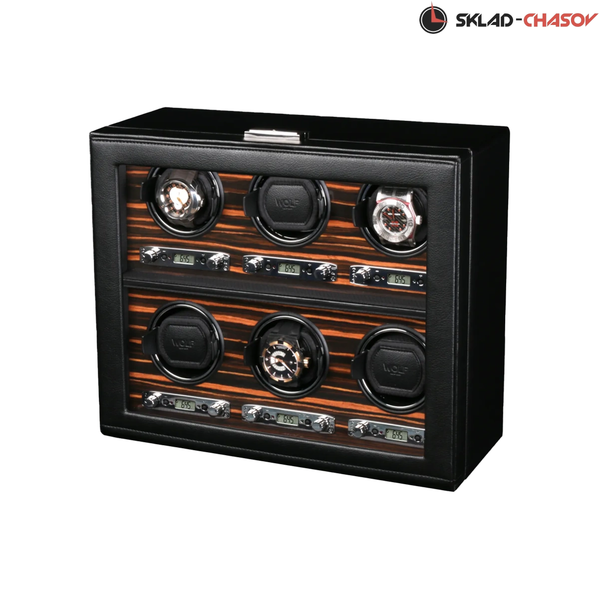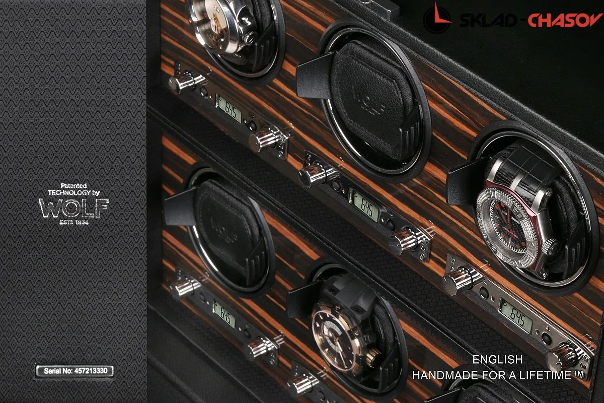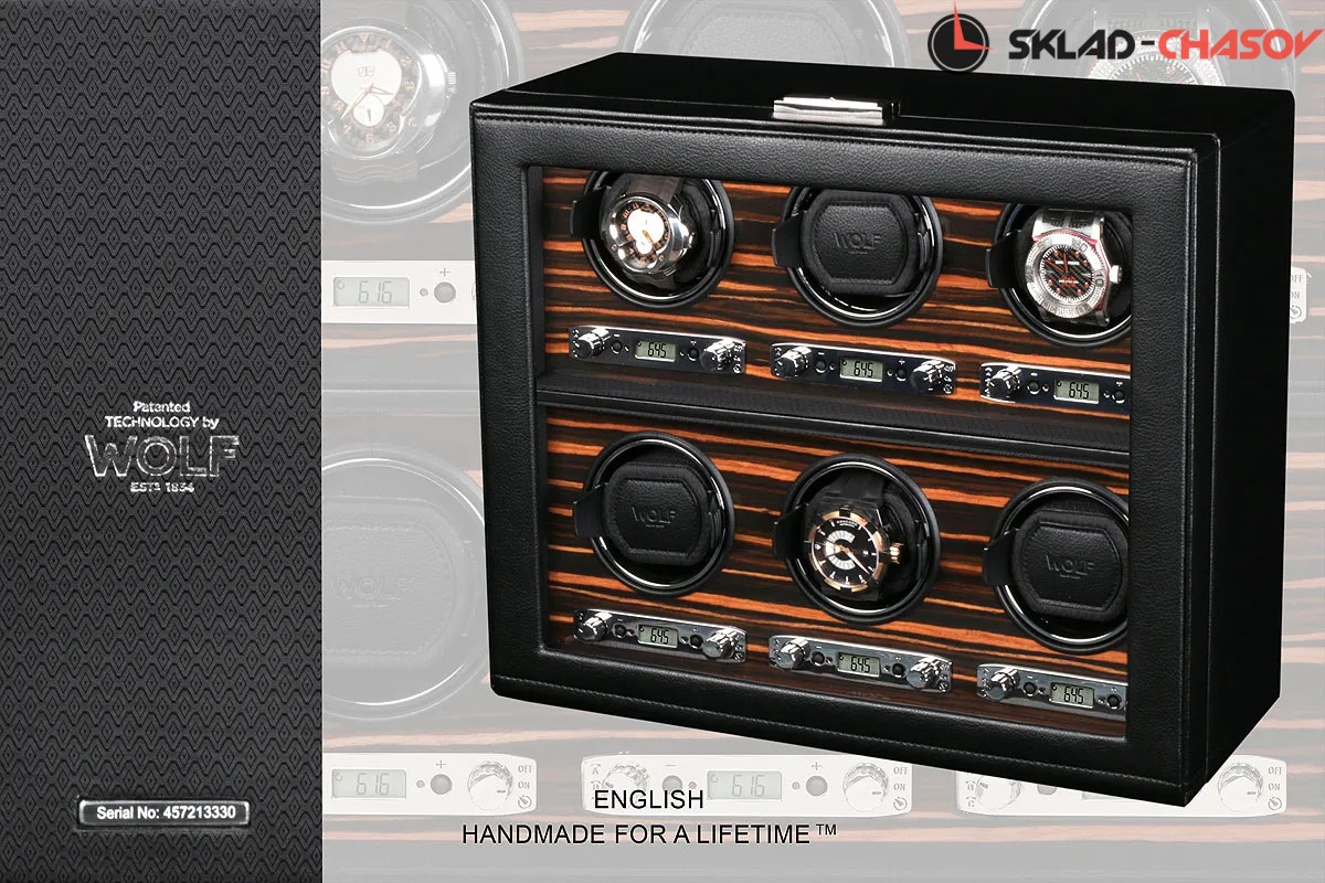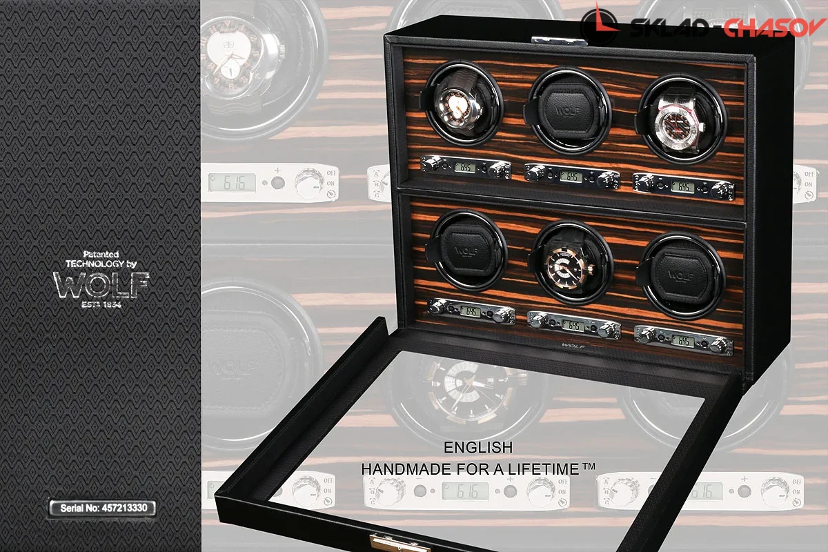 Шкатулка от известного английского и старинного бренда "Wolf design" не оставит равнодушным презентабельных и успешных людей, так как выполнена в ручную лучшими мастерами. Корпус из черной кожи, внутри отделка деревом "макасар" - ценных пород. Подзавод шести часов любой сложности, современный держатель для ваших любимых часов с фиксацией. Каждая шкатулка со своим серийным номером. Работает от сети, адаптер в комплекте. Регулируется 3 направления вращения при кол-ве оборотов от 300 до 1200 в сутки. Возможность фиксации на ключик. Отложенный старт механизма 10 секунд. Гарантия 18 мес. Фирменная подарочная чёрная коробка. Удобные фирменные держатели для часов. Логотип WOLF на лицевой стороне. Подзавод шести часов любой сложности.