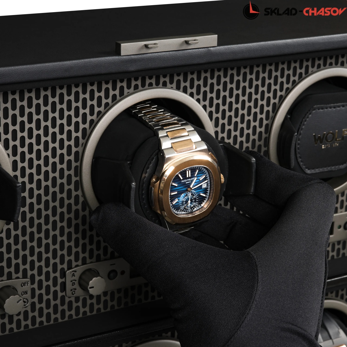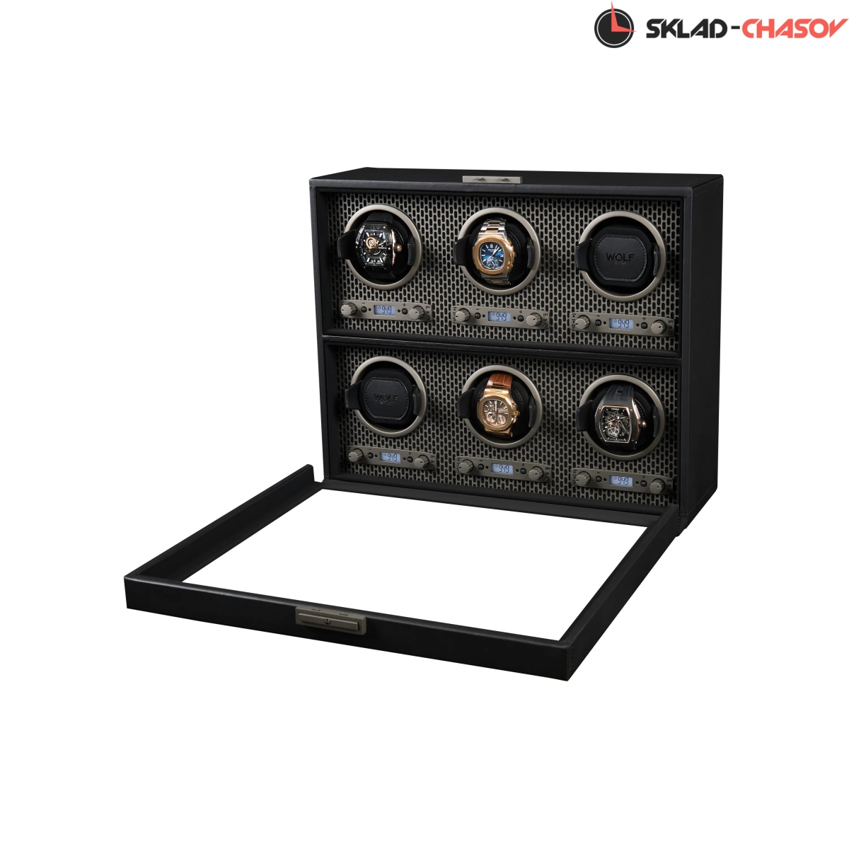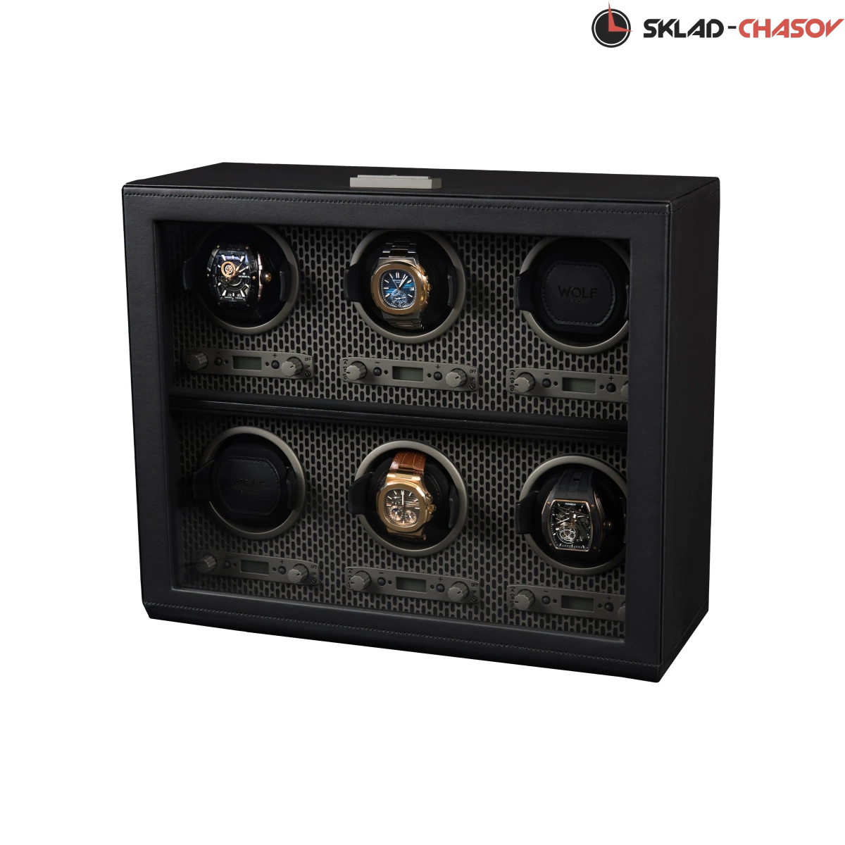 Коллекция Axis от самого известного английского бренда Wolf поражает воображение своим видом и используемыми материалами. Шкатулка создана для автоподзавода ваших часов в безопасности под металлическим ключиком. Экстерьер выполнен из мягкой и гладкой экологичной кожи высшего сорта, плавно переходящий в современный интерьер с использованием матовой перфорированной стали и необычайно мягкого велюра. Абсолютно каждый элемент фурнитуры покрыт порошковой краской. Через натуральное стекло можно созерцать коллекцию из 6-ти наручных часов. Продуманный комплект разноразмерных подушек подойдет для установки часов любого диаметра с любой длиной ремешка или браслета. Ретро дизайн системы подзавода неповторимо удобен для настройки. Матово-серыми тумблерами выбирается сторона вращения и включение / выключение подзавода. Резиновыми кнопками выбирается количество оборотов от 300 до 1200 в сутки. Важно отметить, что вся продукция премиального бренда Wolf изготавливается вручную с использованием экологически чистых материалов.