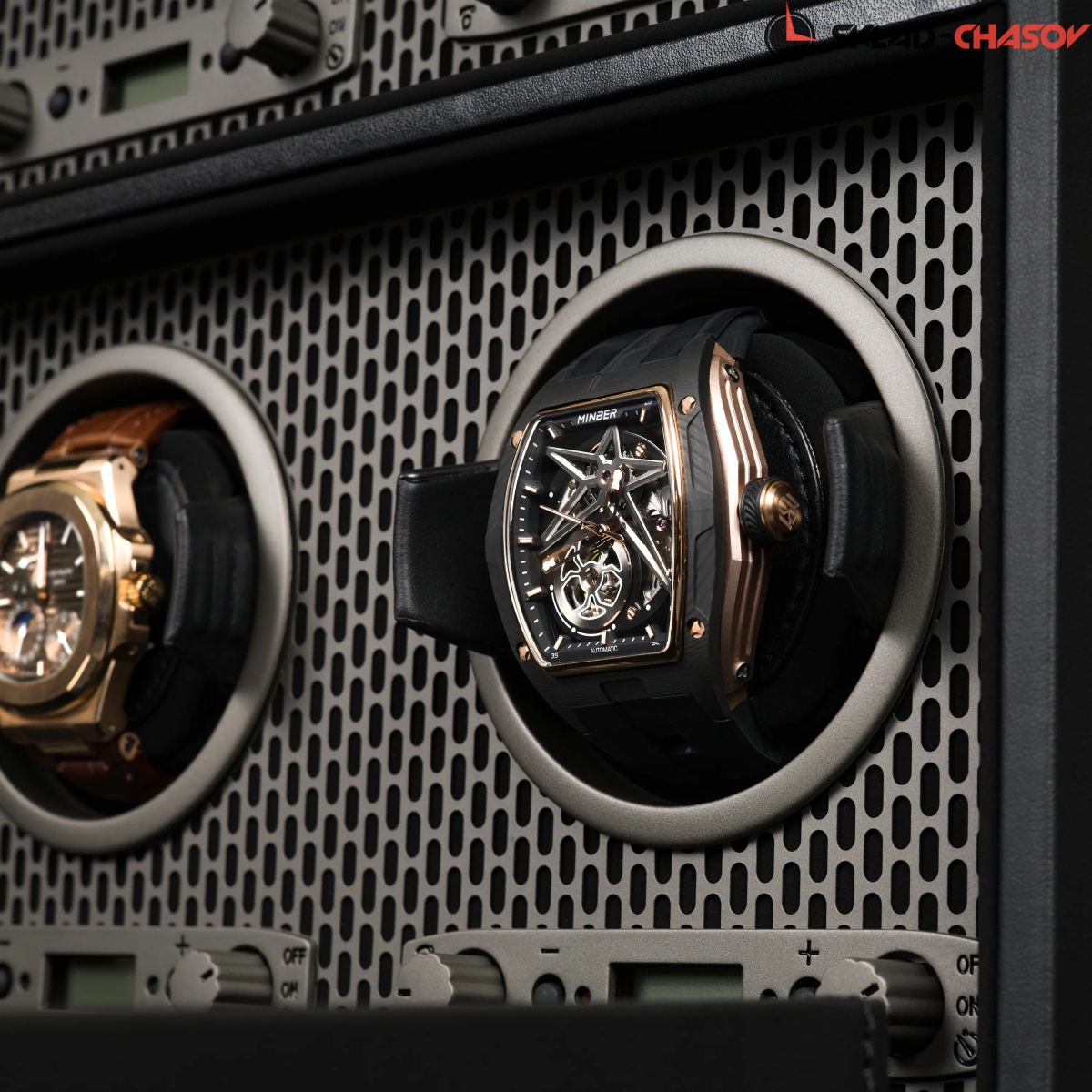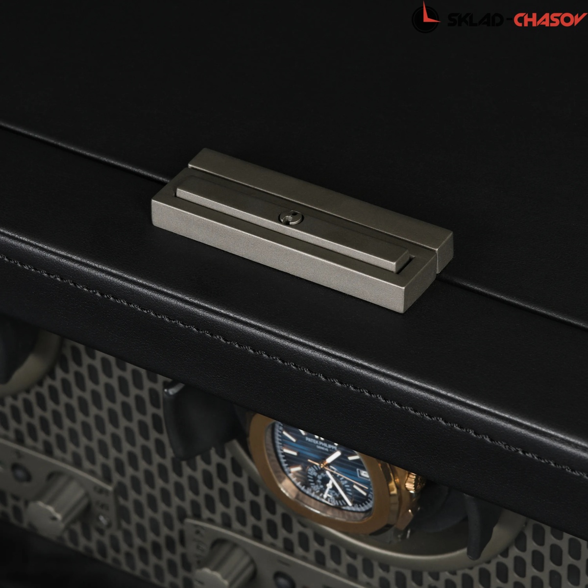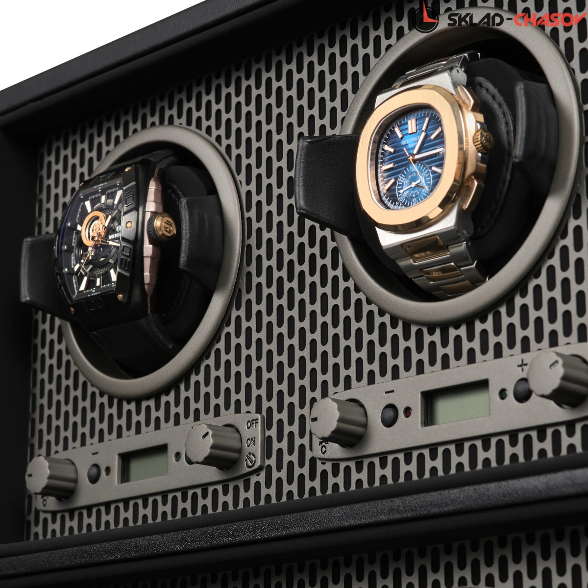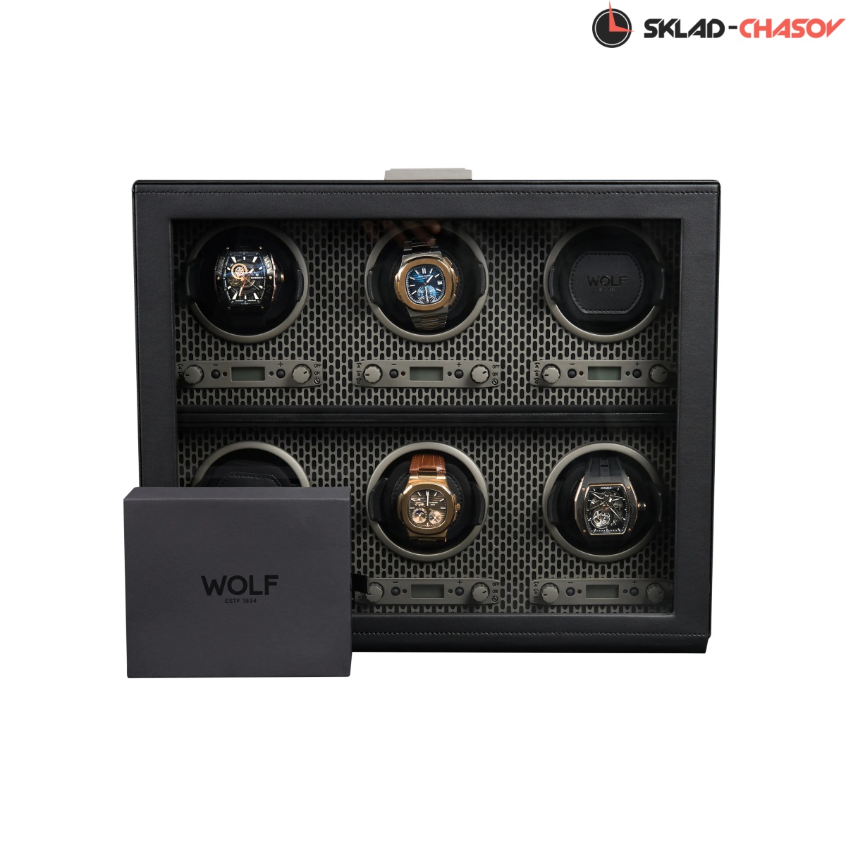 Коллекция Axis от самого известного английского бренда Wolf поражает воображение своим видом и используемыми материалами. Шкатулка создана для автоподзавода ваших часов в безопасности под металлическим ключиком. Экстерьер выполнен из мягкой и гладкой экологичной кожи высшего сорта, плавно переходящий в современный интерьер с использованием матовой перфорированной стали и необычайно мягкого велюра. Абсолютно каждый элемент фурнитуры покрыт порошковой краской. Через натуральное стекло можно созерцать коллекцию из 6-ти наручных часов. Продуманный комплект разноразмерных подушек подойдет для установки часов любого диаметра с любой длиной ремешка или браслета. Ретро дизайн системы подзавода неповторимо удобен для настройки. Матово-серыми тумблерами выбирается сторона вращения и включение / выключение подзавода. Резиновыми кнопками выбирается количество оборотов от 300 до 1200 в сутки. Важно отметить, что вся продукция премиального бренда Wolf изготавливается вручную с использованием экологически чистых материалов.